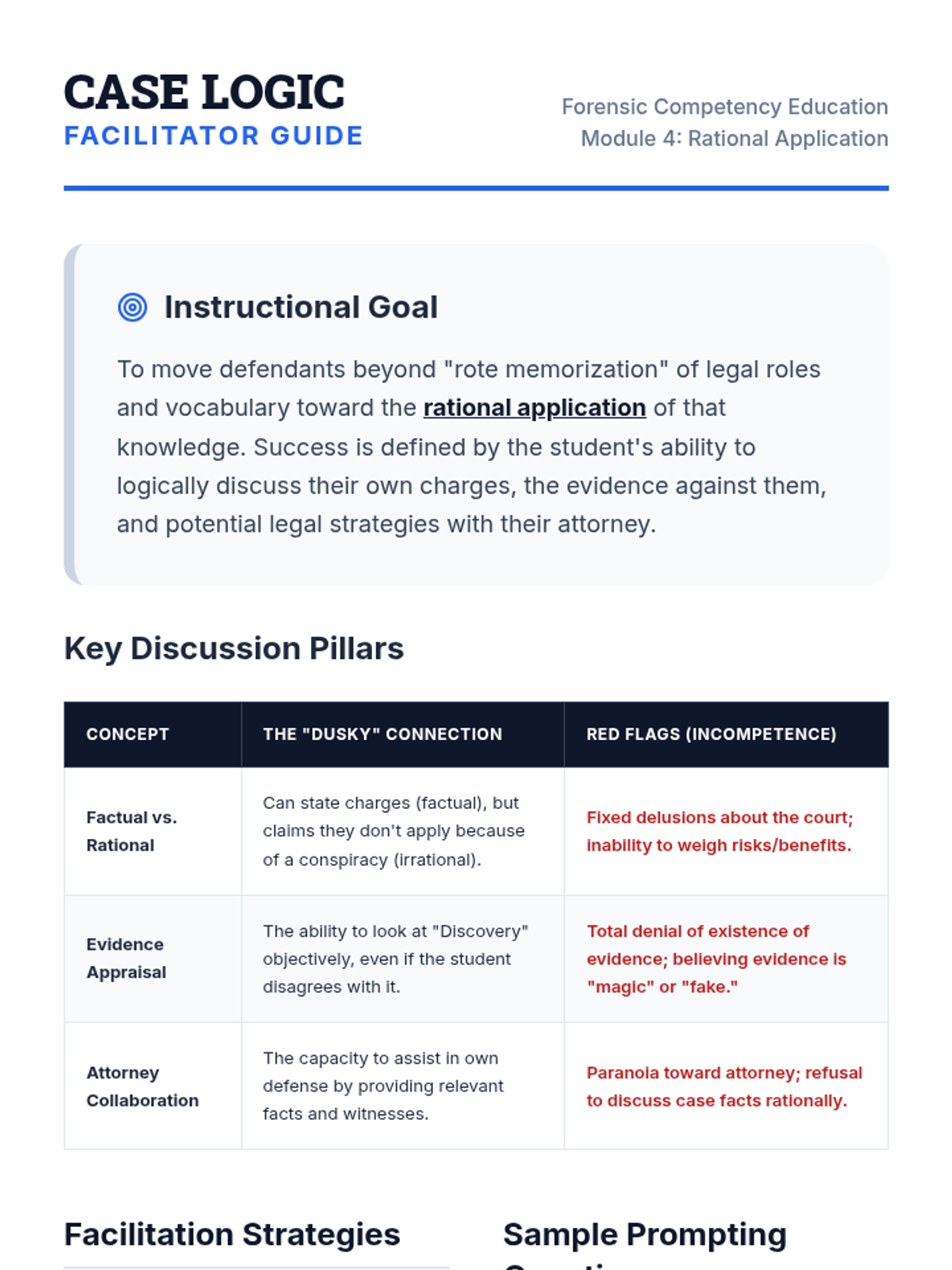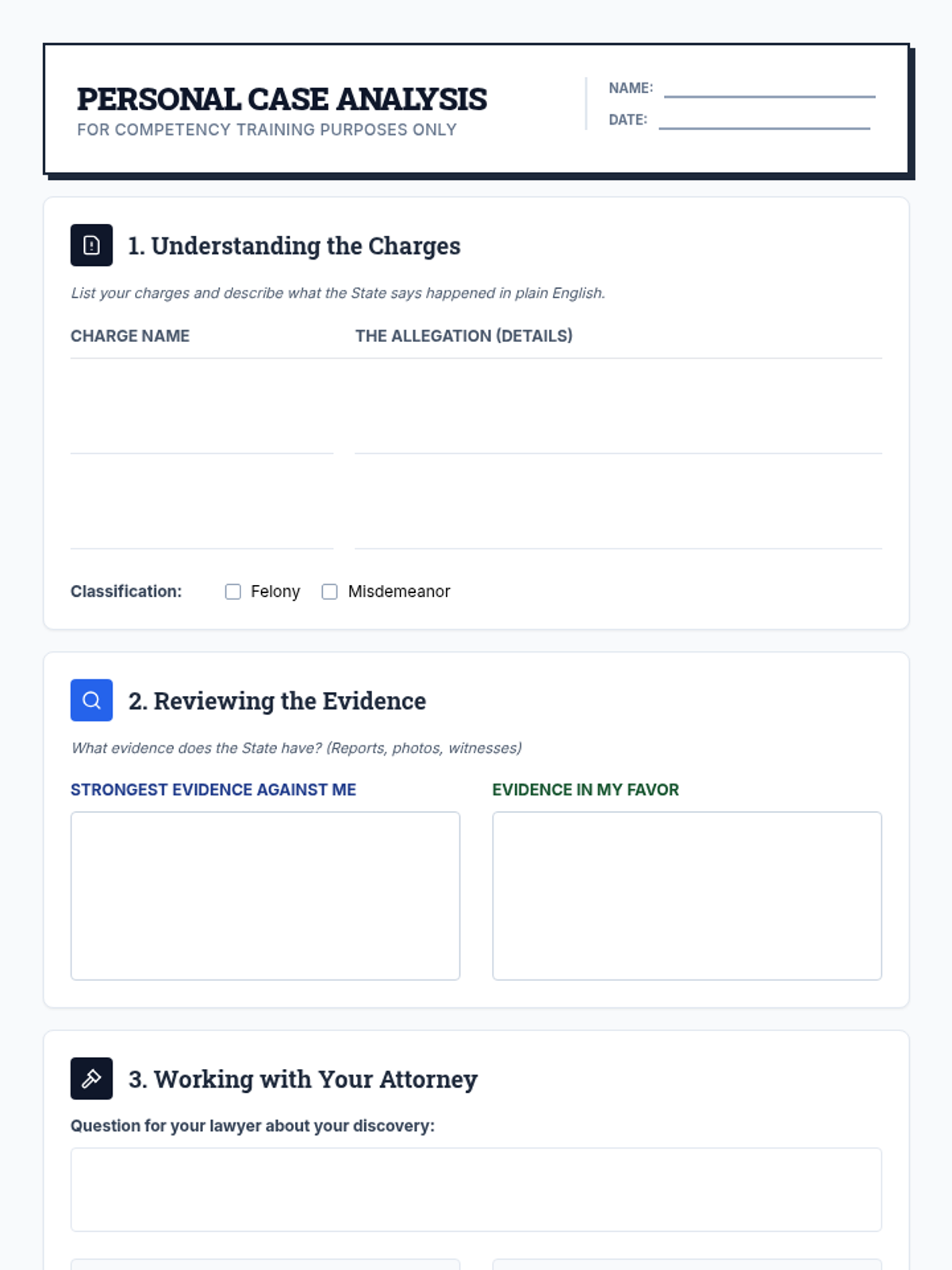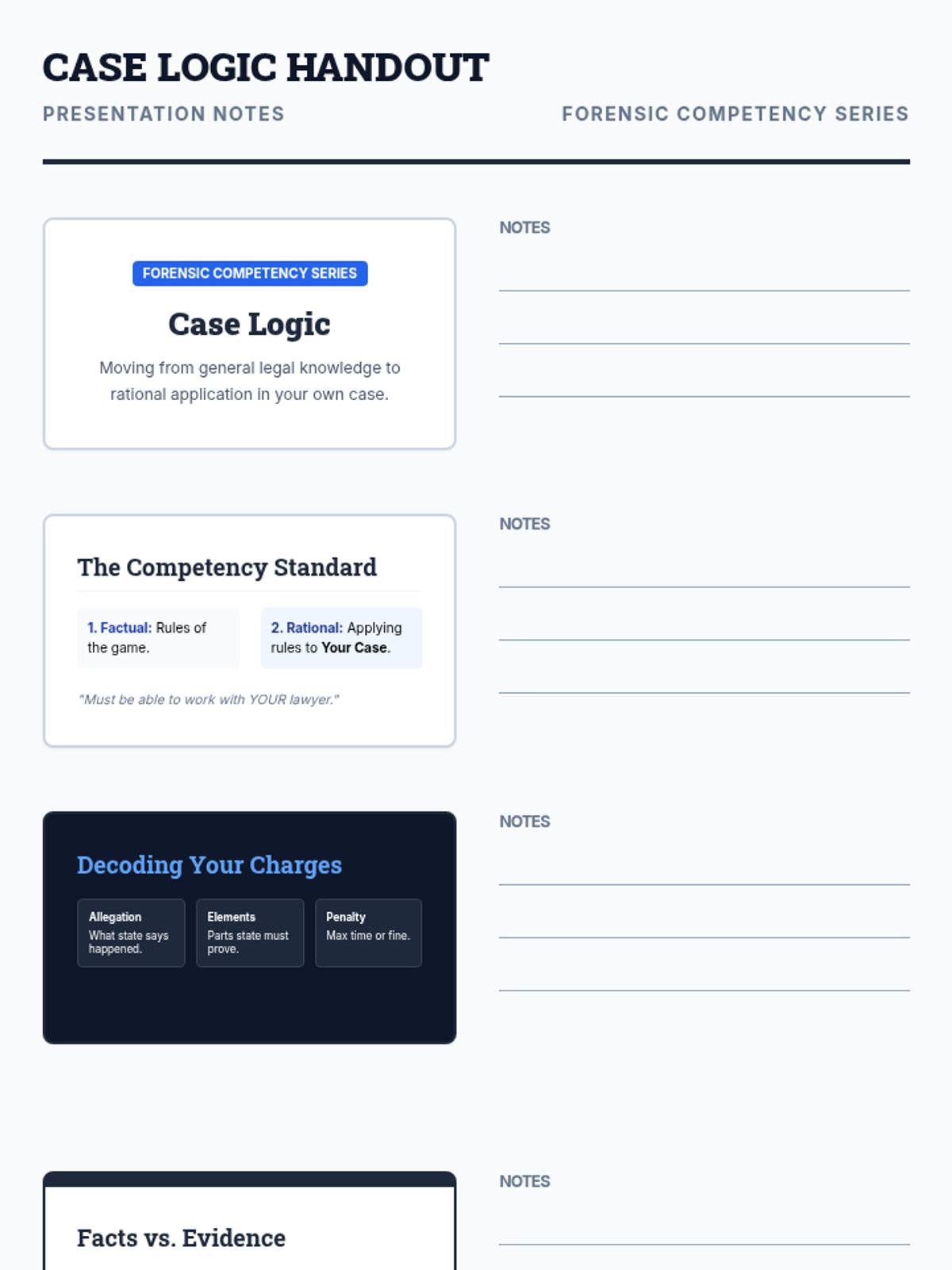 A focused lesson on helping defendants transition from general legal knowledge to rationally applying that information to their specific legal situation. It includes a presentation for group instruction and a structured worksheet for personalized case analysis.