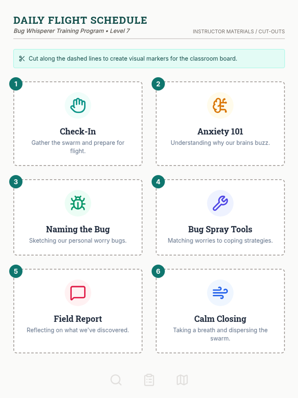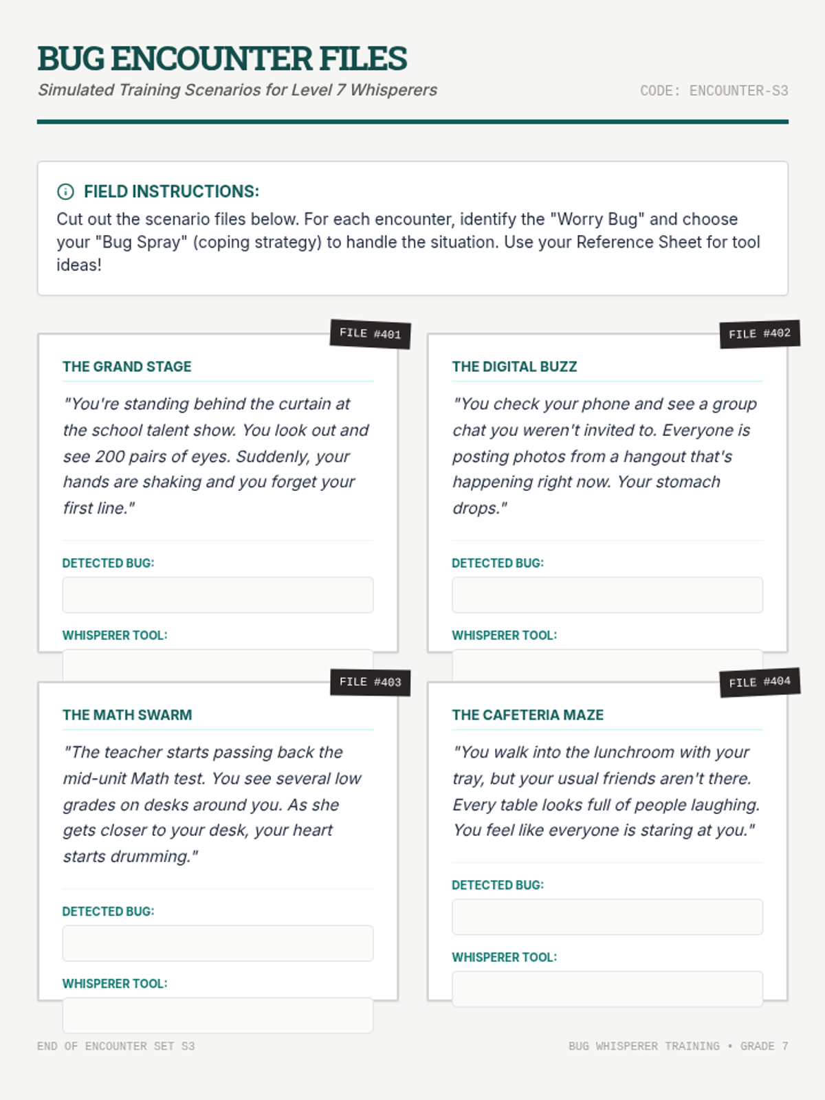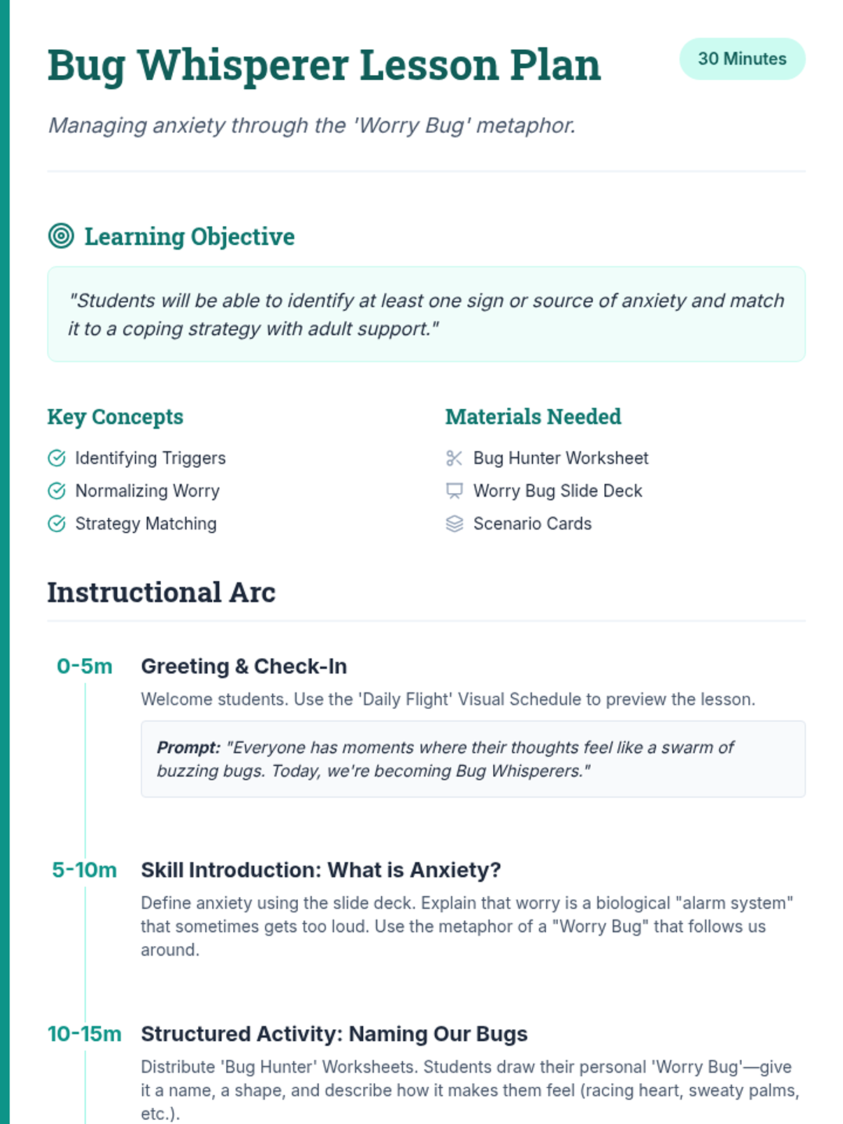 A 30-minute social-emotional learning lesson for 7th graders to identify anxiety triggers and coping strategies using the 'Worry Bug' metaphor through a field-journal lens.