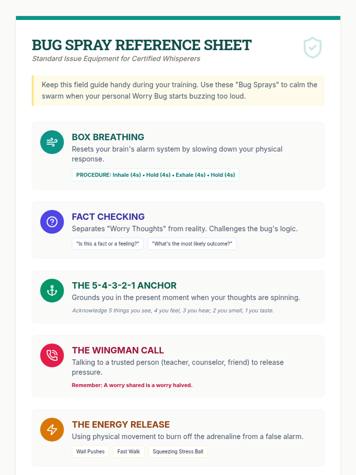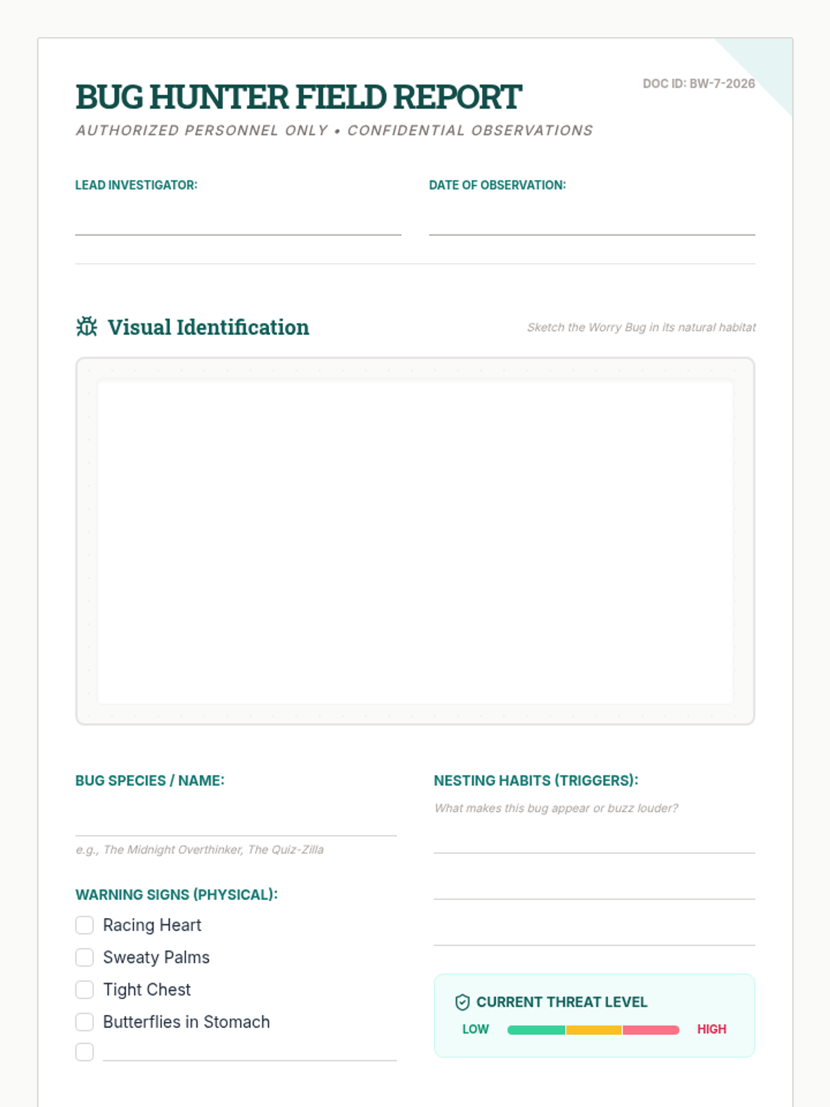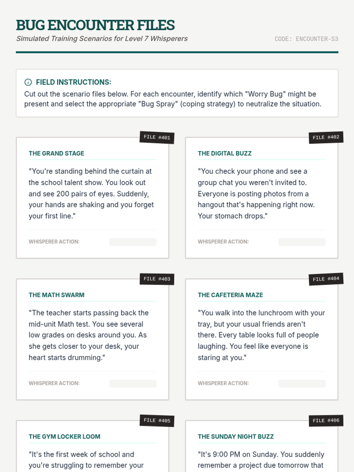 A 30-minute social-emotional learning lesson for 7th graders to identify anxiety triggers and coping strategies using the 'Worry Bug' metaphor through a field-journal lens.