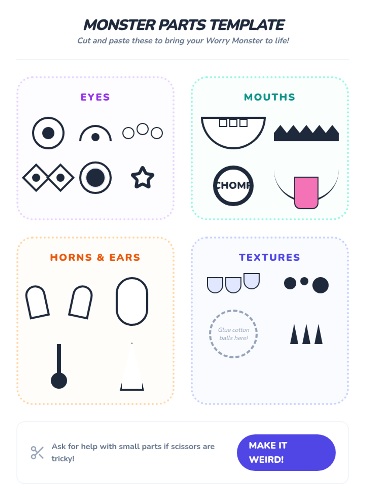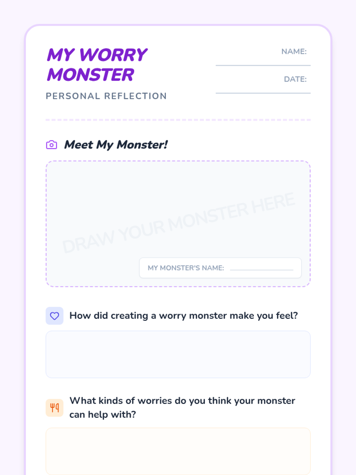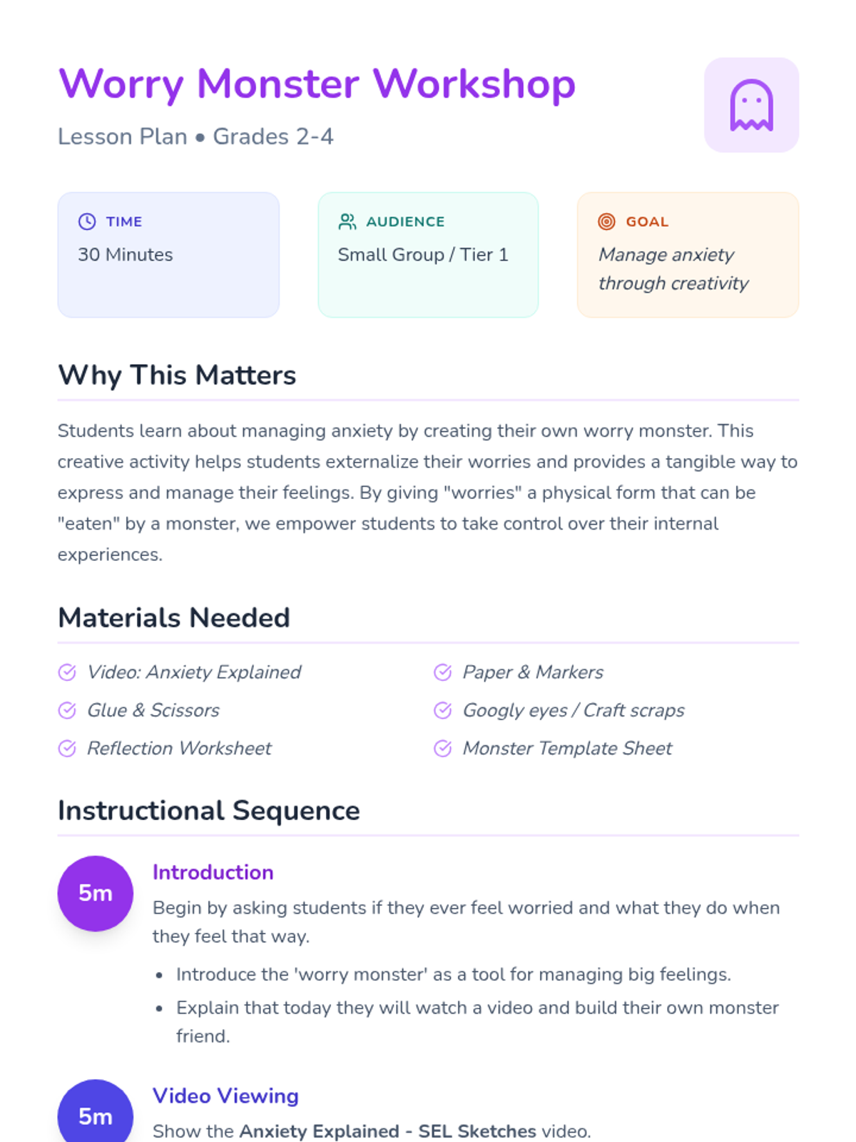 A creative SEL lesson where students externalize their anxieties by building a 'Worry Monster' to 'eat' their worries, featuring a video on anxiety and reflective discussion.