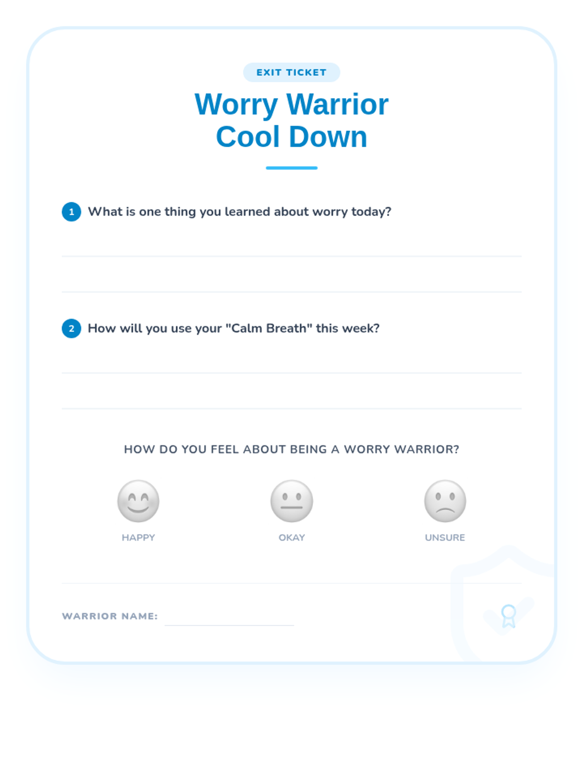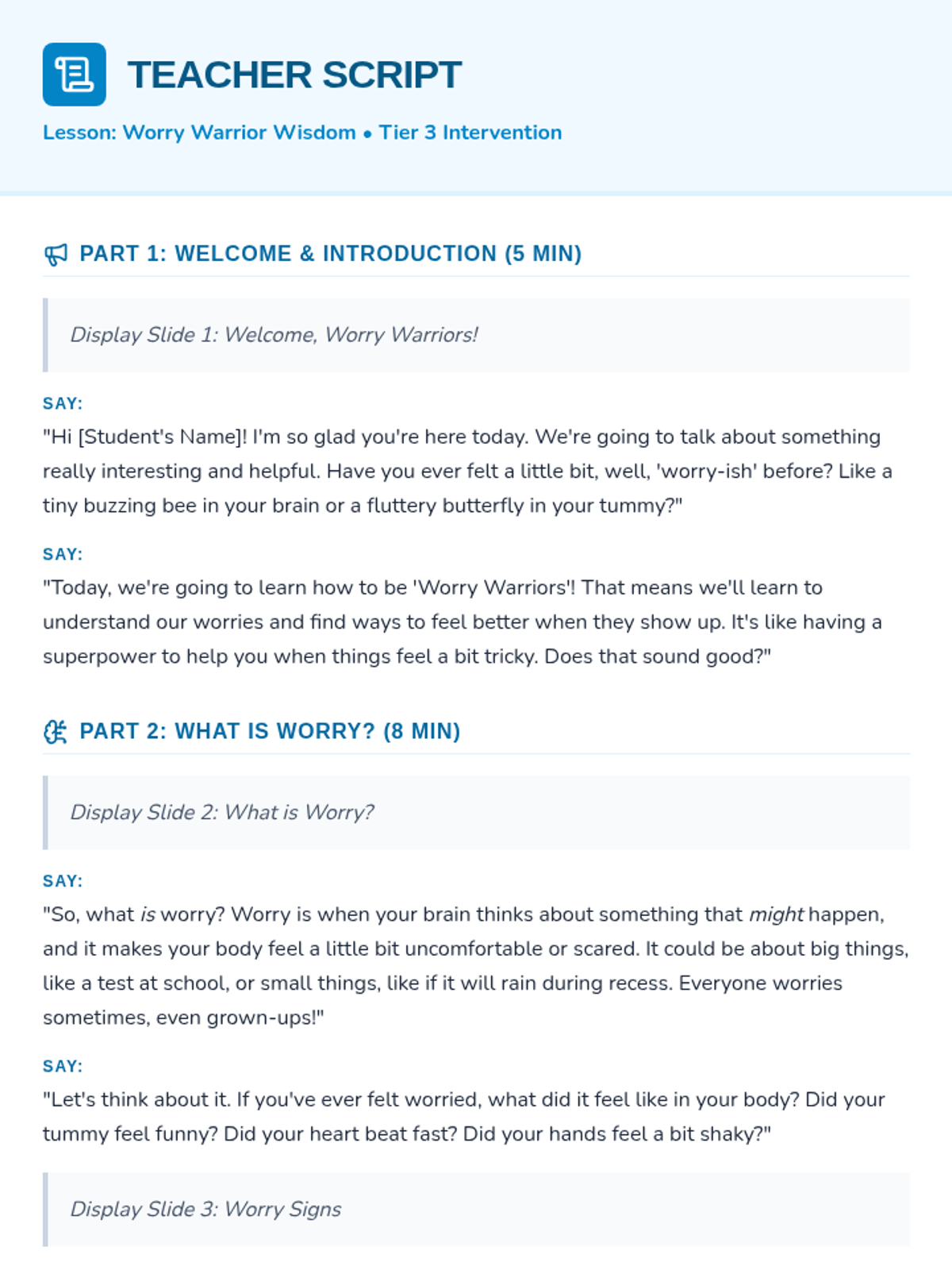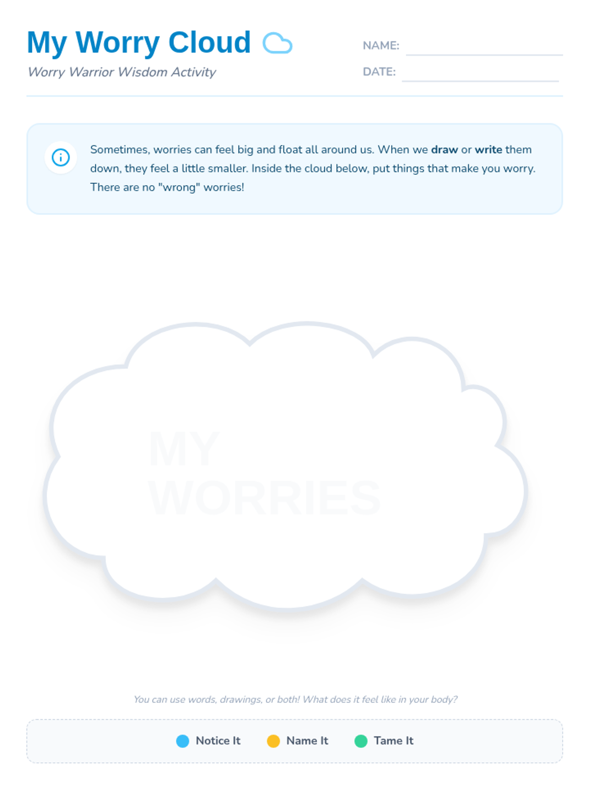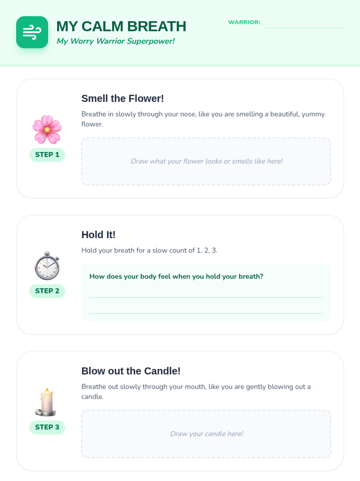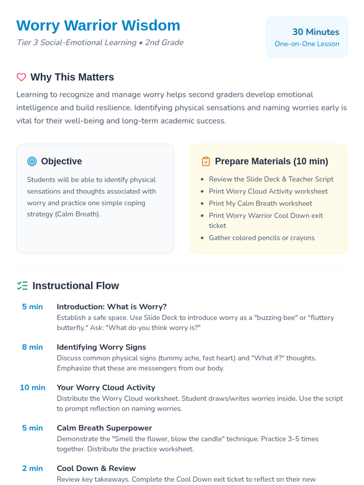 A 30-minute, one-on-one Tier 3 intervention for 2nd-grade students to identify worry sensations and learn the 'Calm Breath' coping strategy. Students create a worry cloud to externalize their fears and practice self-regulation techniques.
