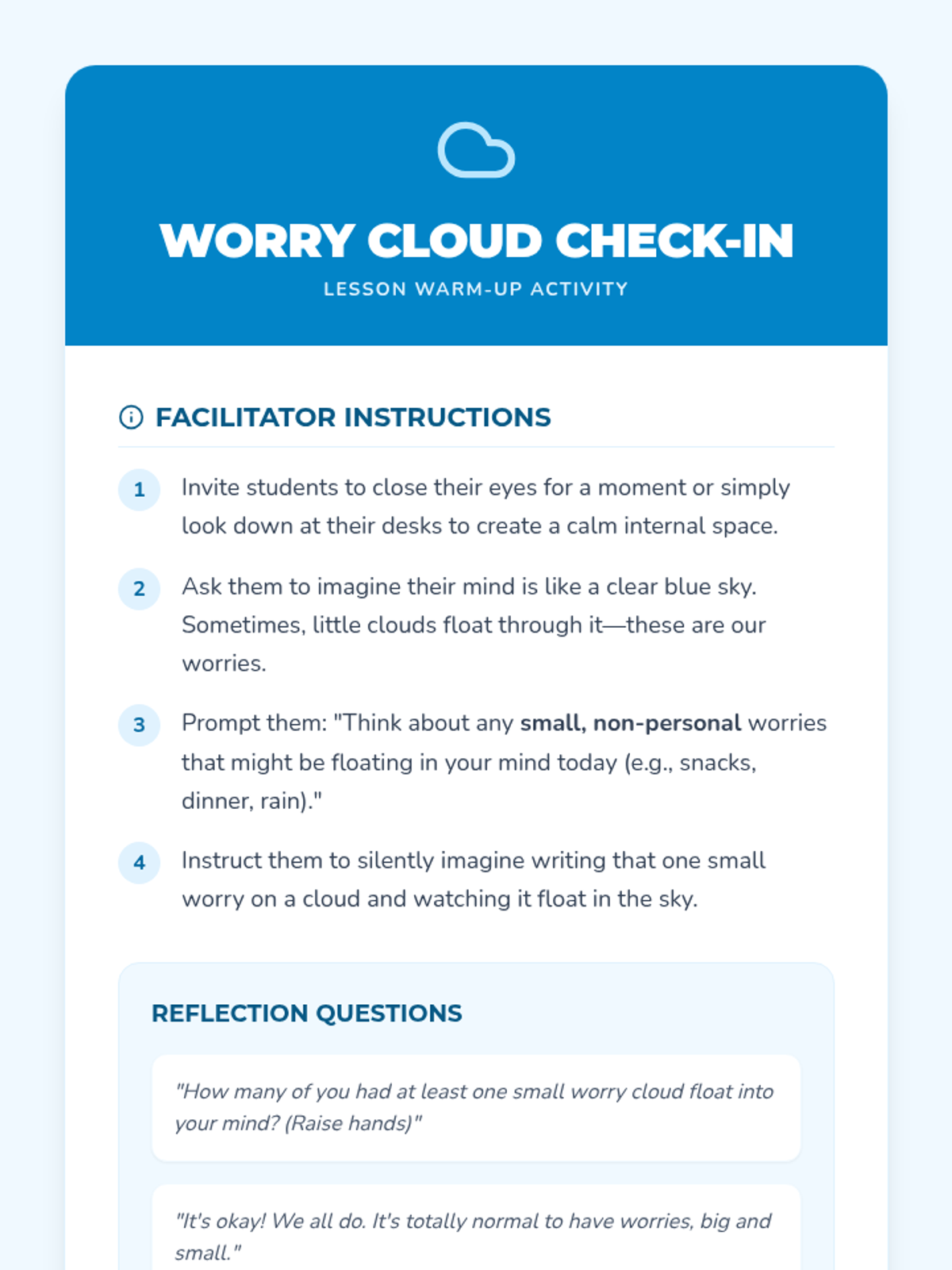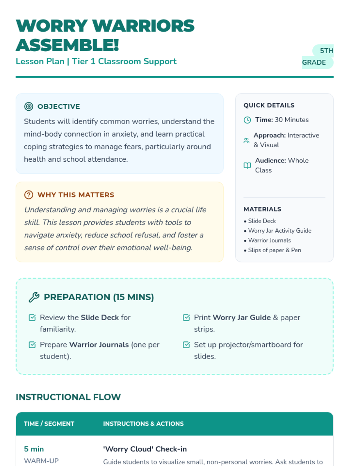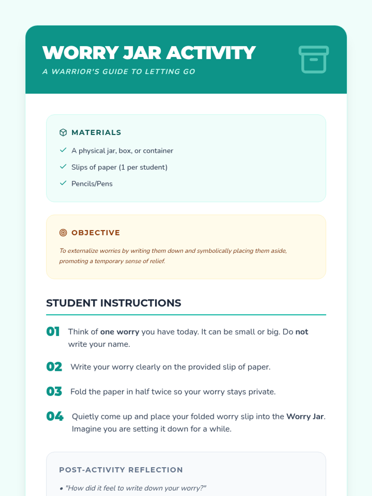A 30-minute classroom lesson for 5th graders to identify worries, understand the mind-body connection, and learn coping strategies through the 'Worry Jar' activity and personal reflection.