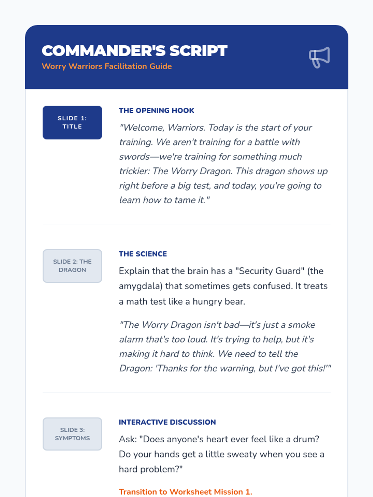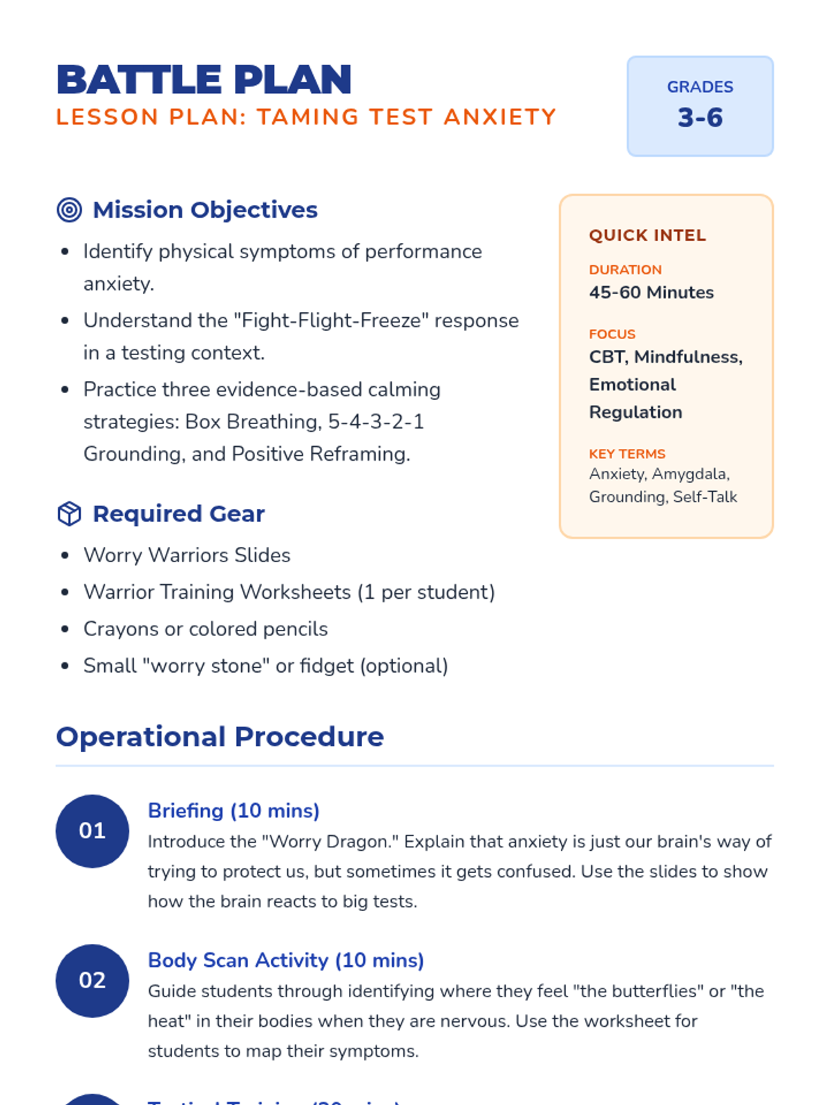 A cognitive-behavioral approach to managing test anxiety for students in grades 3-6, featuring physical stress identification and practical calming techniques.