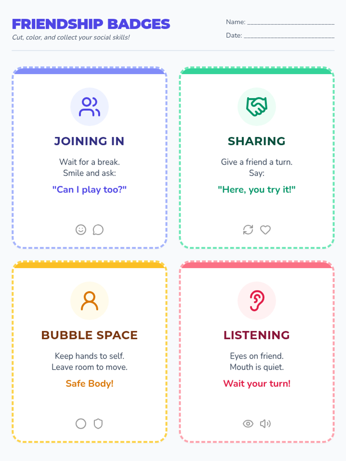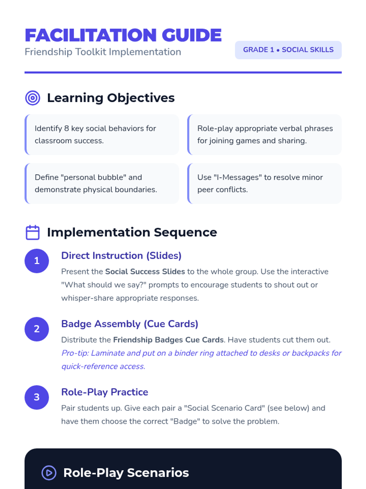 A collection of visual supports and instructional materials designed to help 1st grade students develop positive social habits and navigate peer interactions.