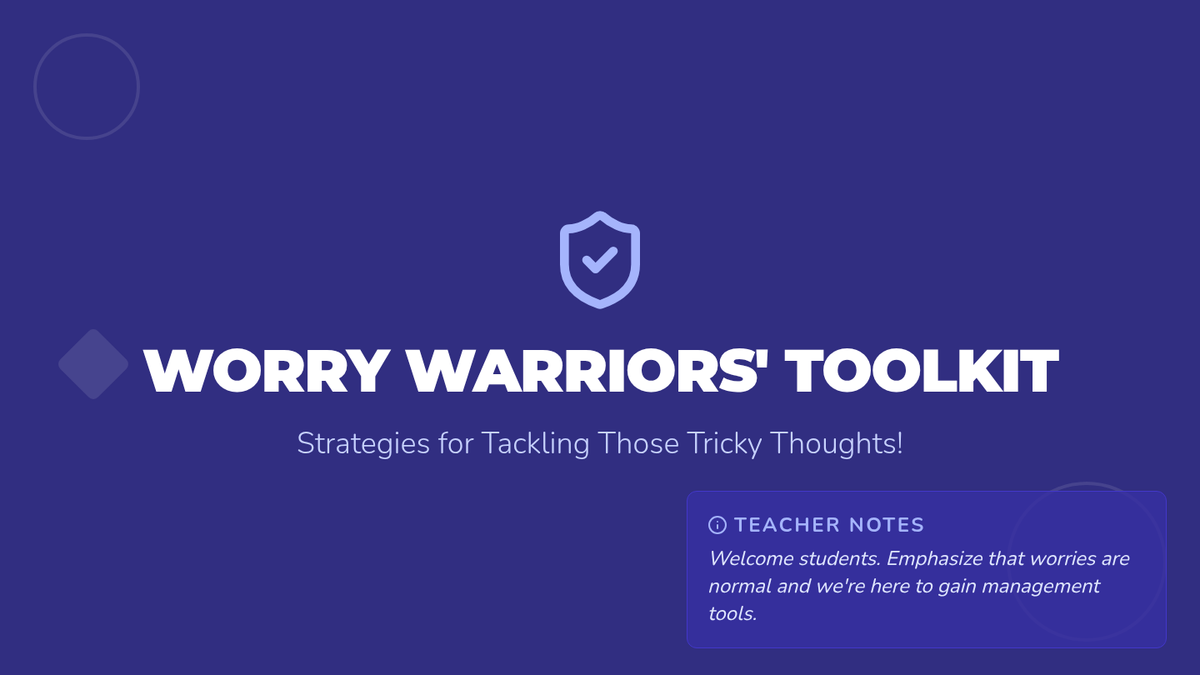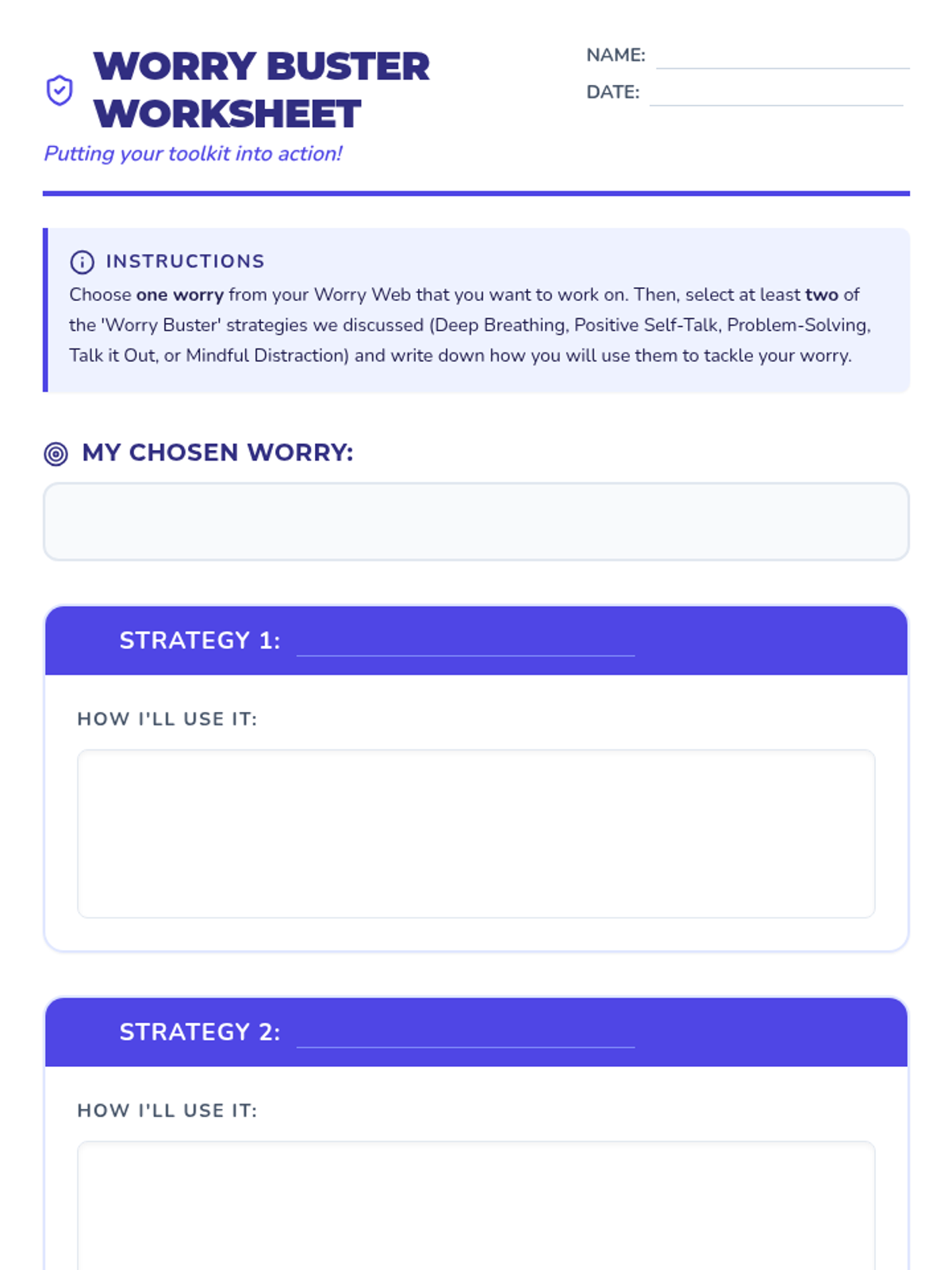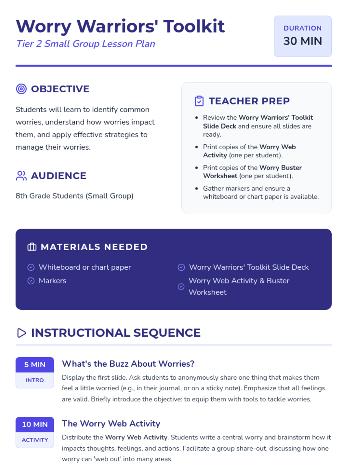 A 30-minute Tier 2 small group lesson for 8th graders to identify and manage worries using a toolkit of practical strategies. Students map out the impact of their worries and practice applying specific 'Worry Buster' techniques.
