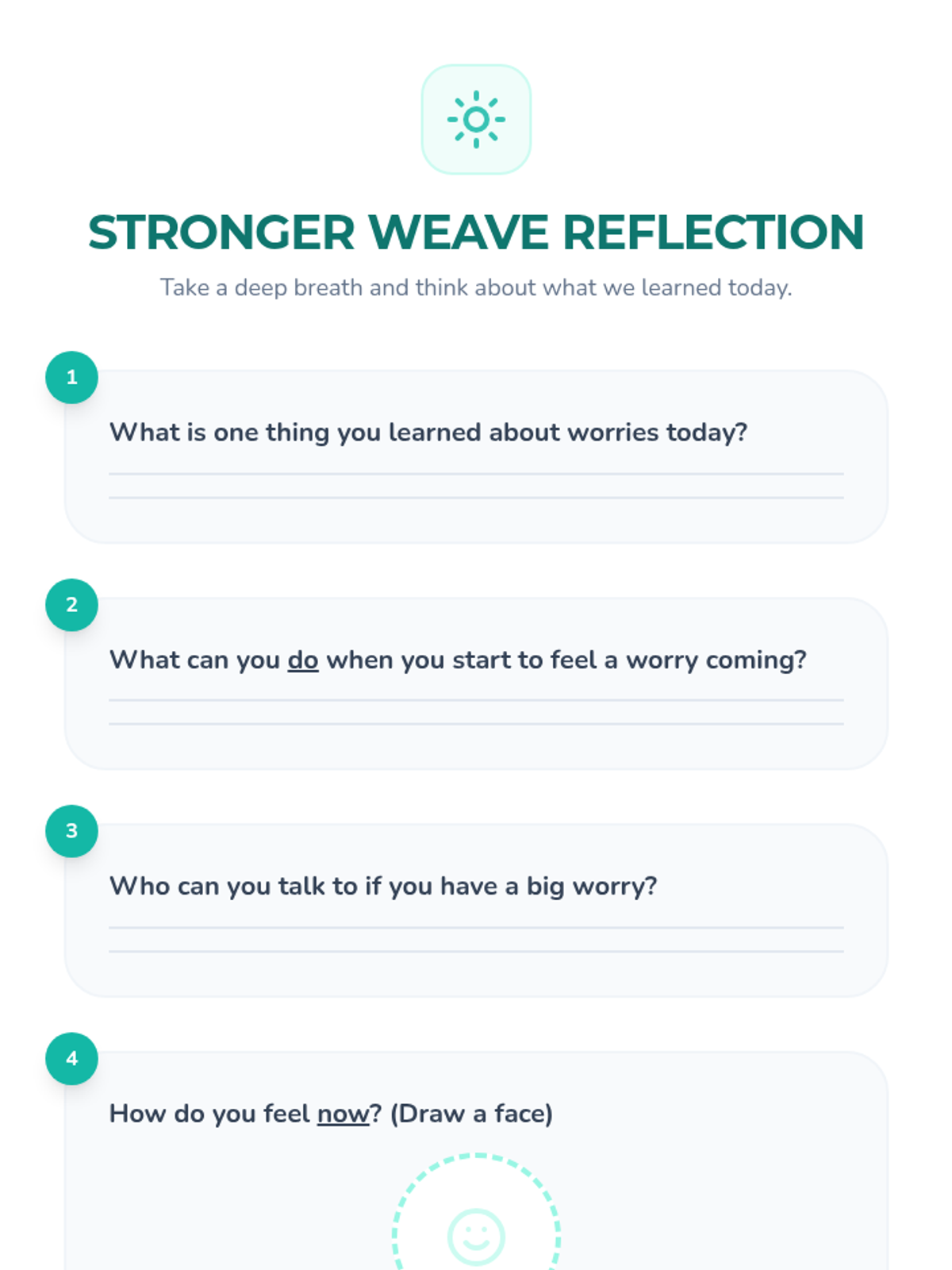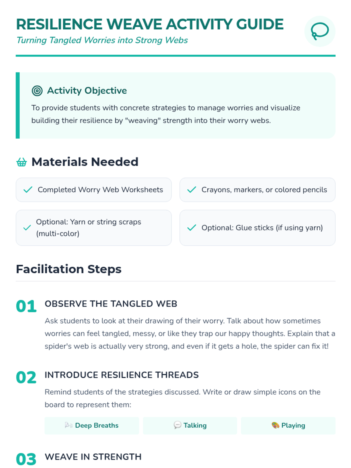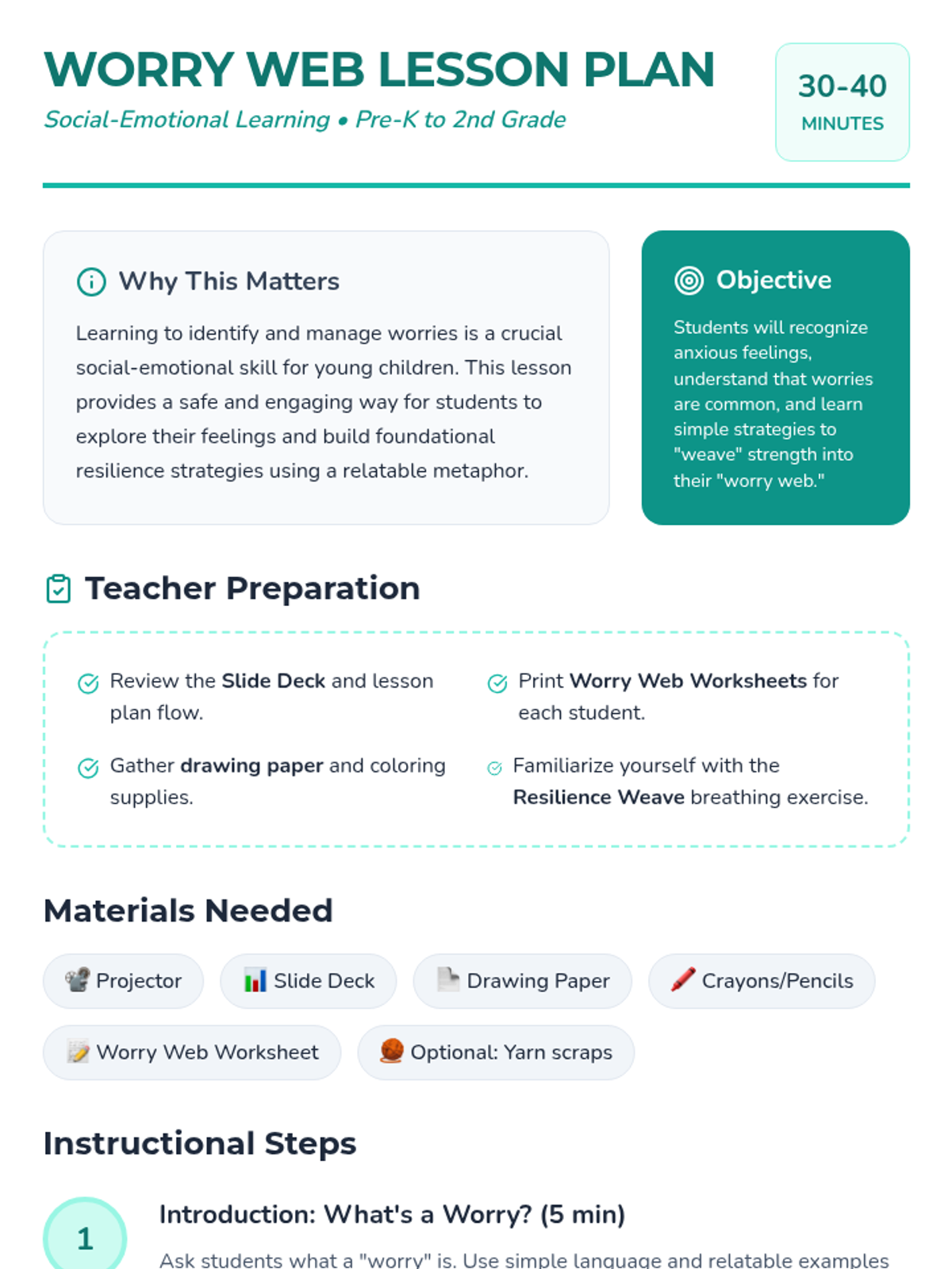 A social-emotional learning lesson for Pre-K to 2nd graders that uses the metaphor of a spider's web to identify worries and 'weave' in resilience strategies through storytelling, drawing, and breathing.