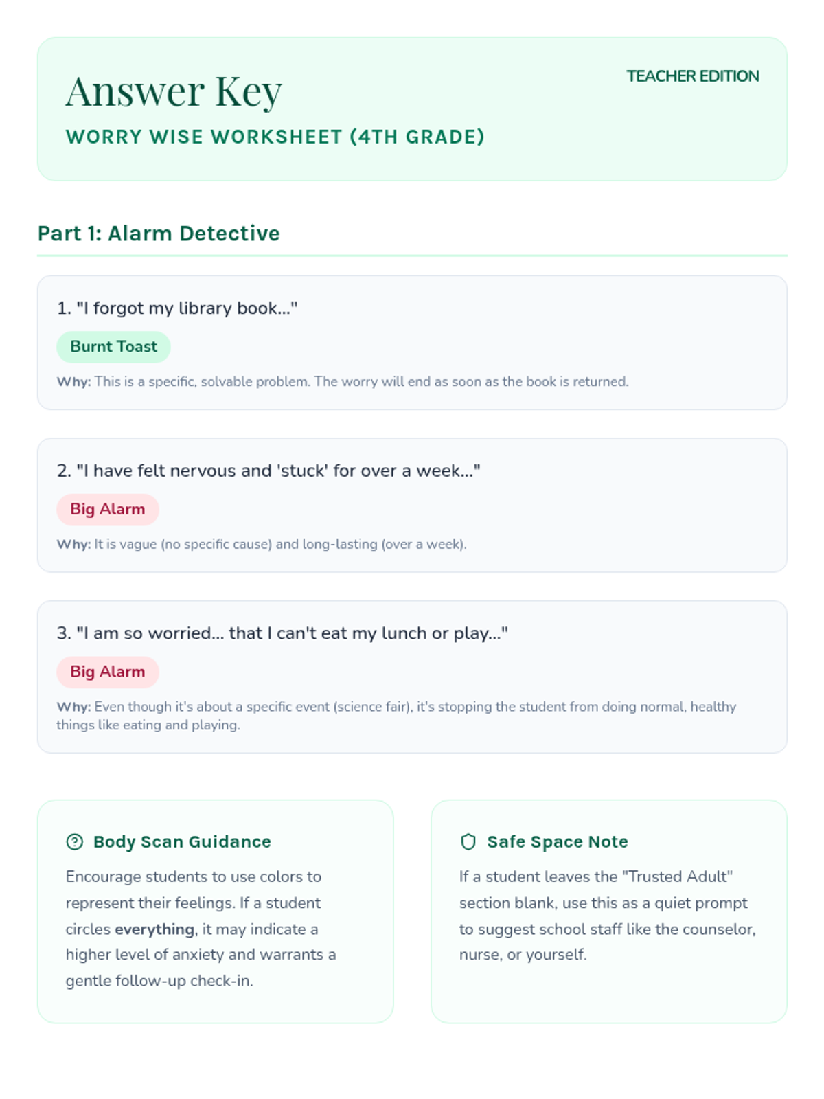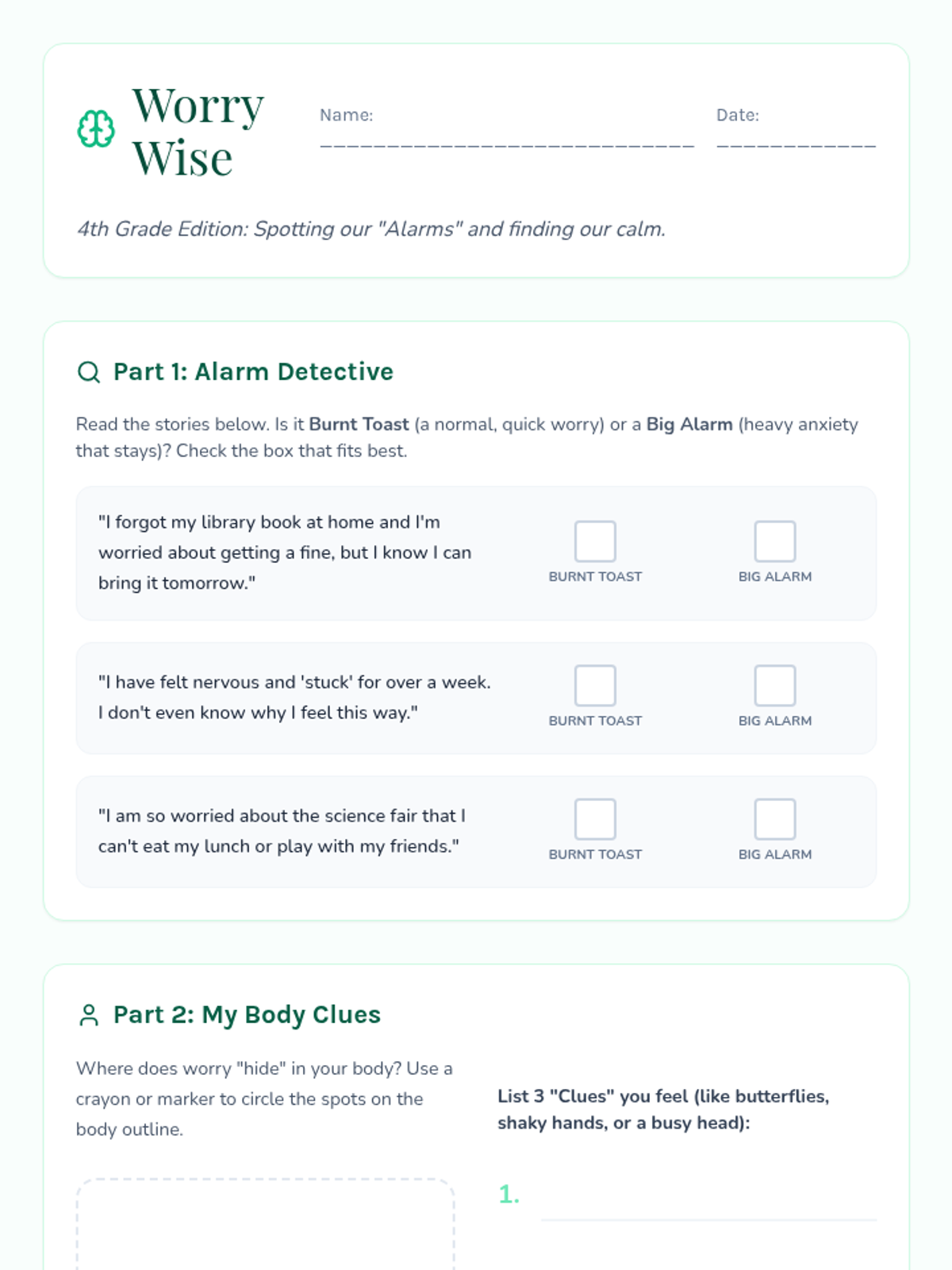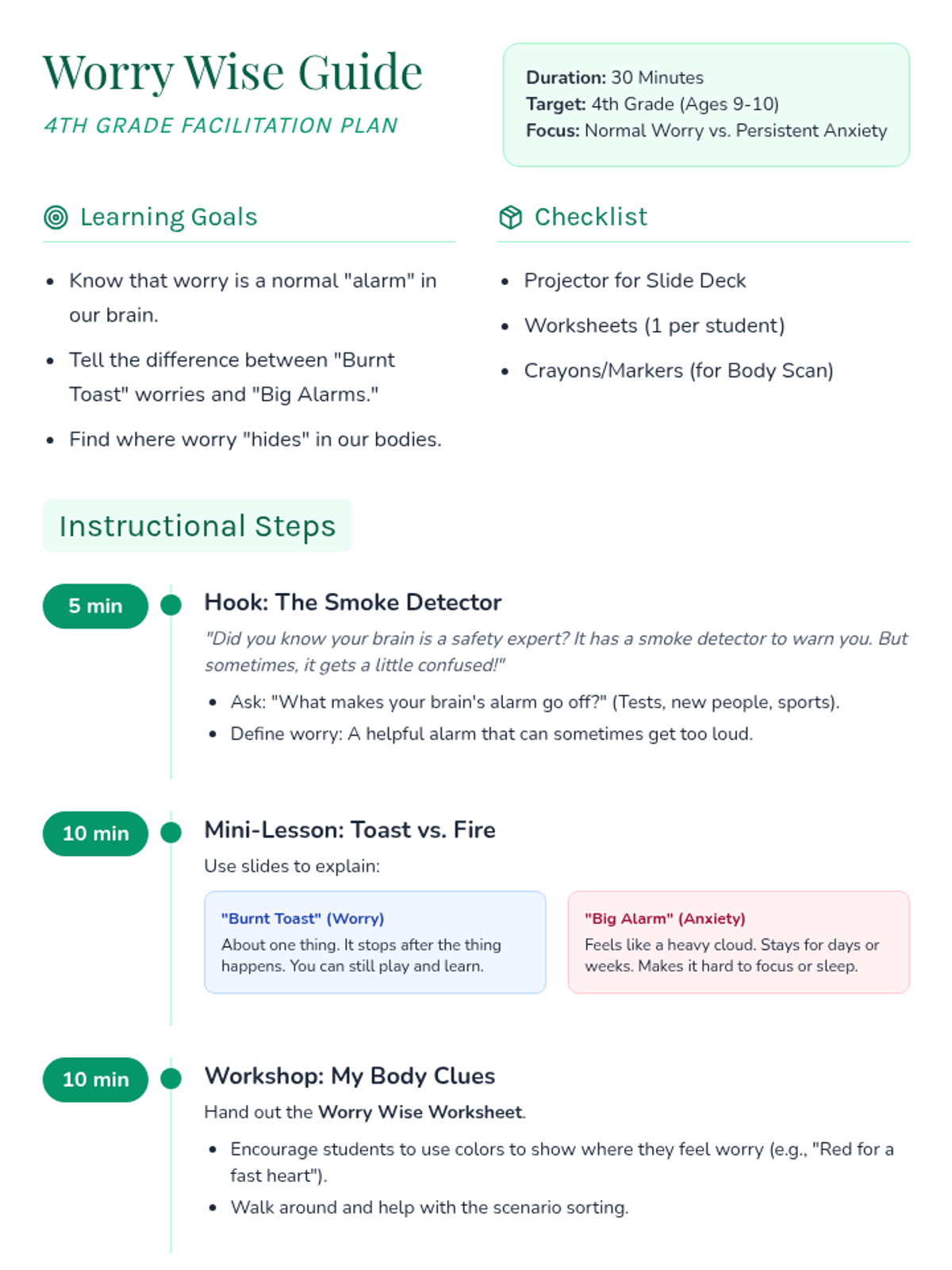 A 30-minute introductory lesson designed to help students distinguish between common, everyday worries and more persistent anxiety, featuring interactive discussions and coping strategy identification.