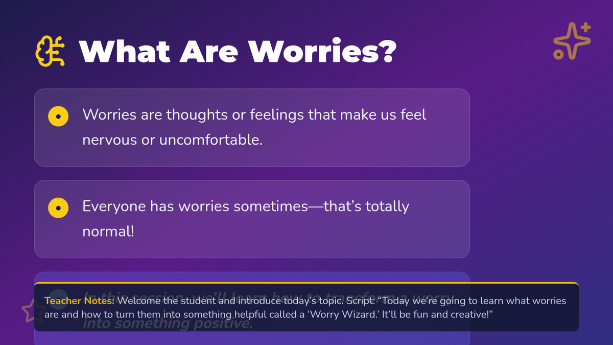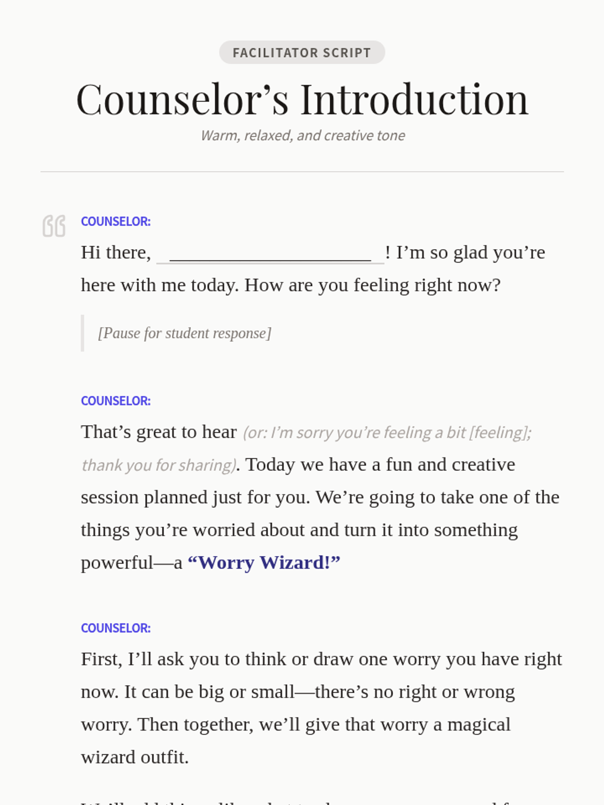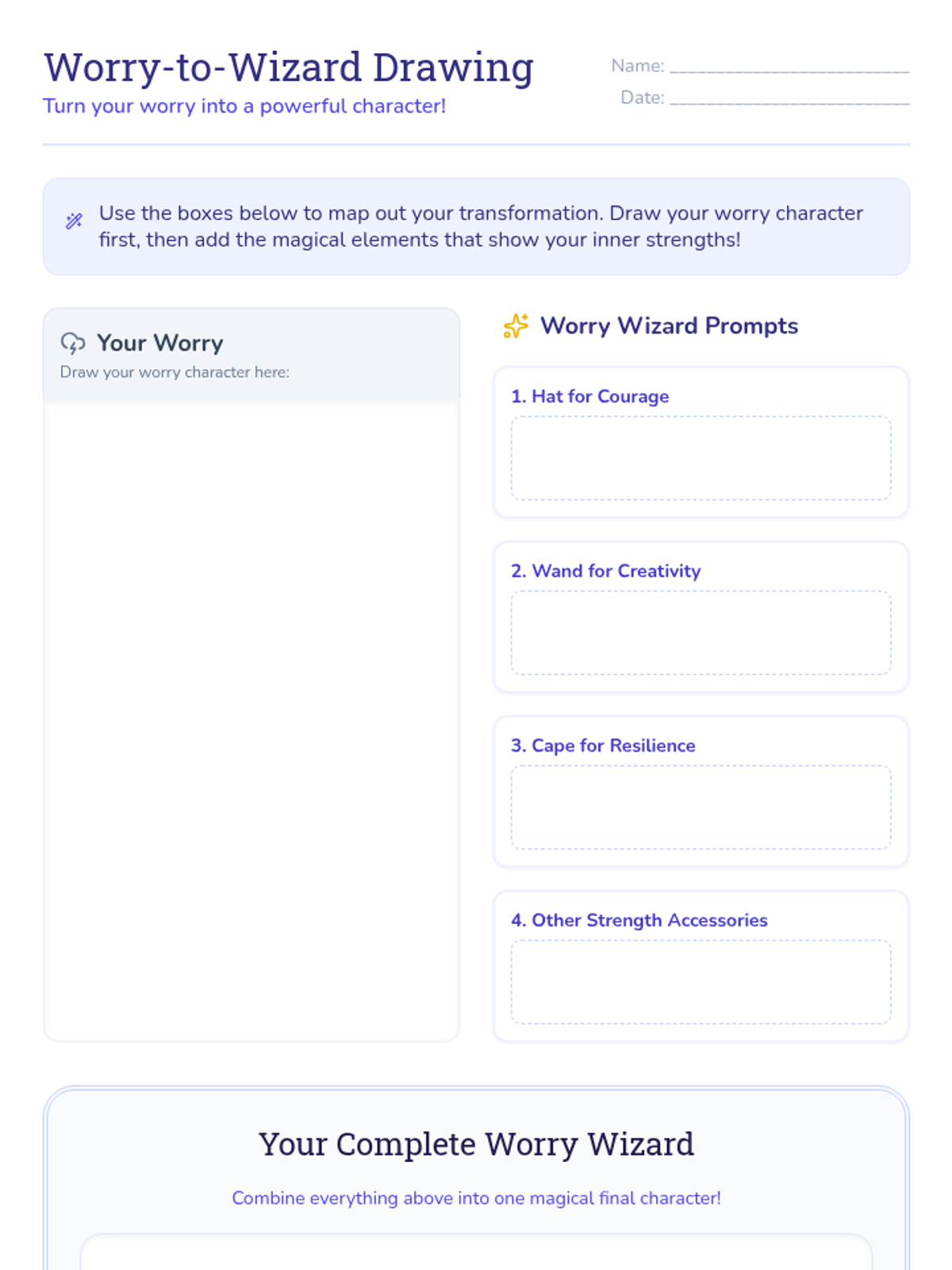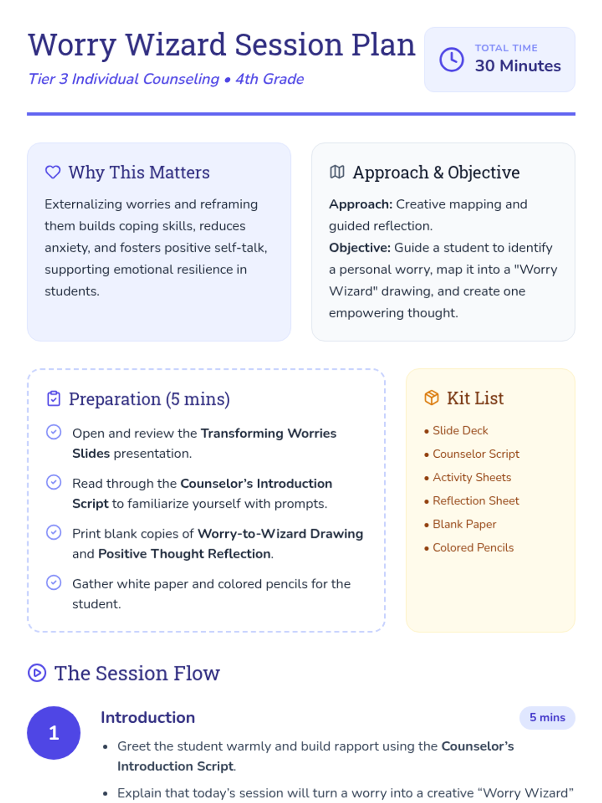 A whimsical Tier 3 counseling session for 4th graders to externalize worries by transforming them into "Worry Wizards" through creative mapping and positive self-talk.