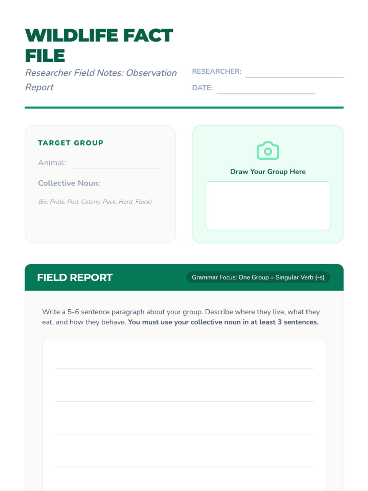 Students write a short report about a class, team, or herd of animals. The focus is on maintaining consistent singular agreement for collective nouns throughout the paragraph.