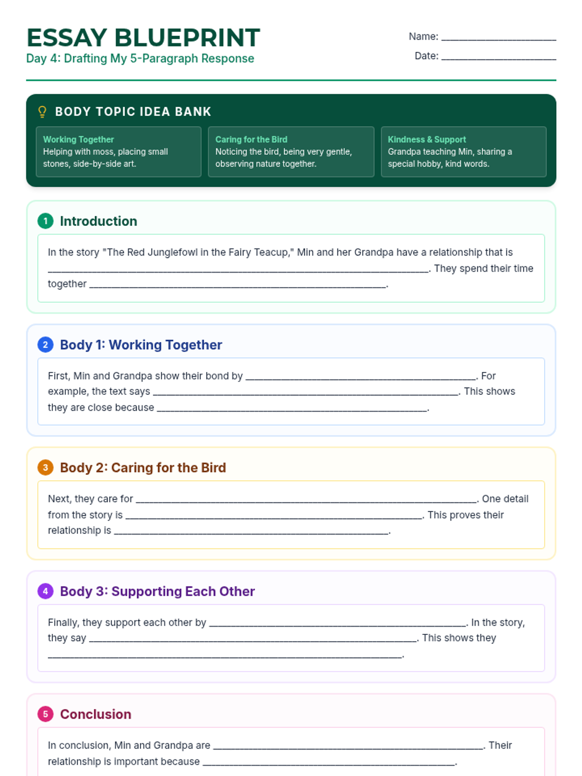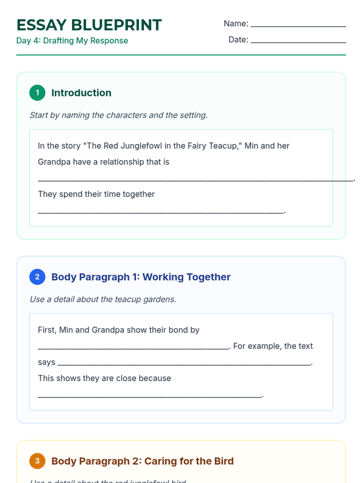 Using highly scaffolded sentence frames and an essay blueprint, students will draft their multi-paragraph response describing the relationship between Min and Grandpa.