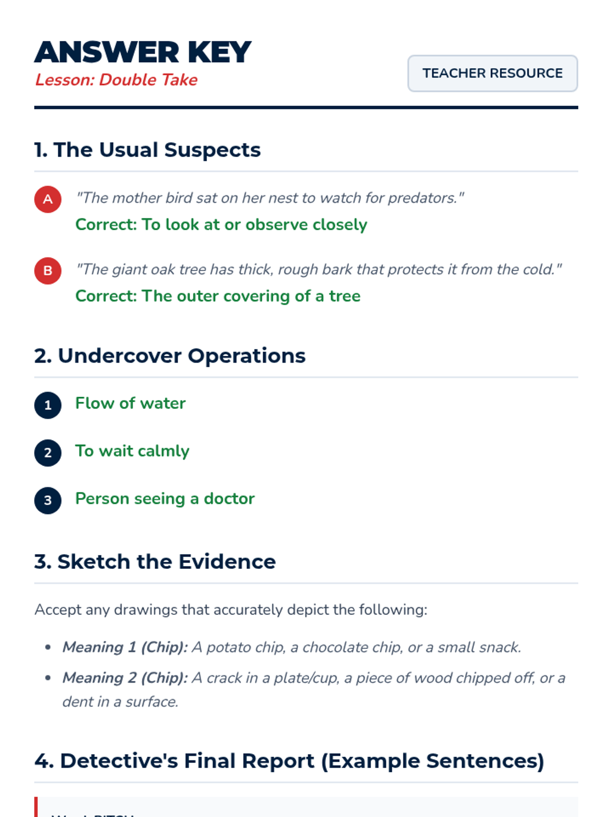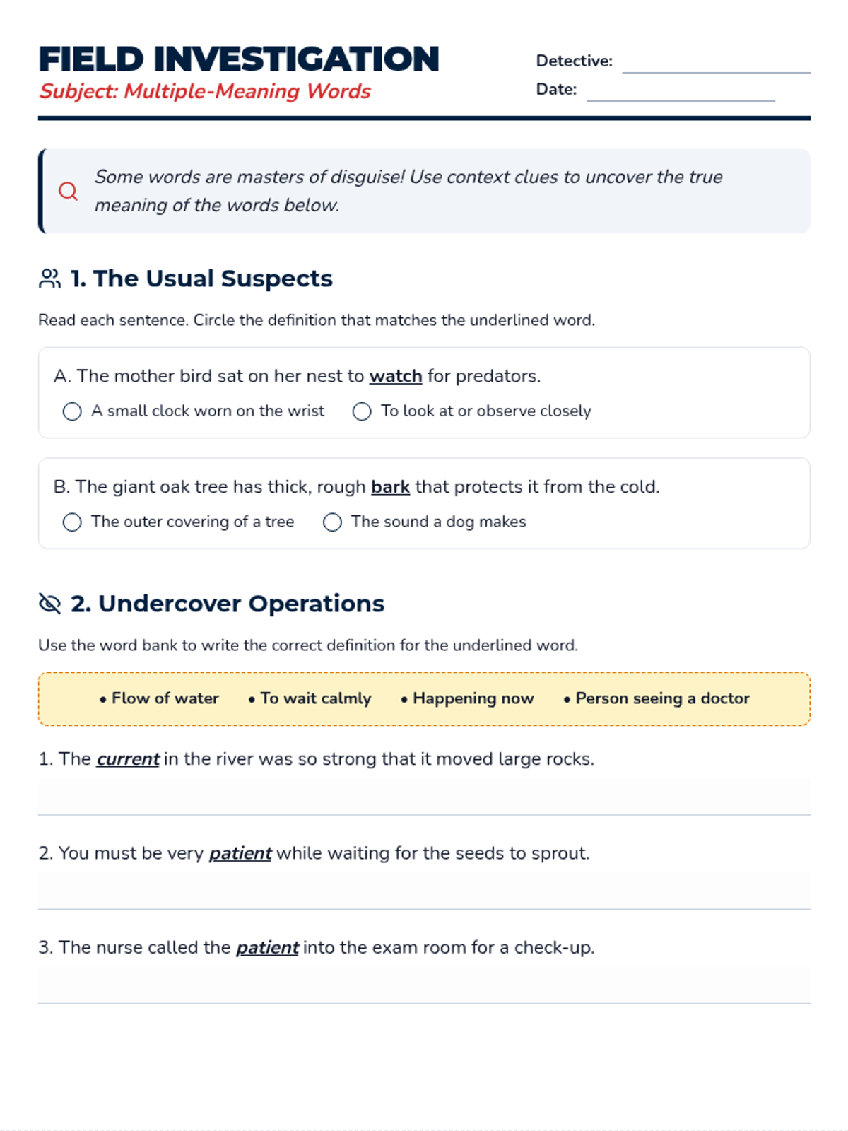An introductory lesson to multiple-meaning words using a detective theme to help students decode different definitions of the same word.