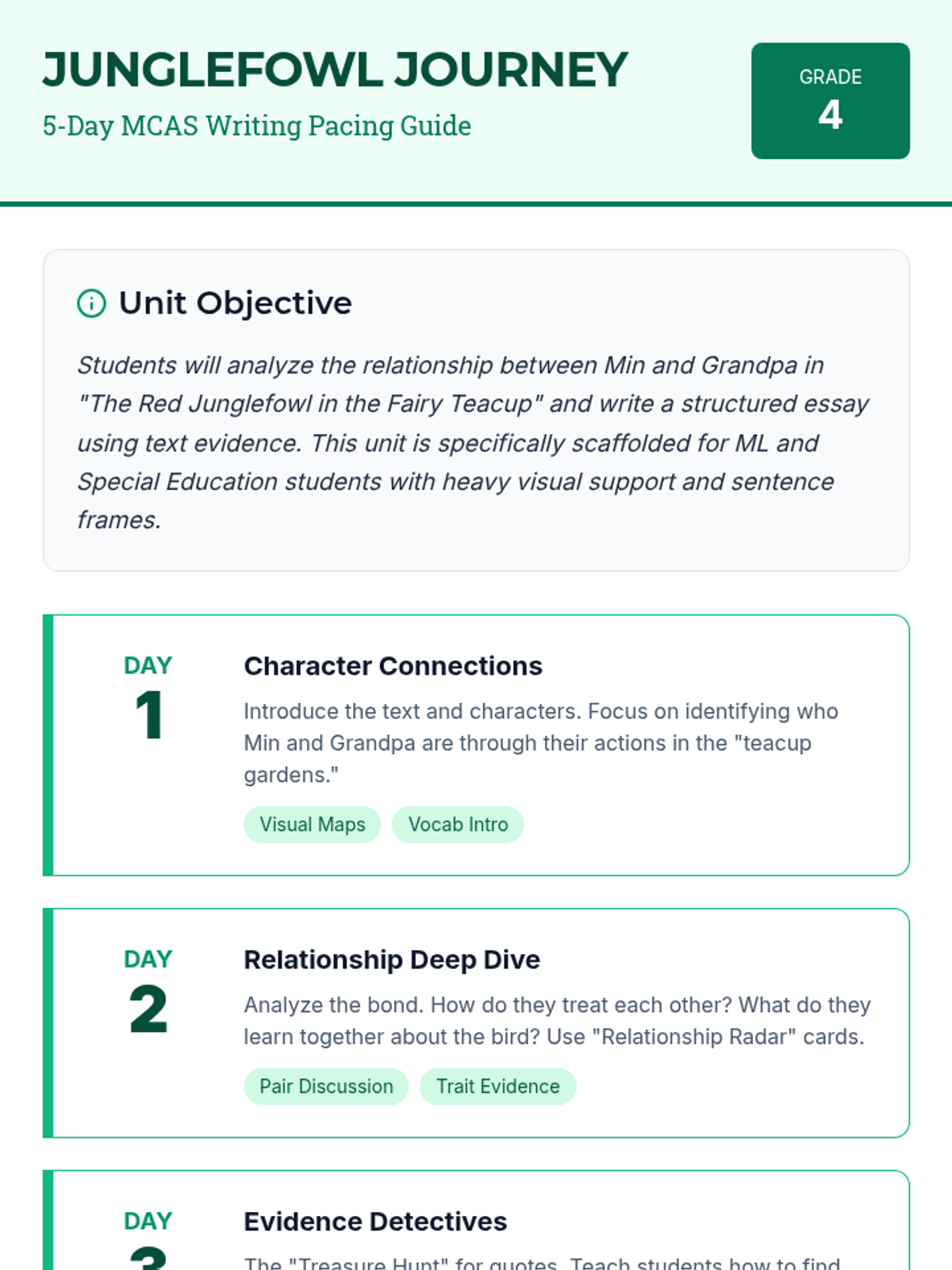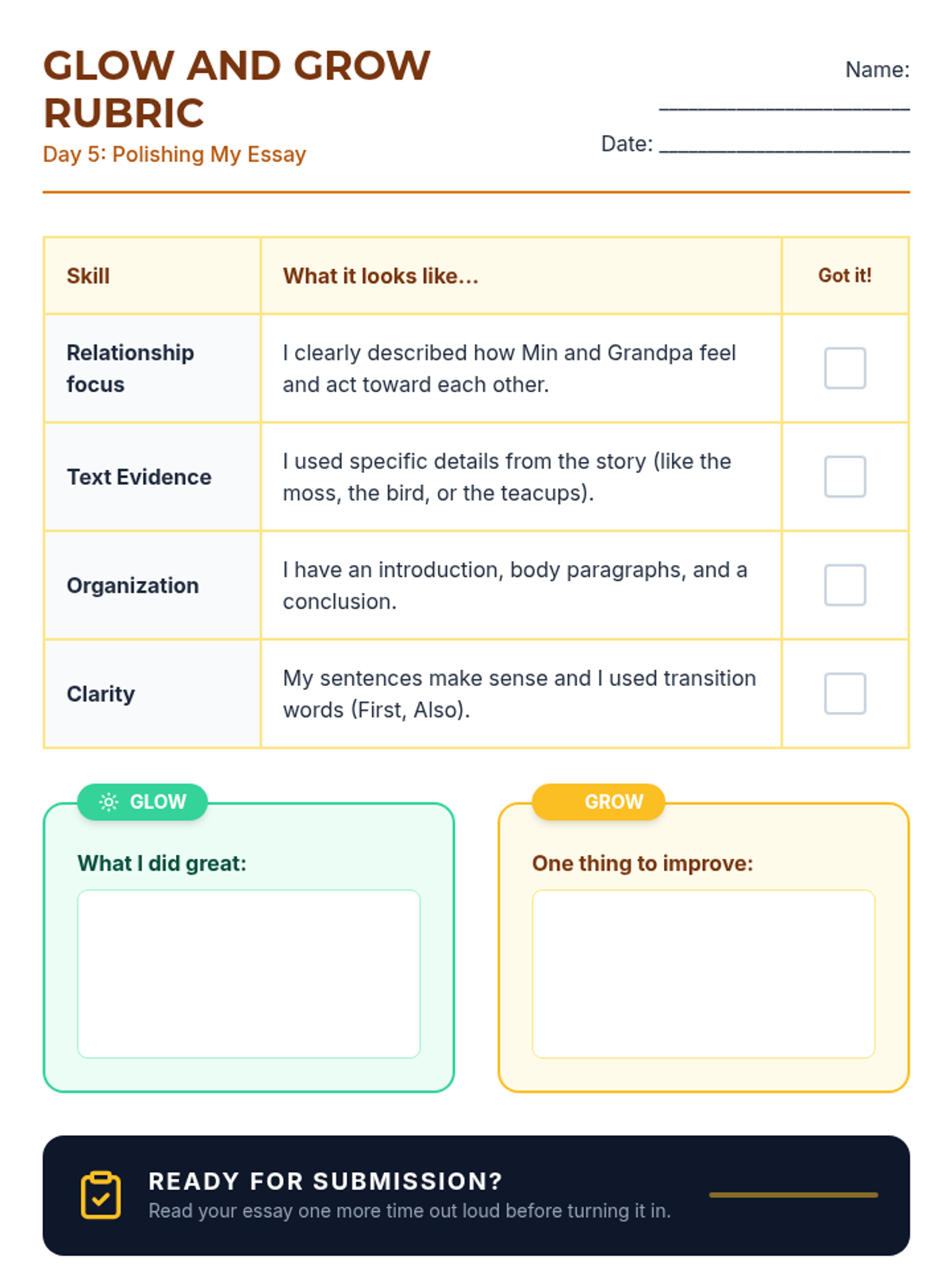 Students will use a kid-friendly MCAS rubric to self-assess and peer-edit their work. The lesson concludes with a final polish of their essay to meet grade 4 expectations.