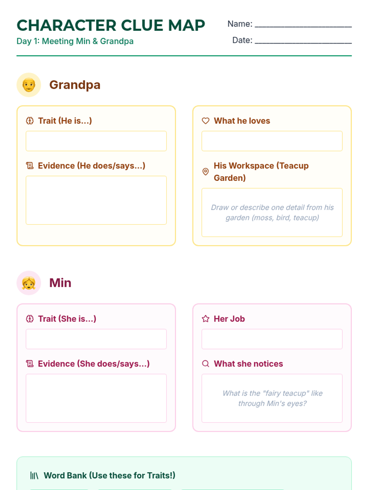 Students will read 'The Red Junglefowl in the Fairy Teacup' and identify key character traits of Min and Grandpa using a visual character map. Focus is on initial interactions and the setting of the teacup gardens.