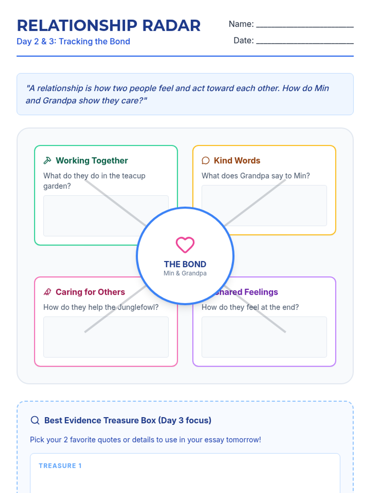 Students will analyze specific moments in the text that illustrate the bond between Min and Grandpa. They will use a 'Relationship Radar' to track how their feelings and actions toward one another evolve.