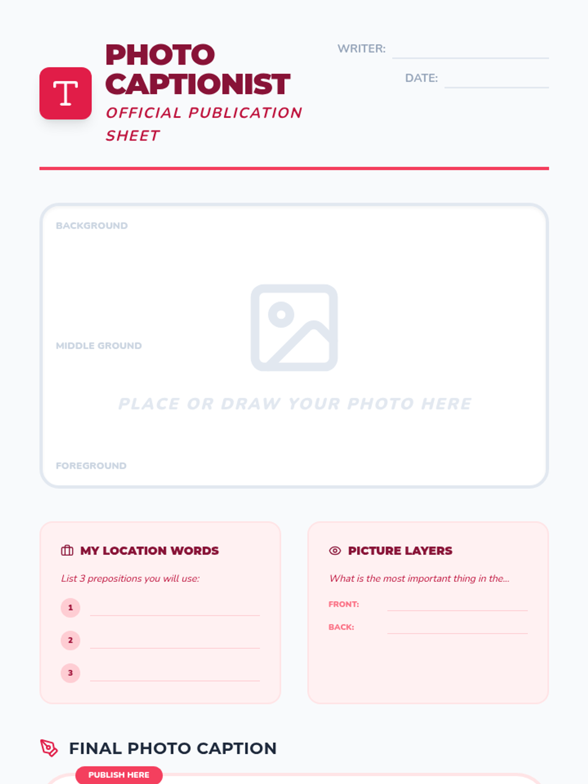 Students write descriptive captions for photos using specific location words to explain the relationship between objects.
