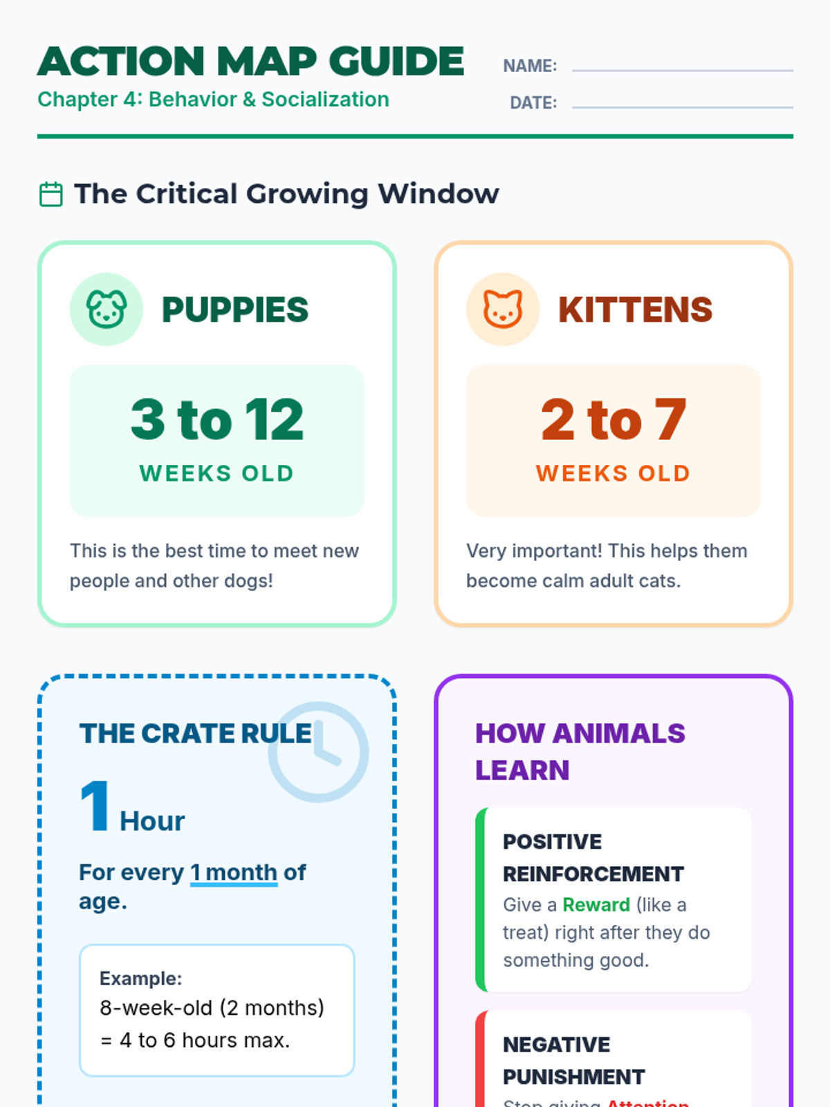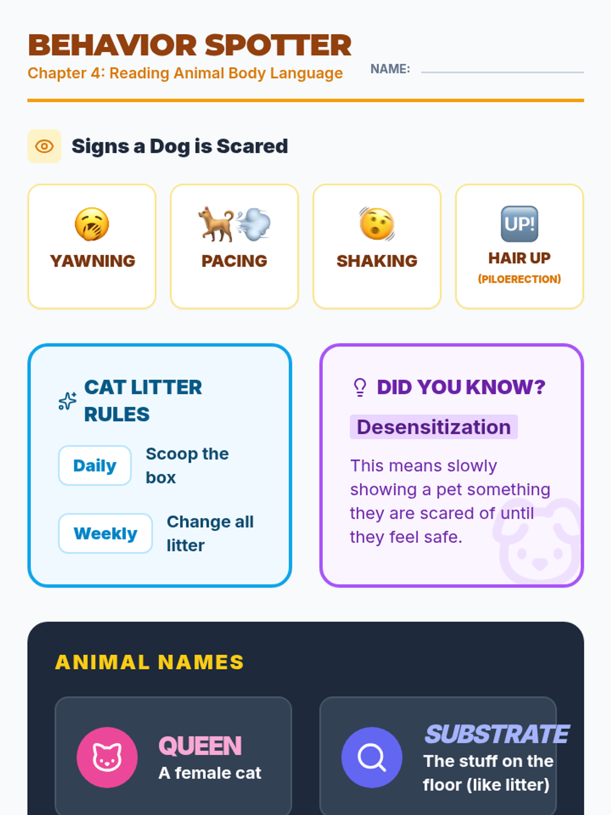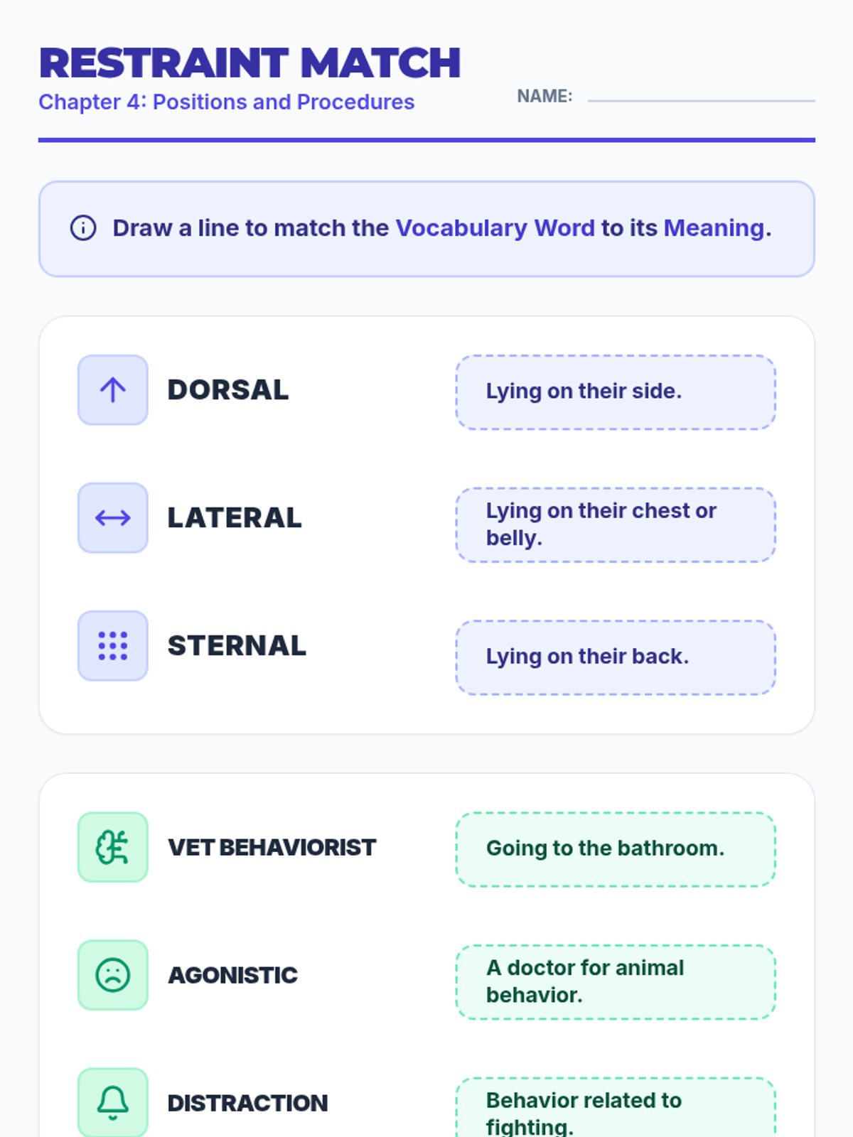 A specialized lesson focused on Chapter 4 concepts including animal socialization, operant conditioning, and restraint techniques. Materials are modified for high-readability and visual learning to support a student with Traumatic Brain Injury.