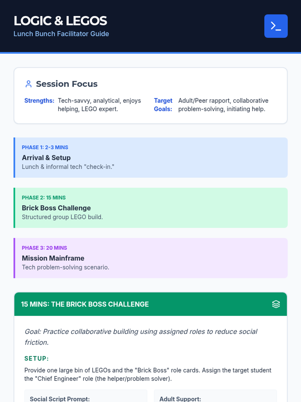 A structured lunch bunch session designed to foster social rapport through collaborative LEGO building and tech-themed problem-solving challenges.