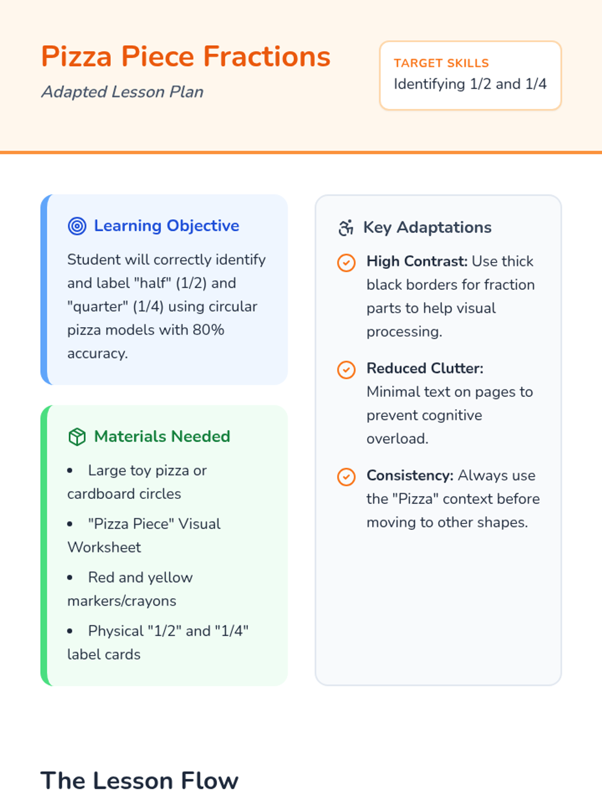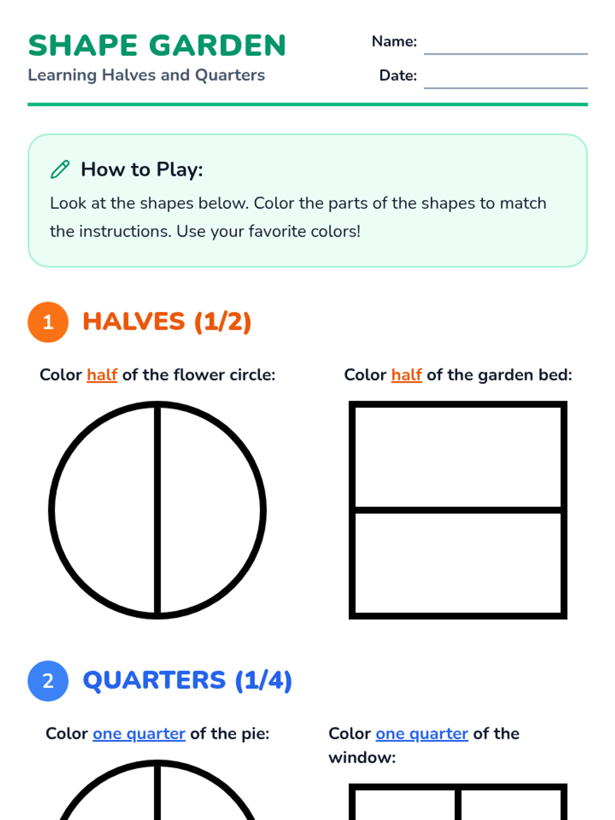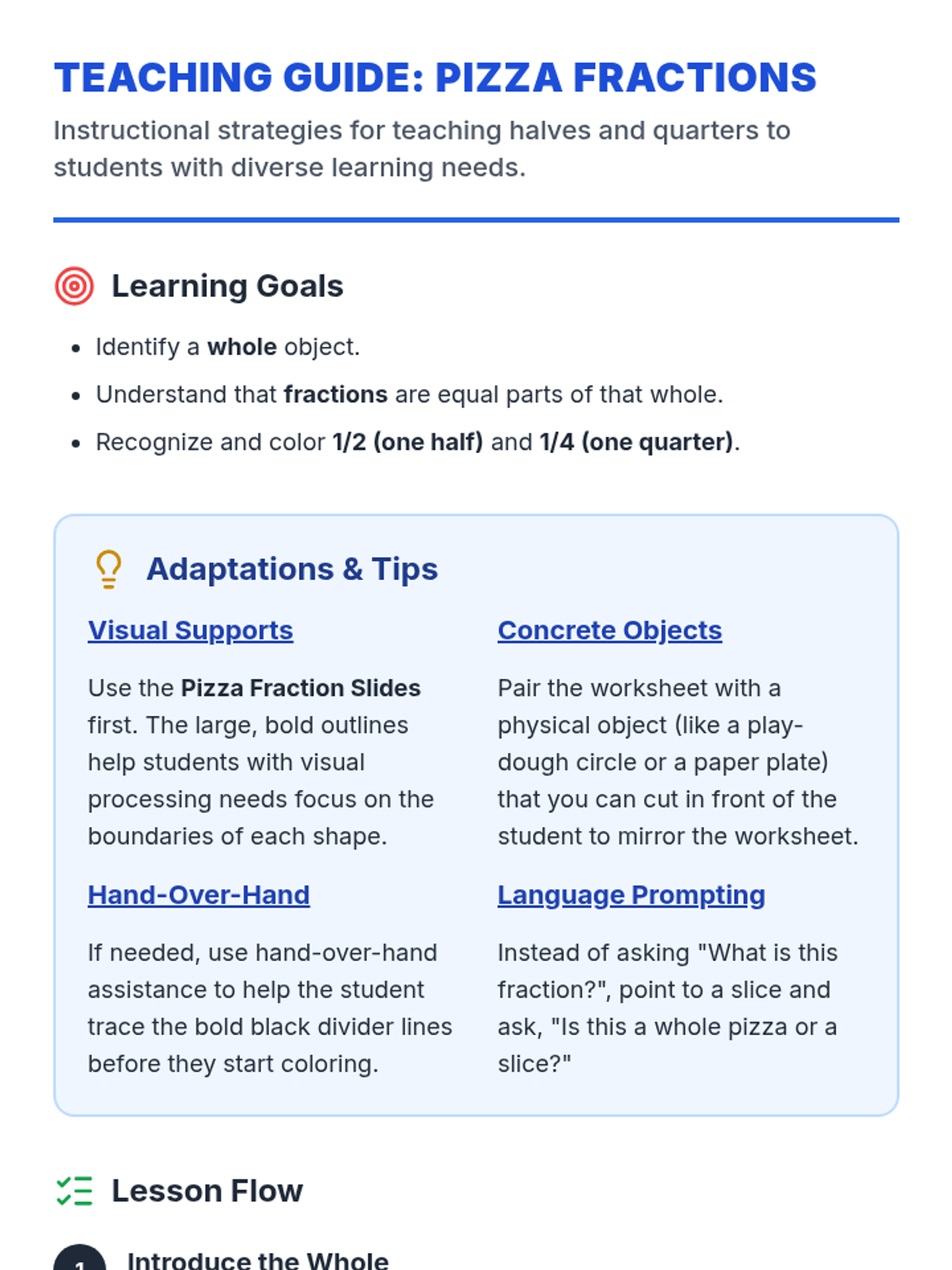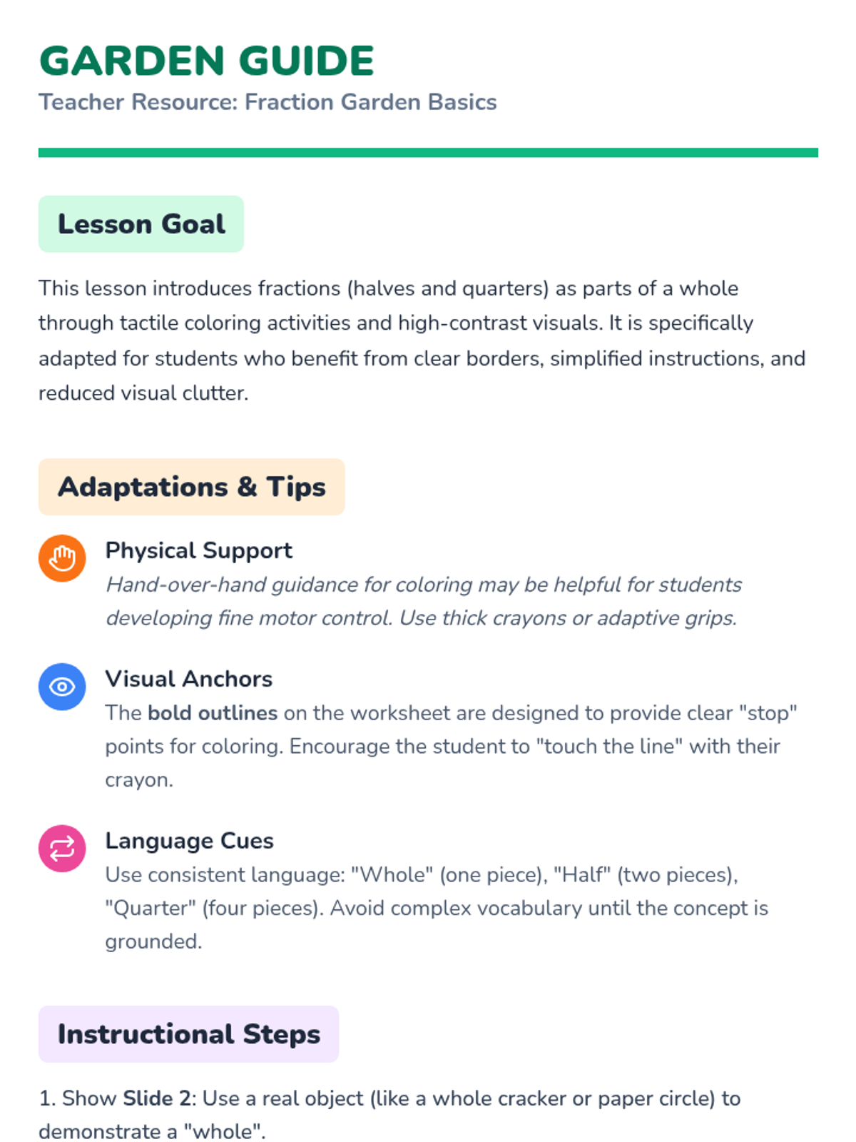 A foundational lesson on recognizing and coloring basic fractions using visual models, specifically designed for students who benefit from high-contrast, simple layouts and repetitive practice.