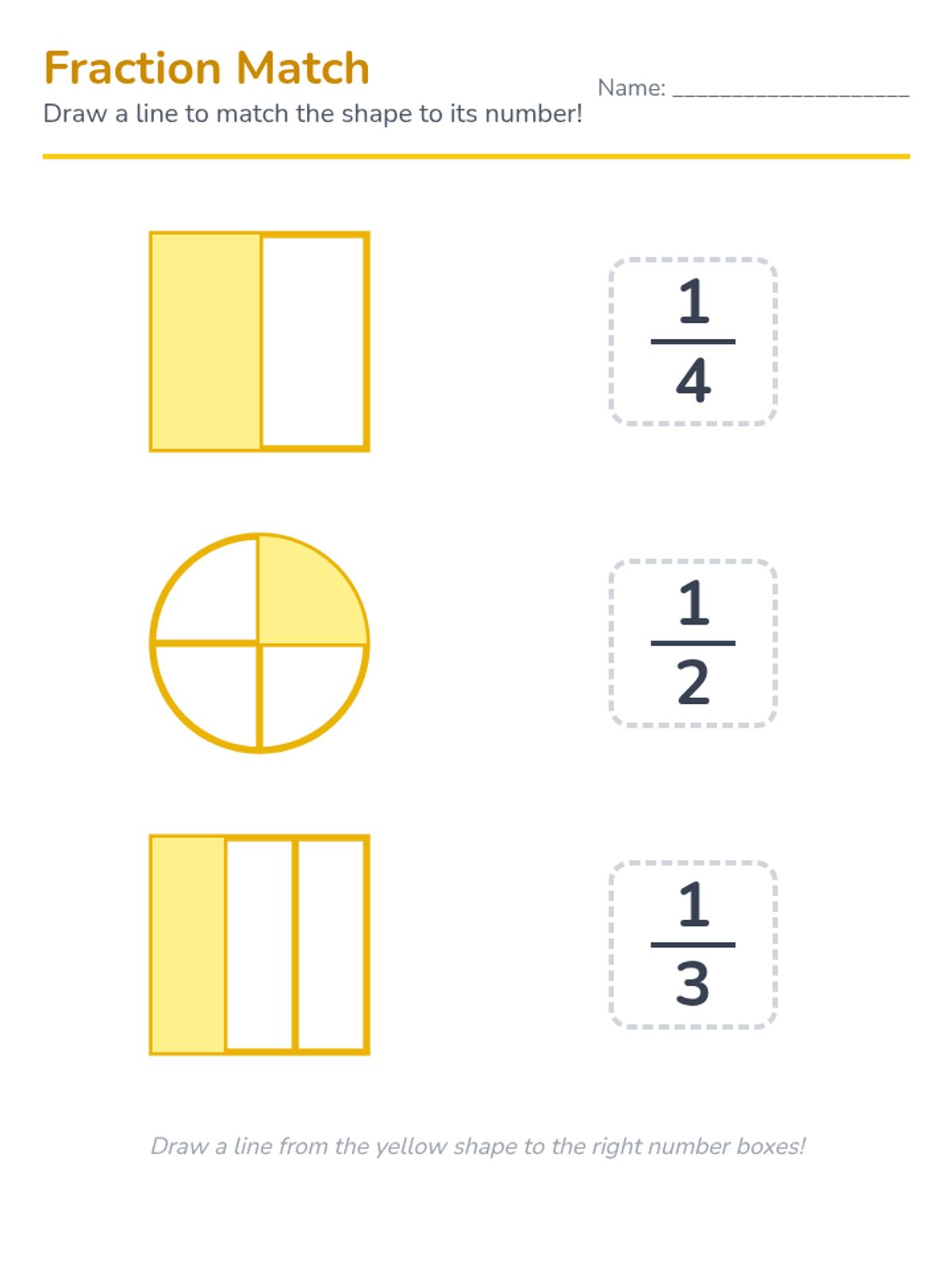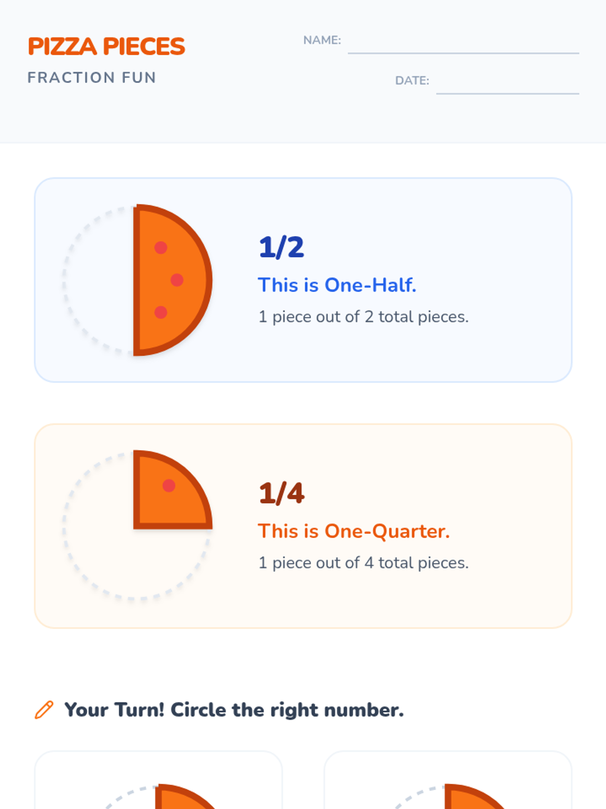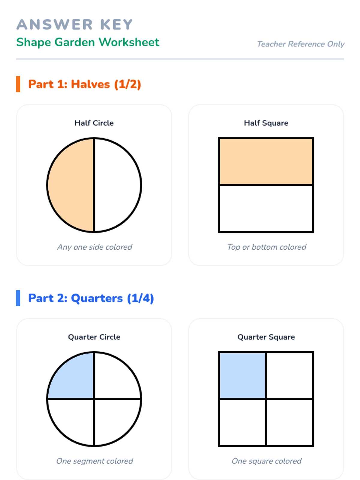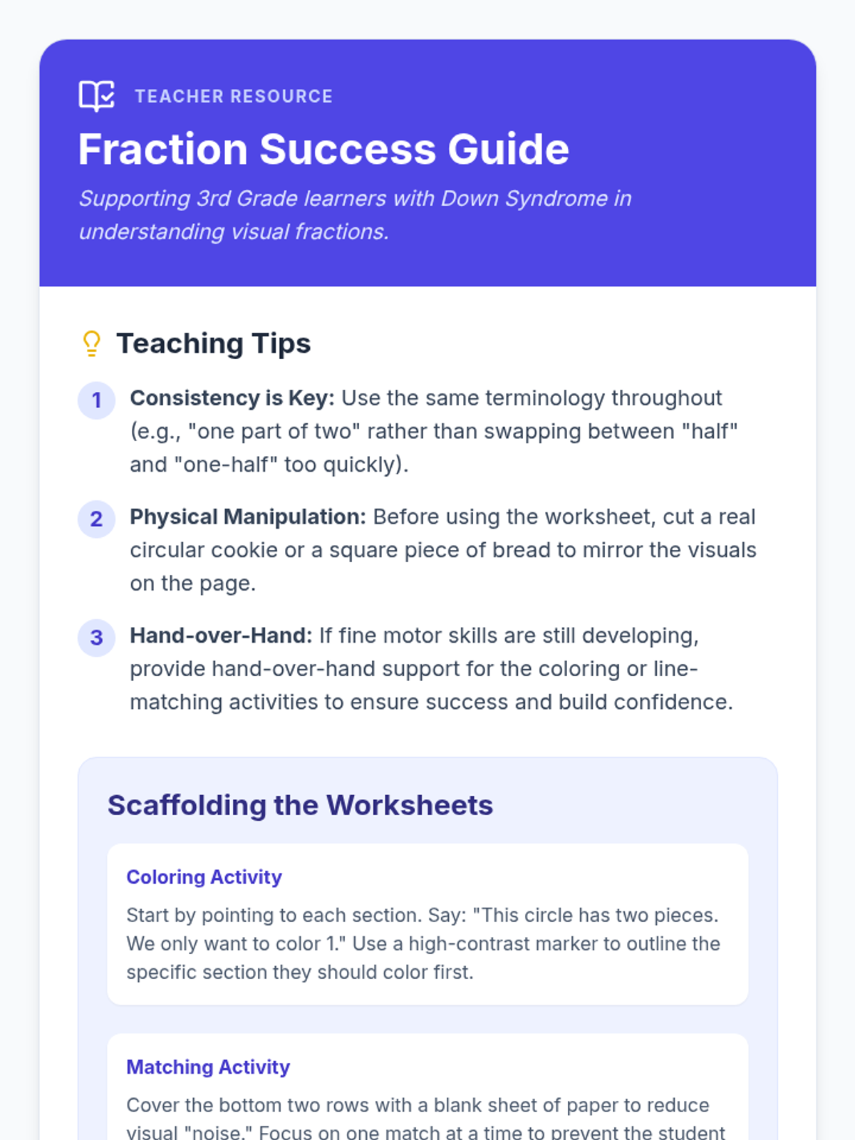A foundational lesson on recognizing and coloring basic fractions using visual models, specifically designed for students who benefit from high-contrast, simple layouts and repetitive practice.