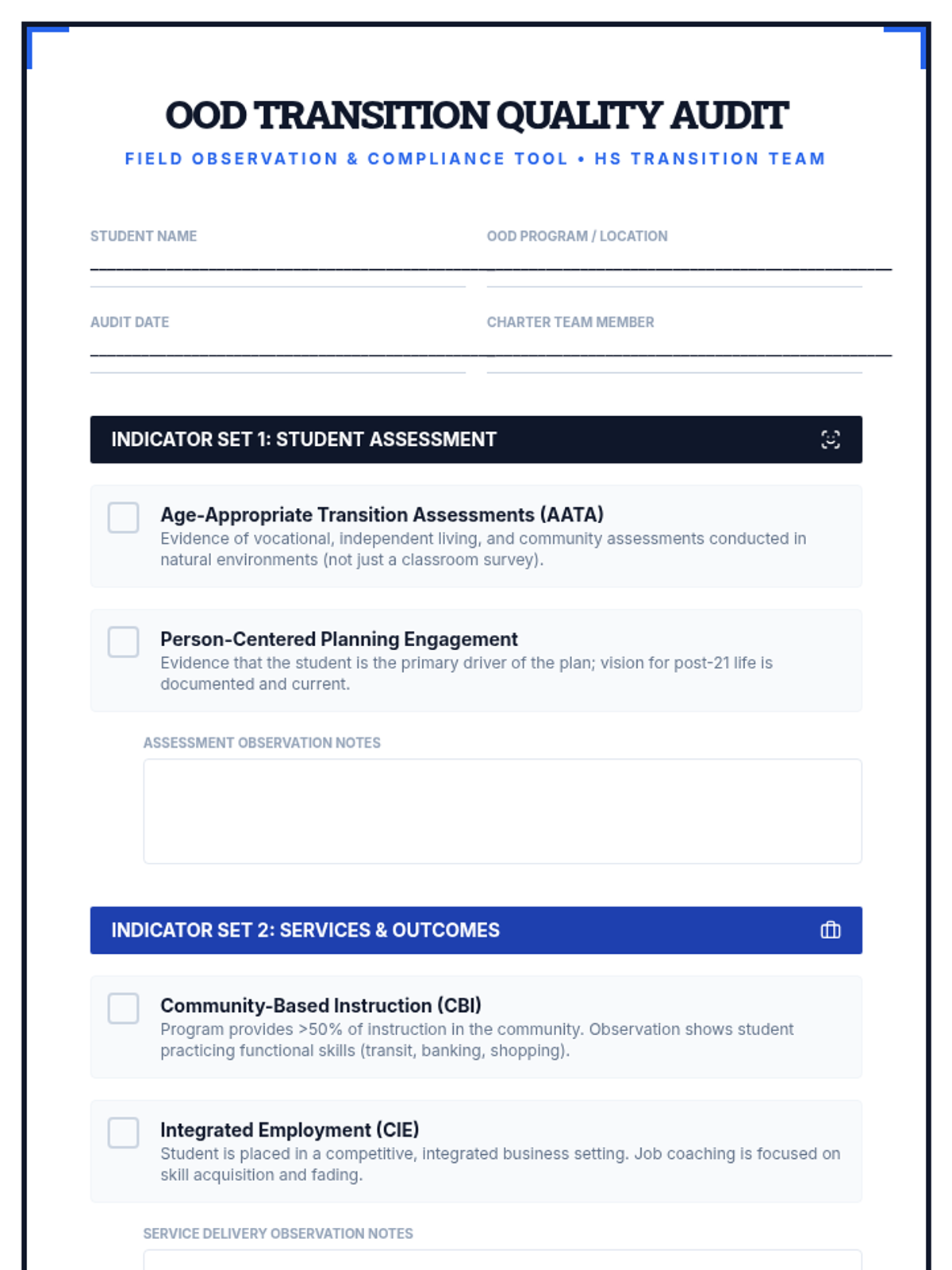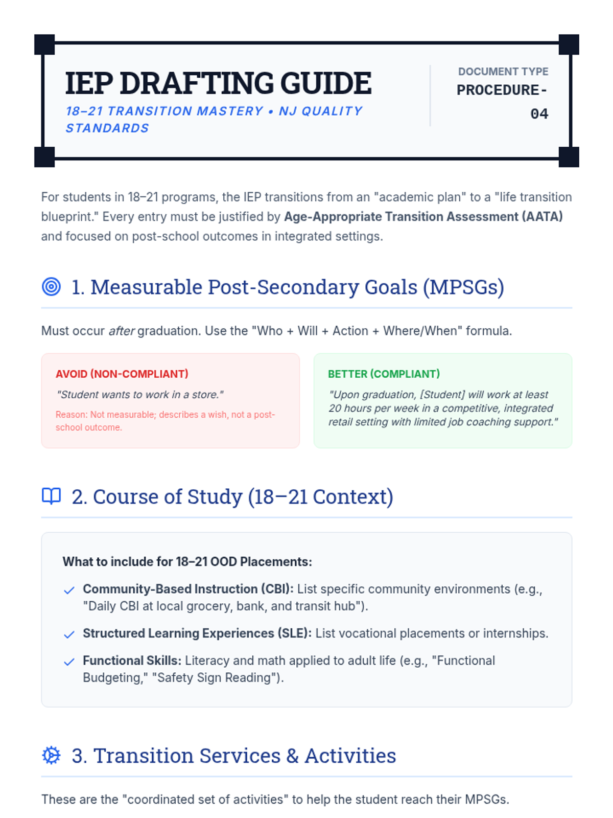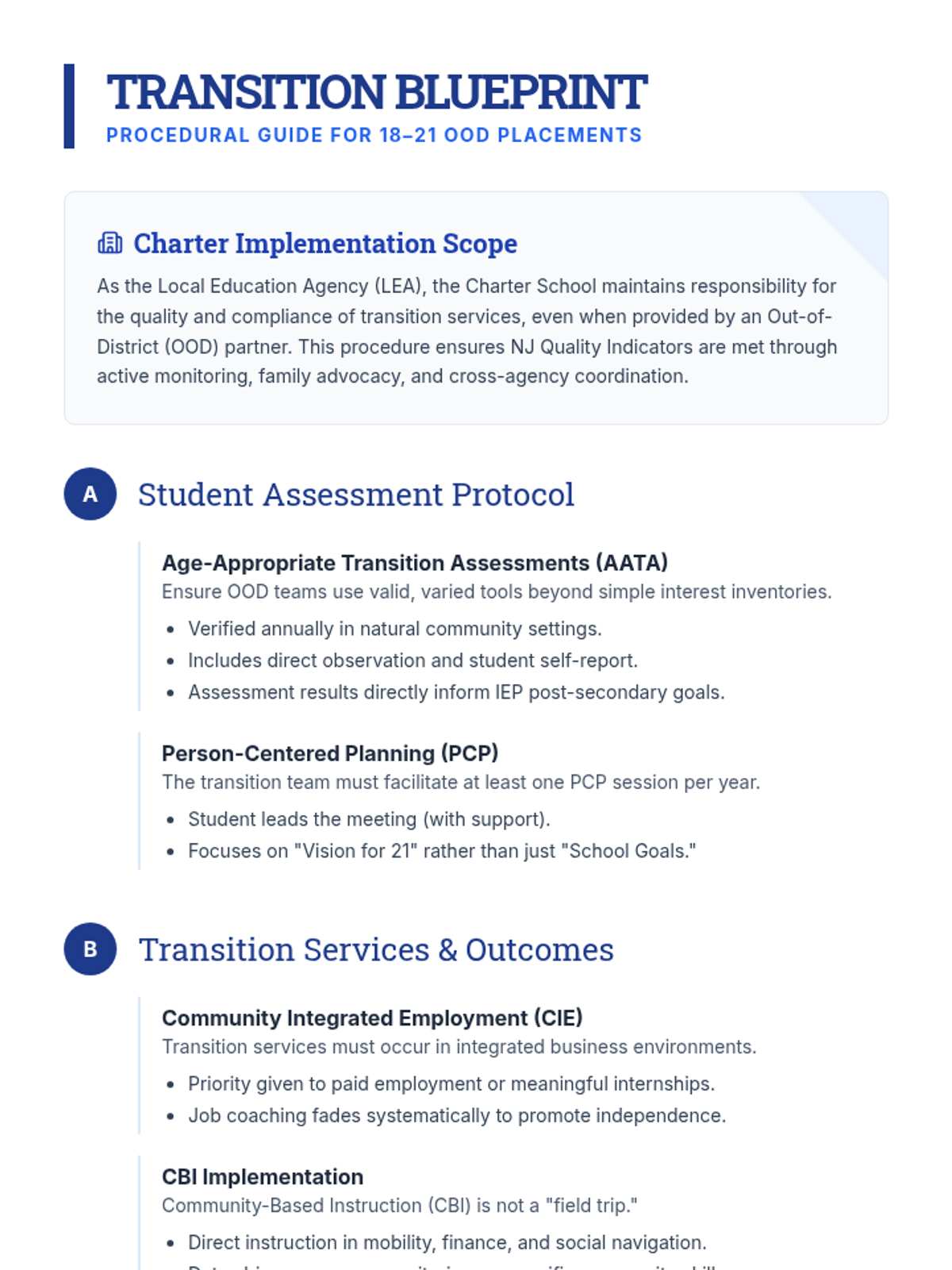 A comprehensive implementation framework for high school teams managing 18-21 transition programs for students in out-of-district placements, focusing on NJ quality indicators for assessment, services, and partnerships.