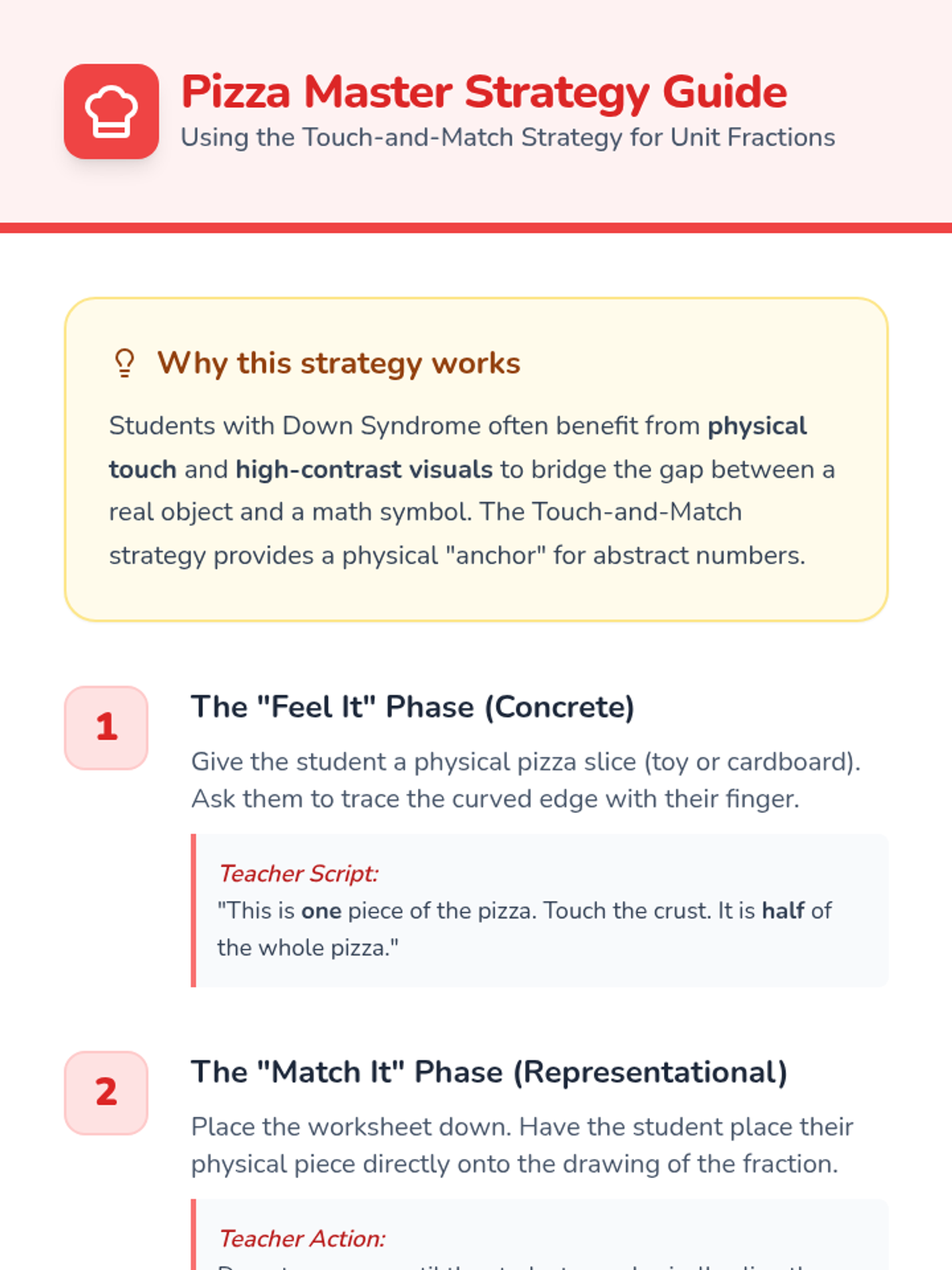 A modified introductory lesson on unit fractions (1/2 and 1/4) specifically designed for students with Down Syndrome, using high-visual pizza models and the Concrete-Representational-Abstract (CRA) approach.