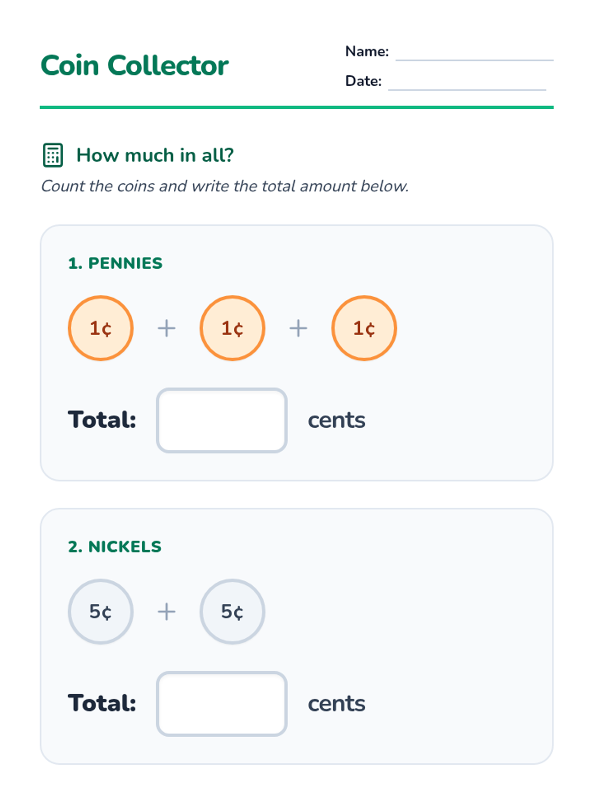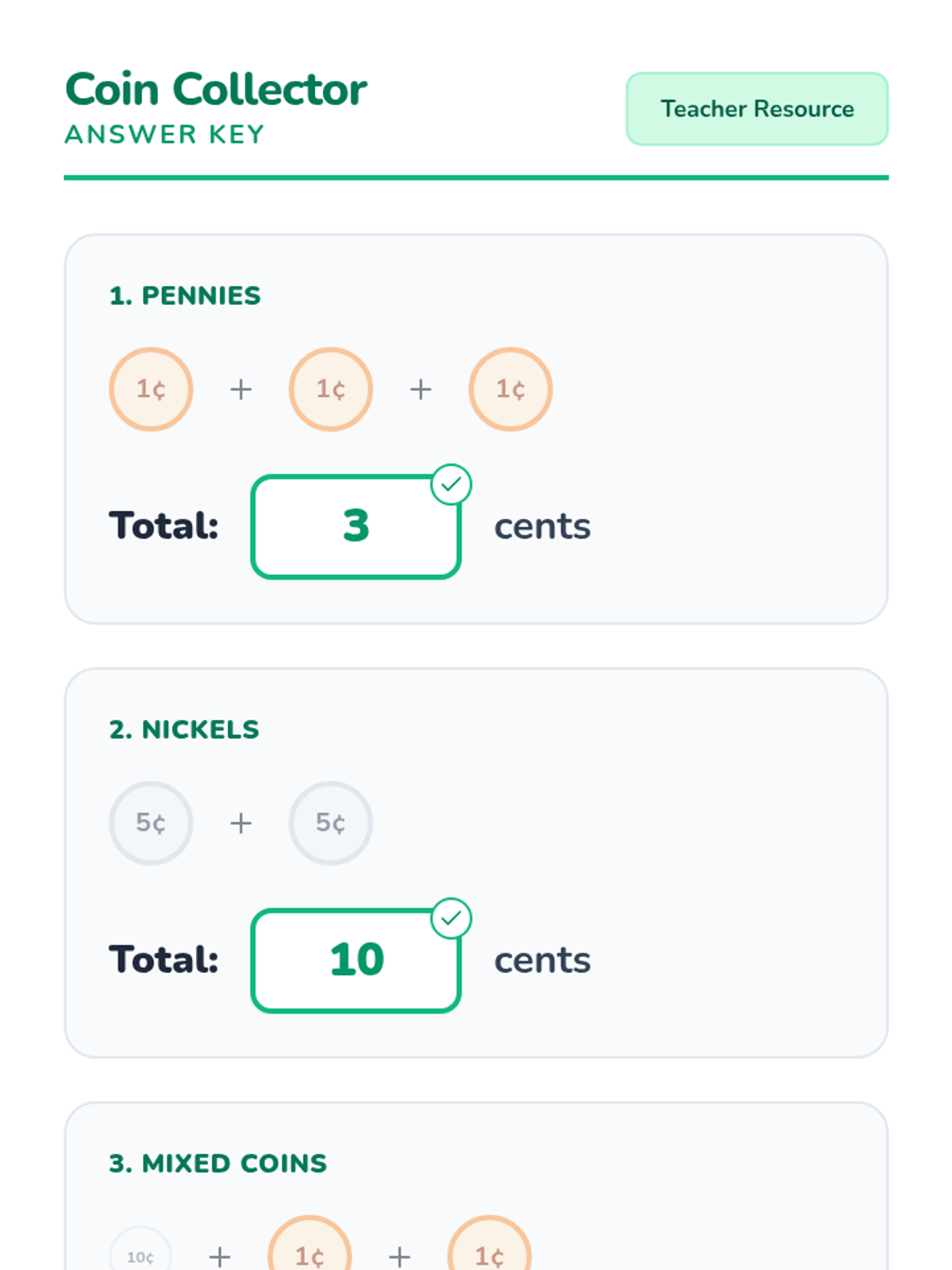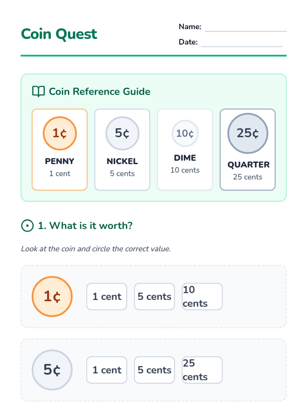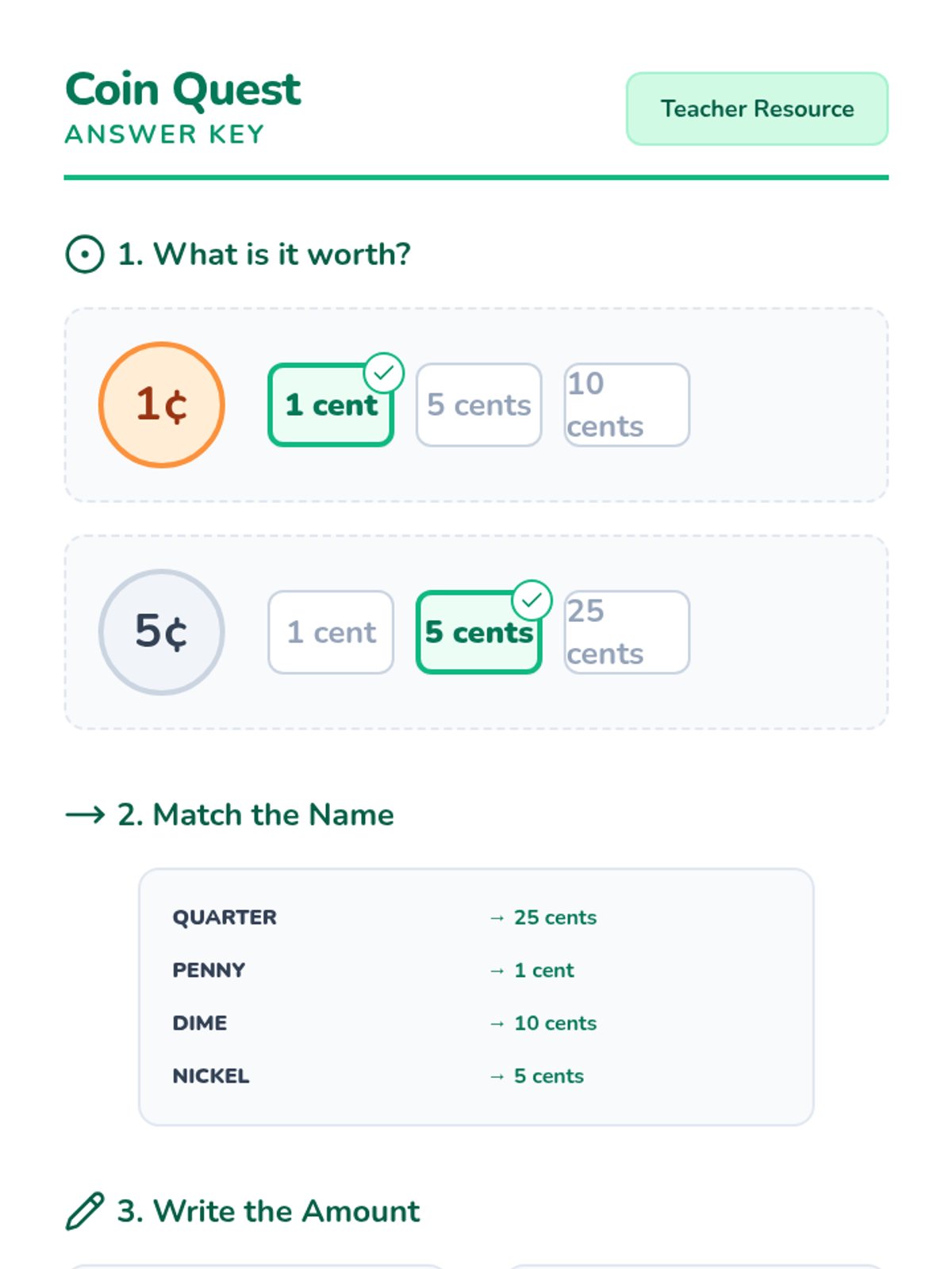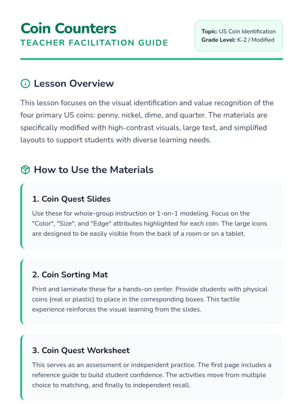 A lesson focused on identifying US coins (penny, nickel, dime, quarter) through visual identification and value matching, designed for students requiring visual support or modified materials.