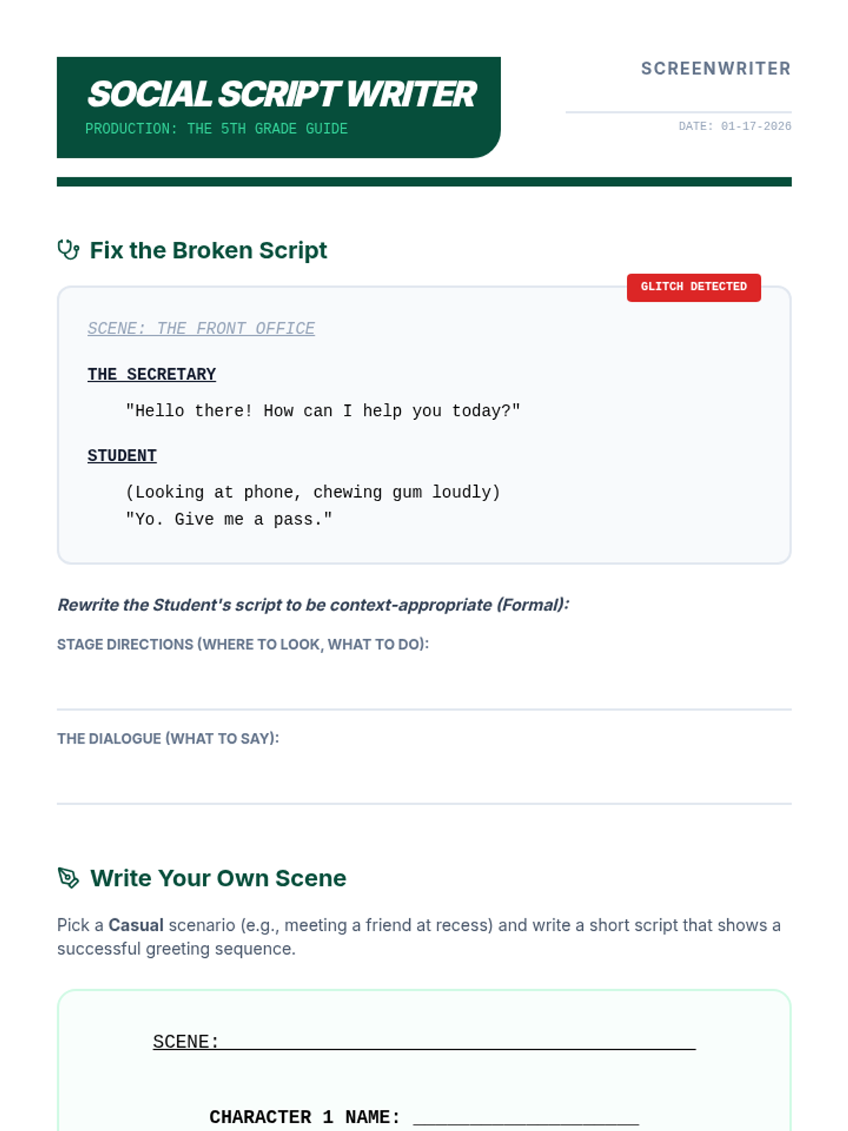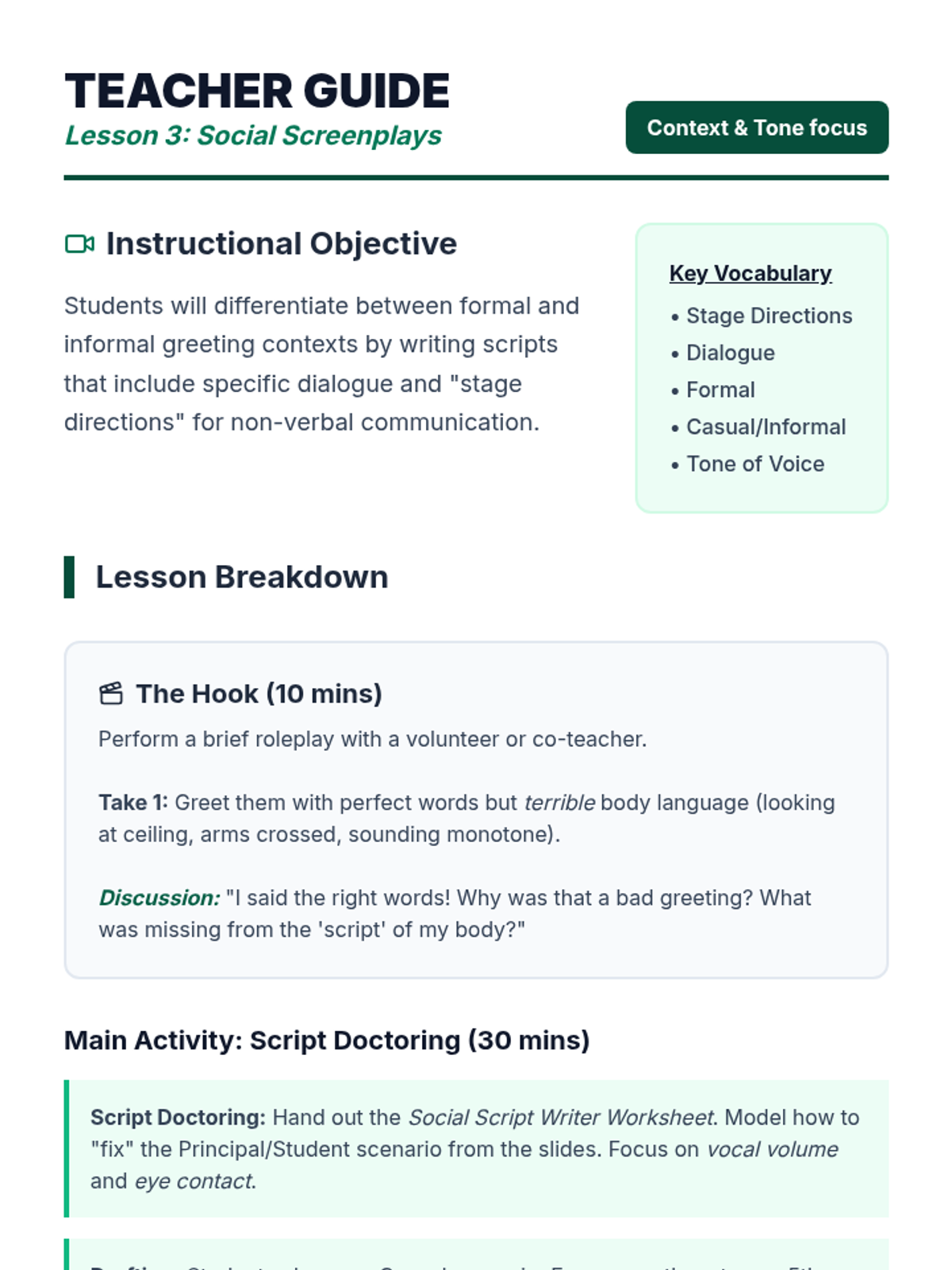 Students practice writing short scripts that differentiate between formal and informal greetings, including stage directions for body language and tone of voice.