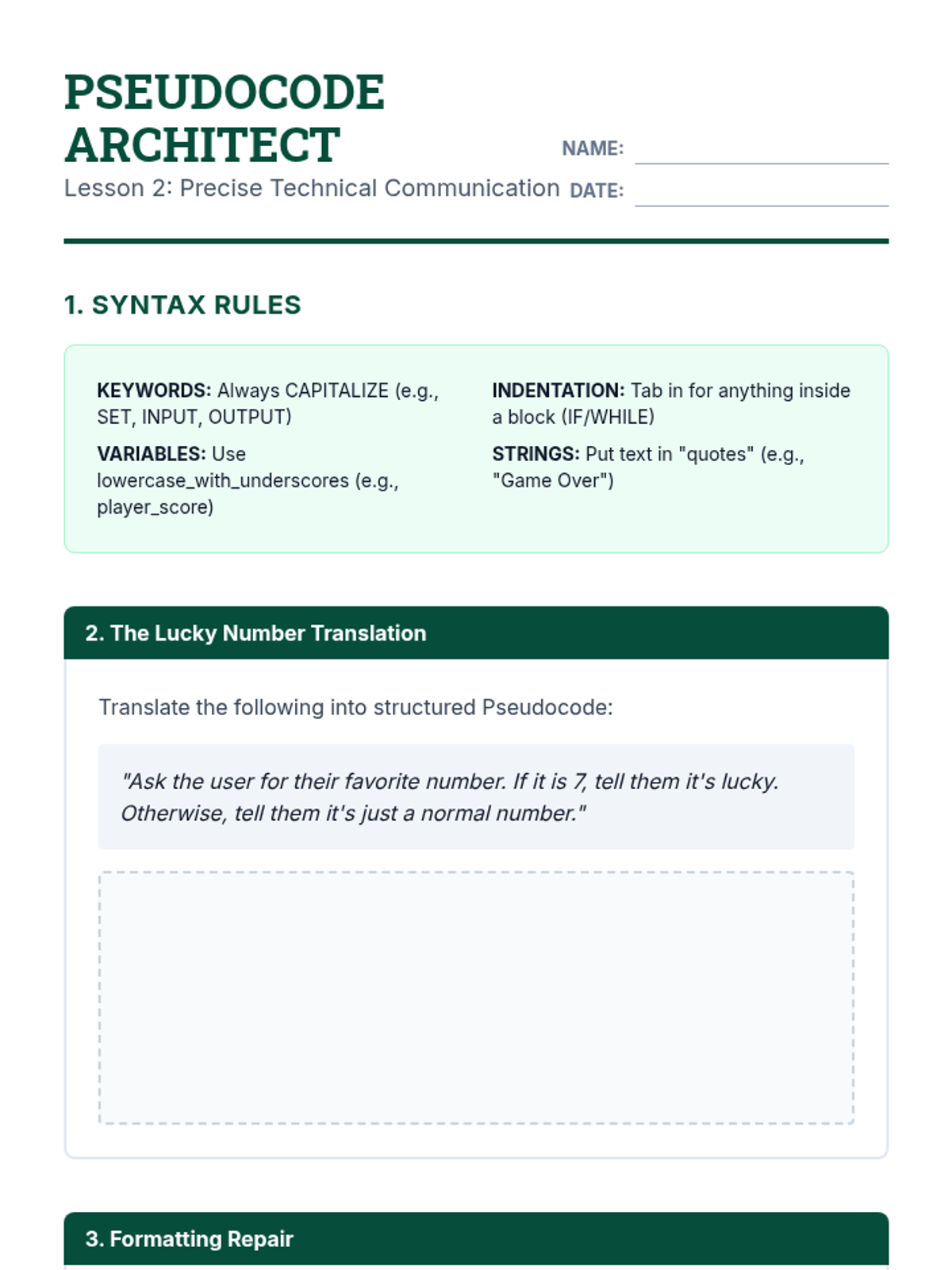 Translating human intent into structured pseudocode. Focuses on the precision and technical communication required for computational thinking.