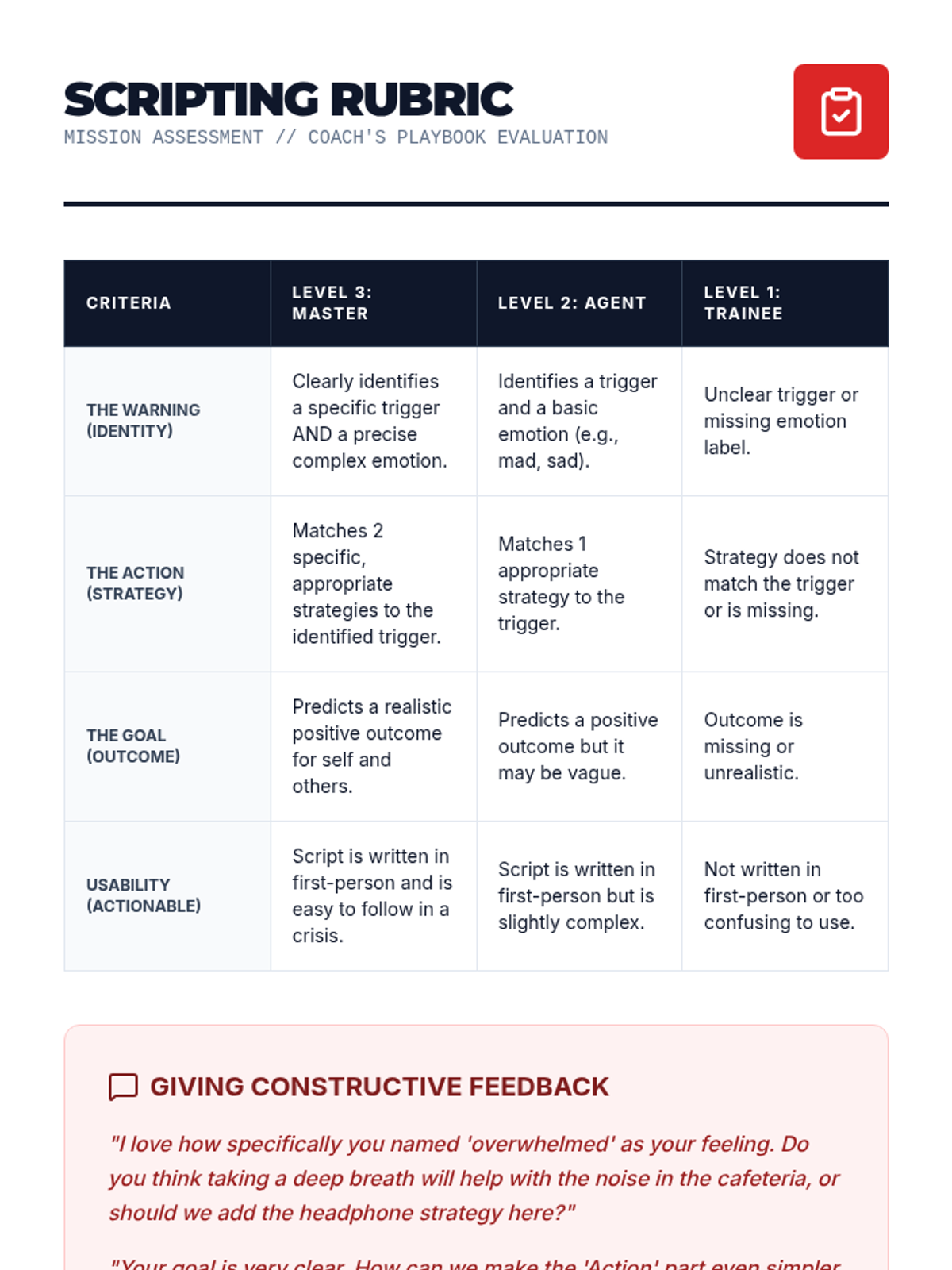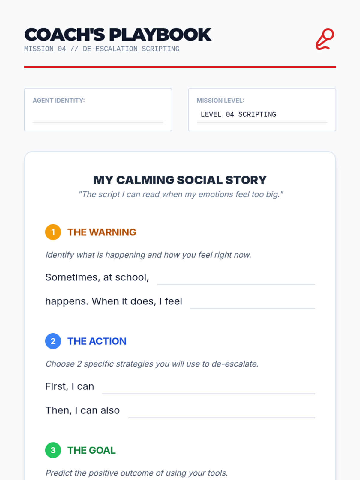 Students write their own 'Coach's Scripts' or personal social stories that guide them through de-escalation routines. They learn to give themselves a 'mental pep talk' during stressful moments.