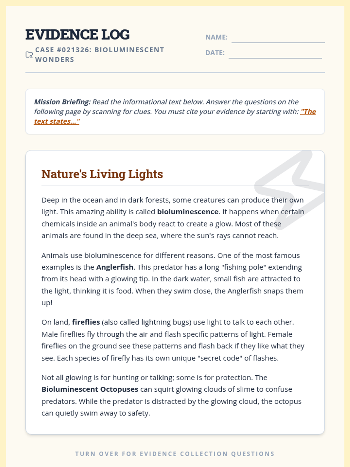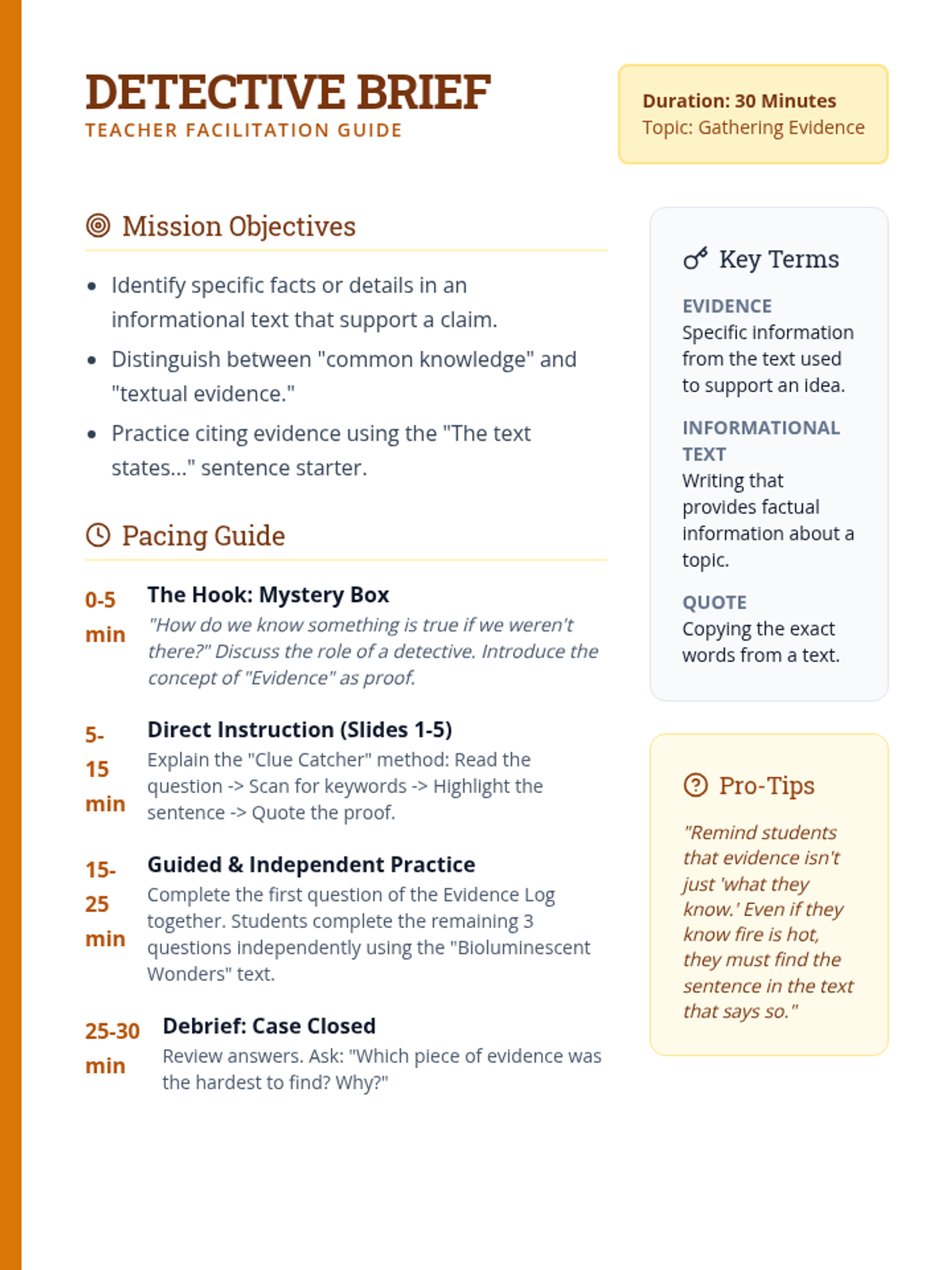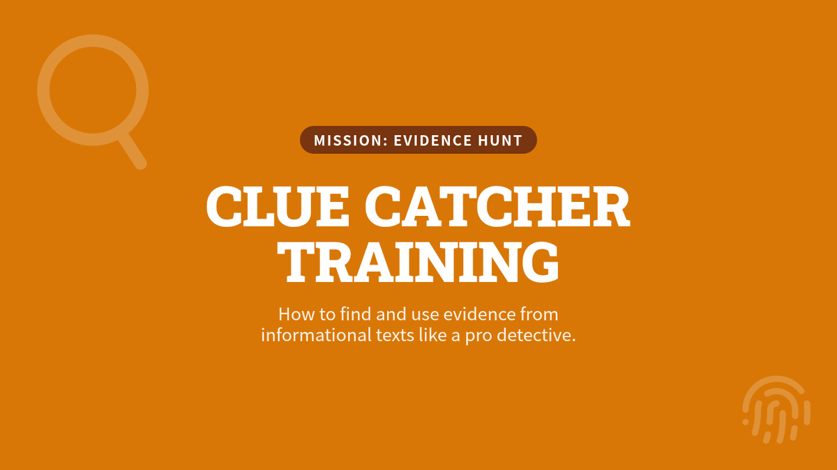 A 30-minute introductory lesson on identifying and extracting textual evidence from informational texts using a detective-themed approach.
