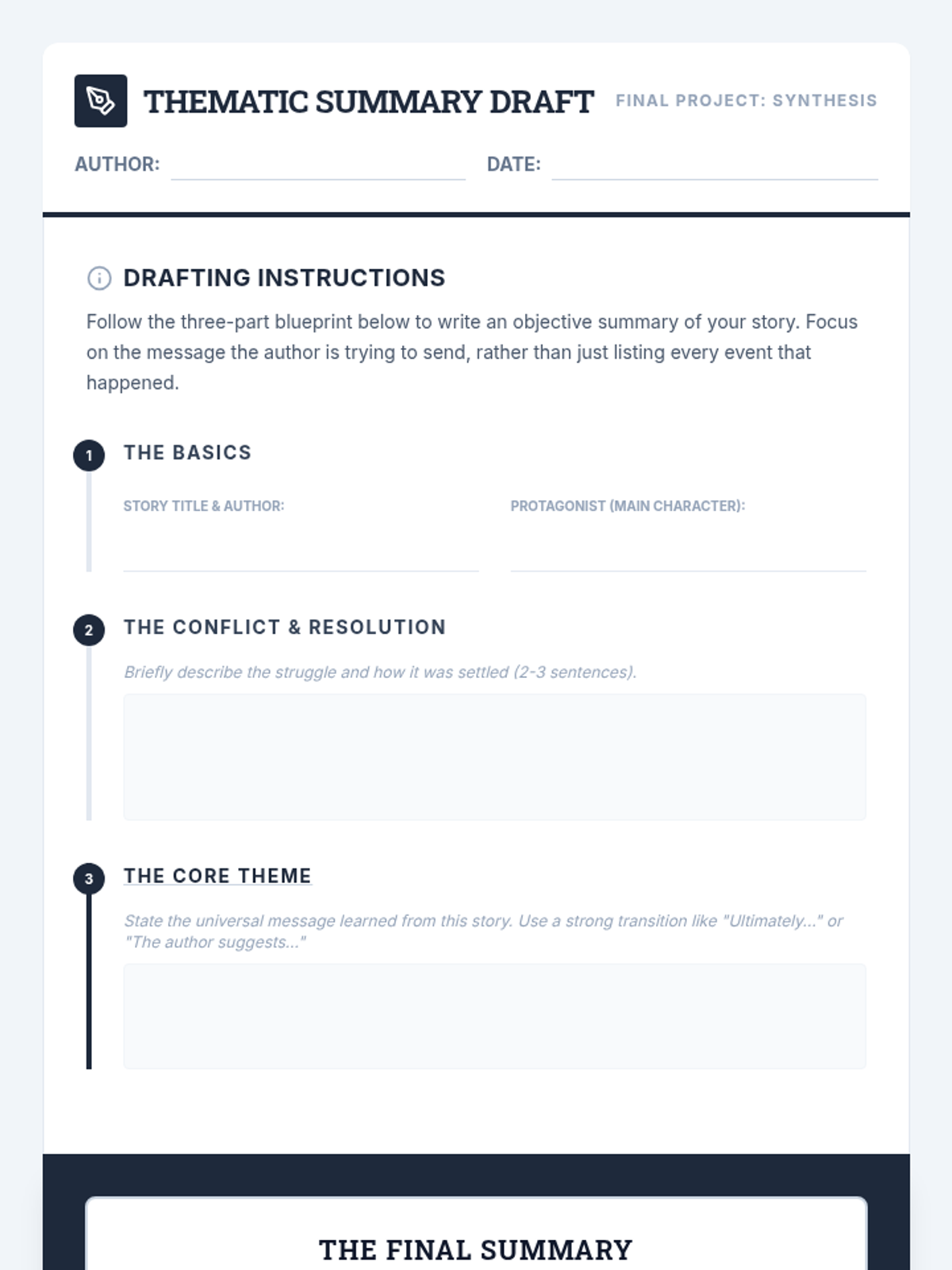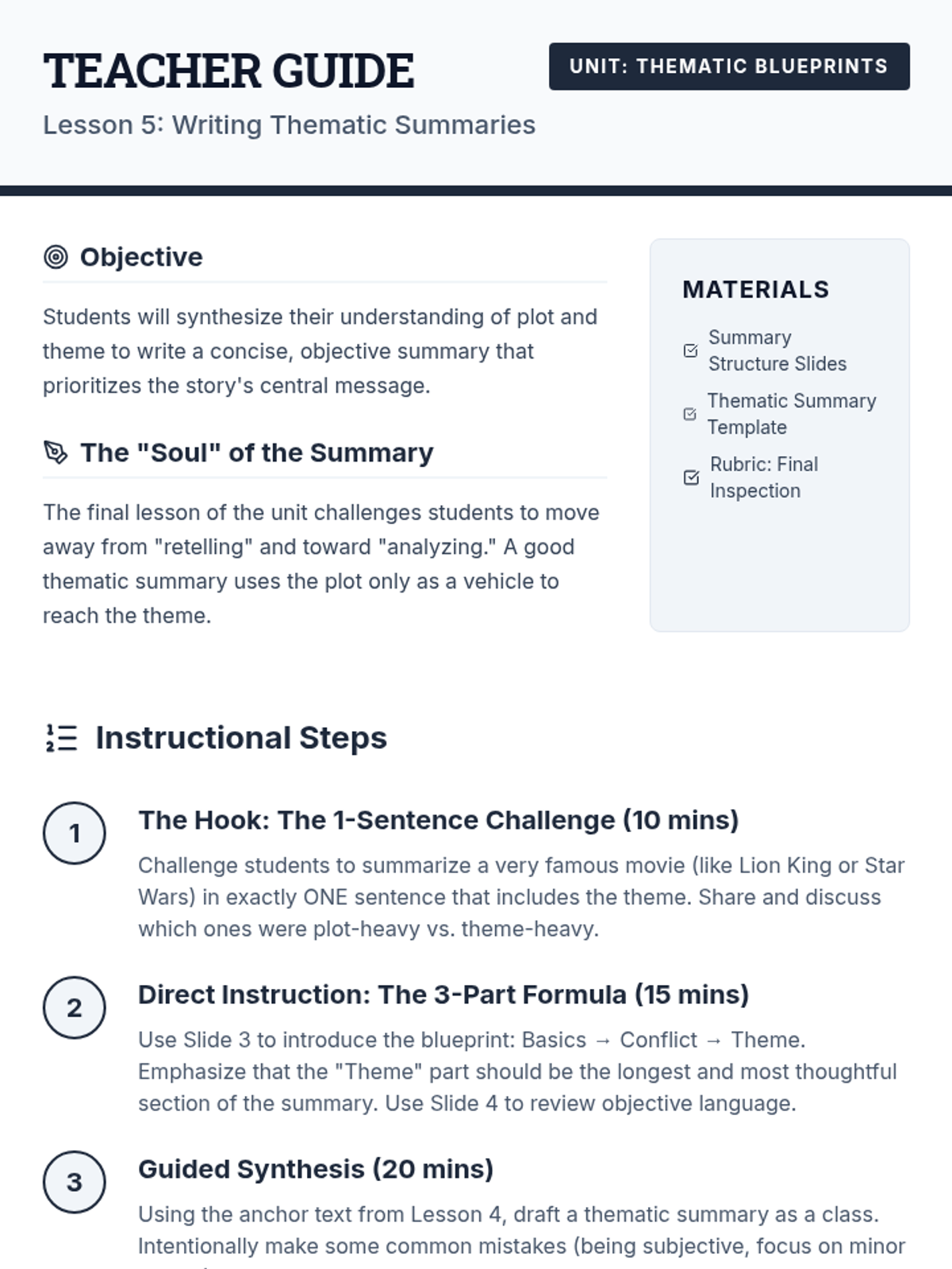 Students synthesize their learning by writing summaries that prioritize the story's theme over minor plot details. They practice objective summarization while clearly stating the central message as the 'soul' of their summary.