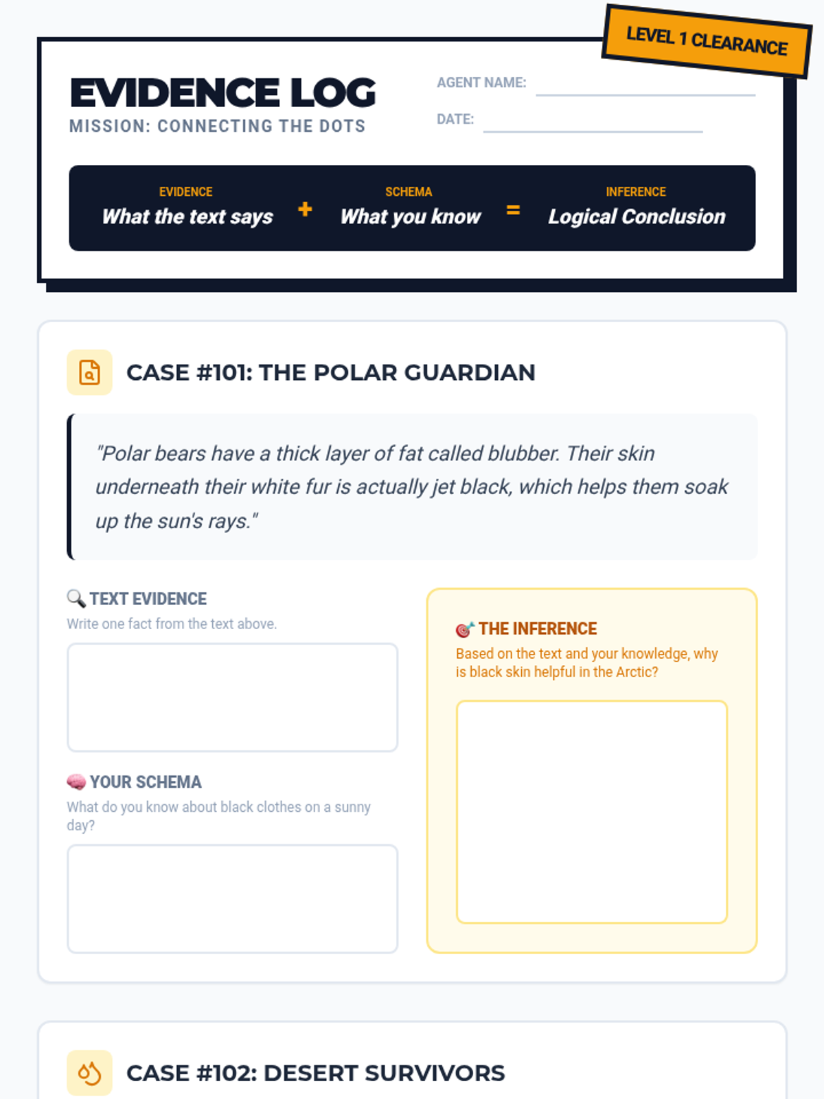 An introductory lesson on inferencing where students learn the 'Inference Equation' and practice identifying text evidence and background knowledge in short nonfiction contexts.