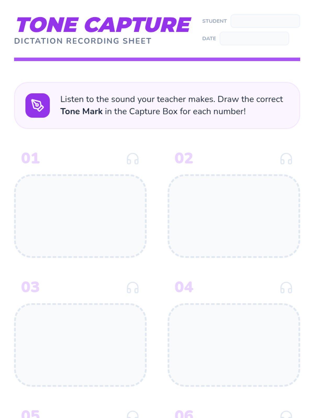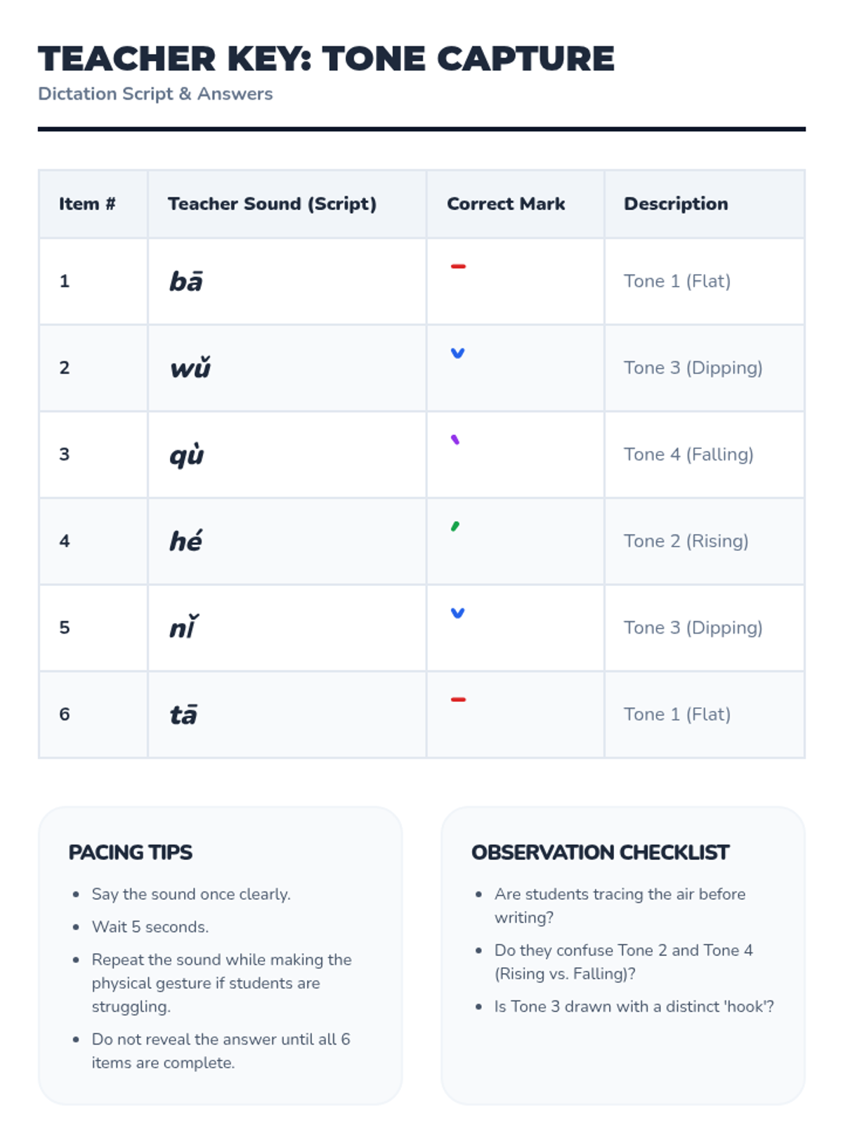 Assess symbol-sound correspondence through a dictation activity. Students listen to a sound and draw the correct tone mark on their work areas.
