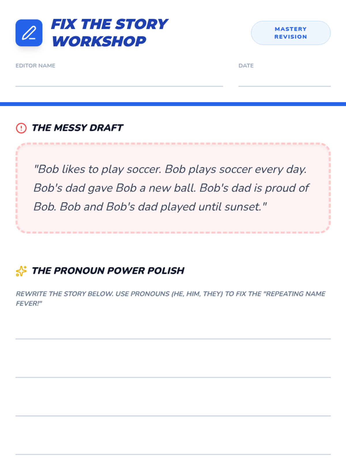 Students apply their knowledge by revising repetitive texts and drafting their own descriptions using a variety of personal pronouns.