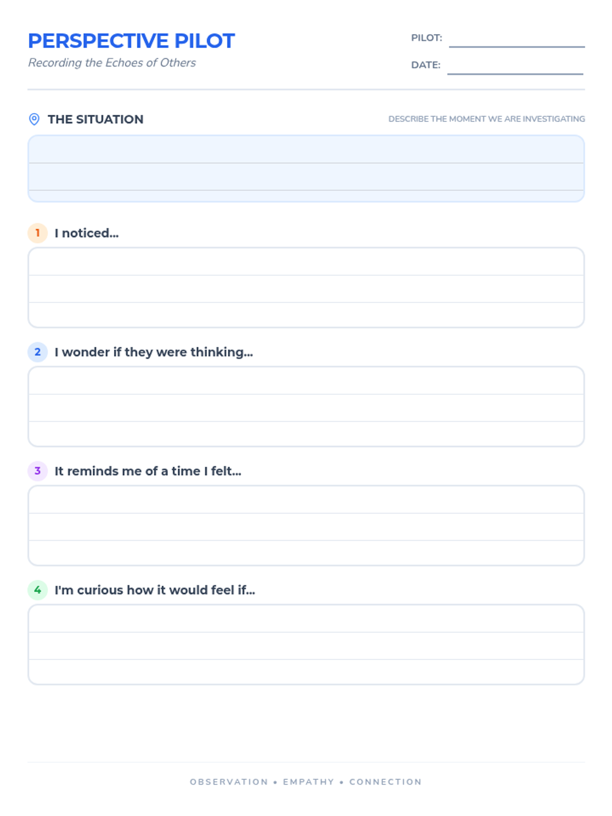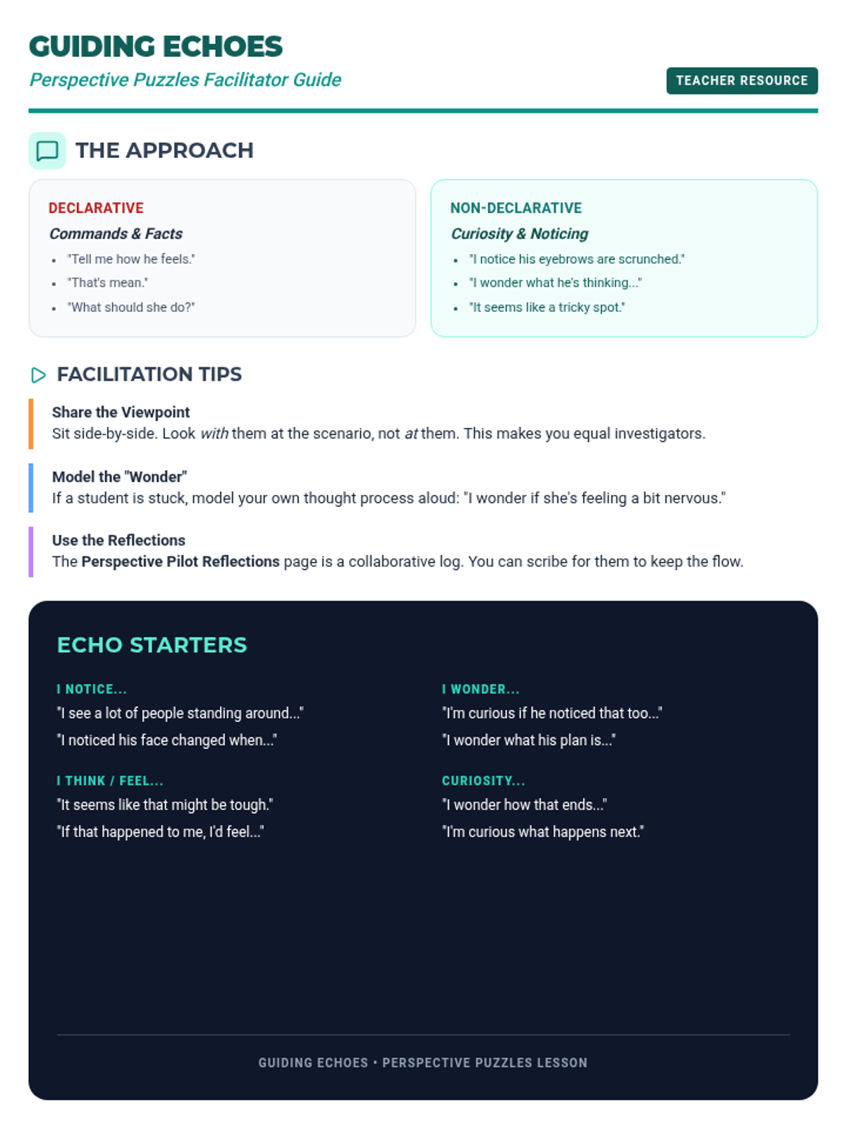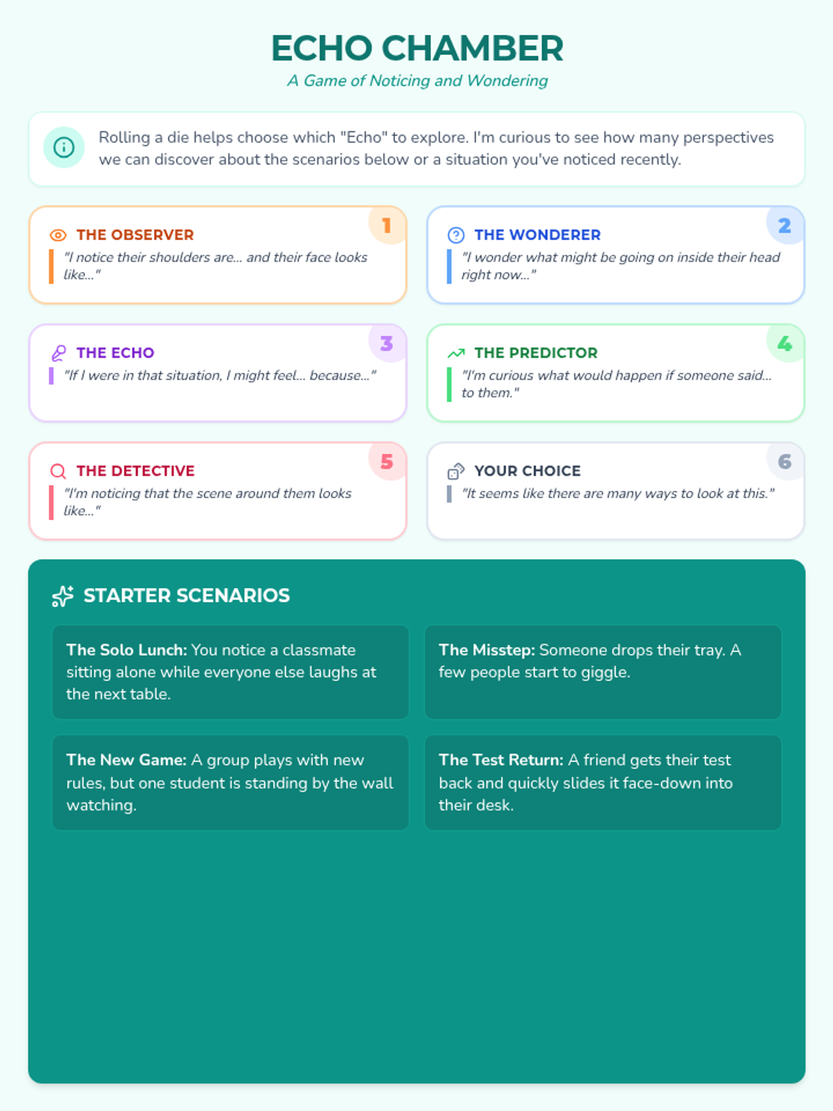 A dice-based exploration of empathy and perspective-taking using non-declarative language techniques to help 4th graders notice social cues and understand others' internal worlds.
