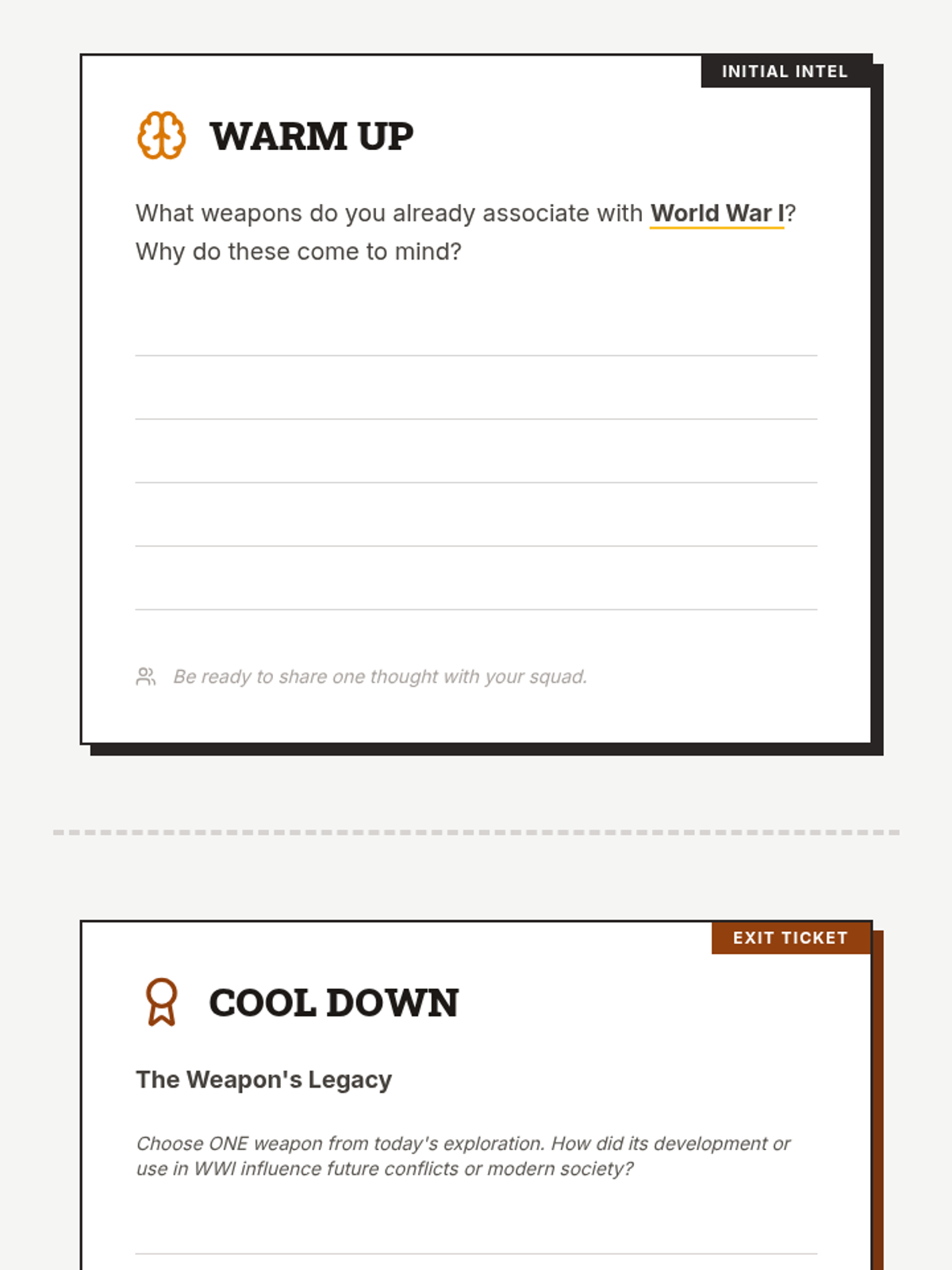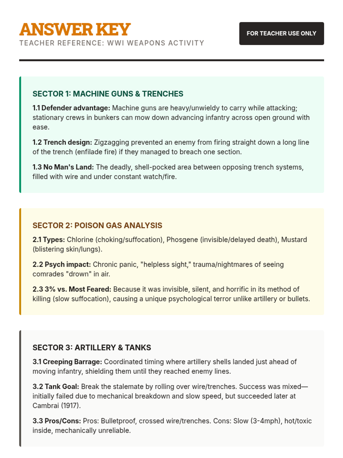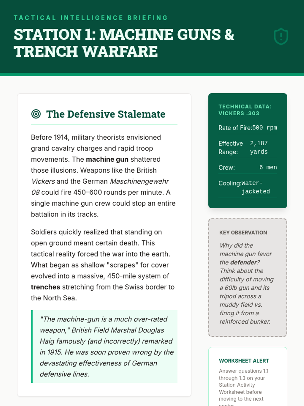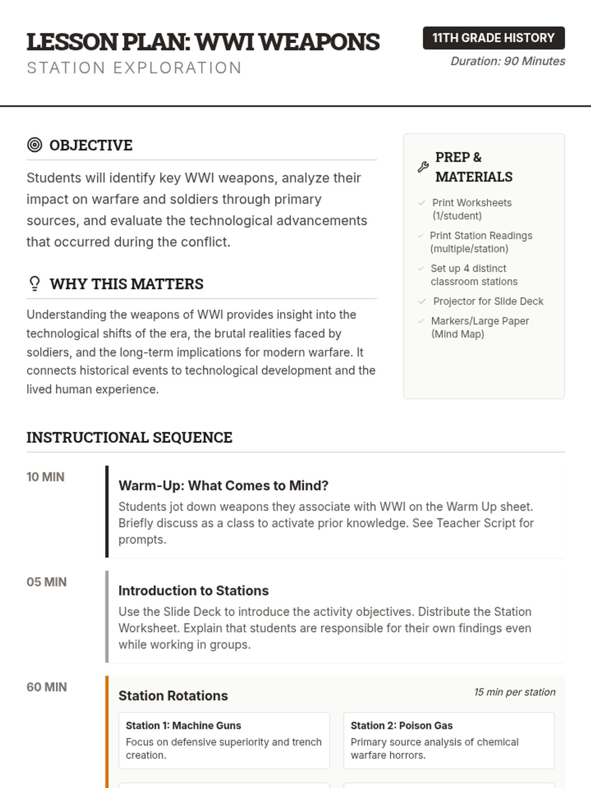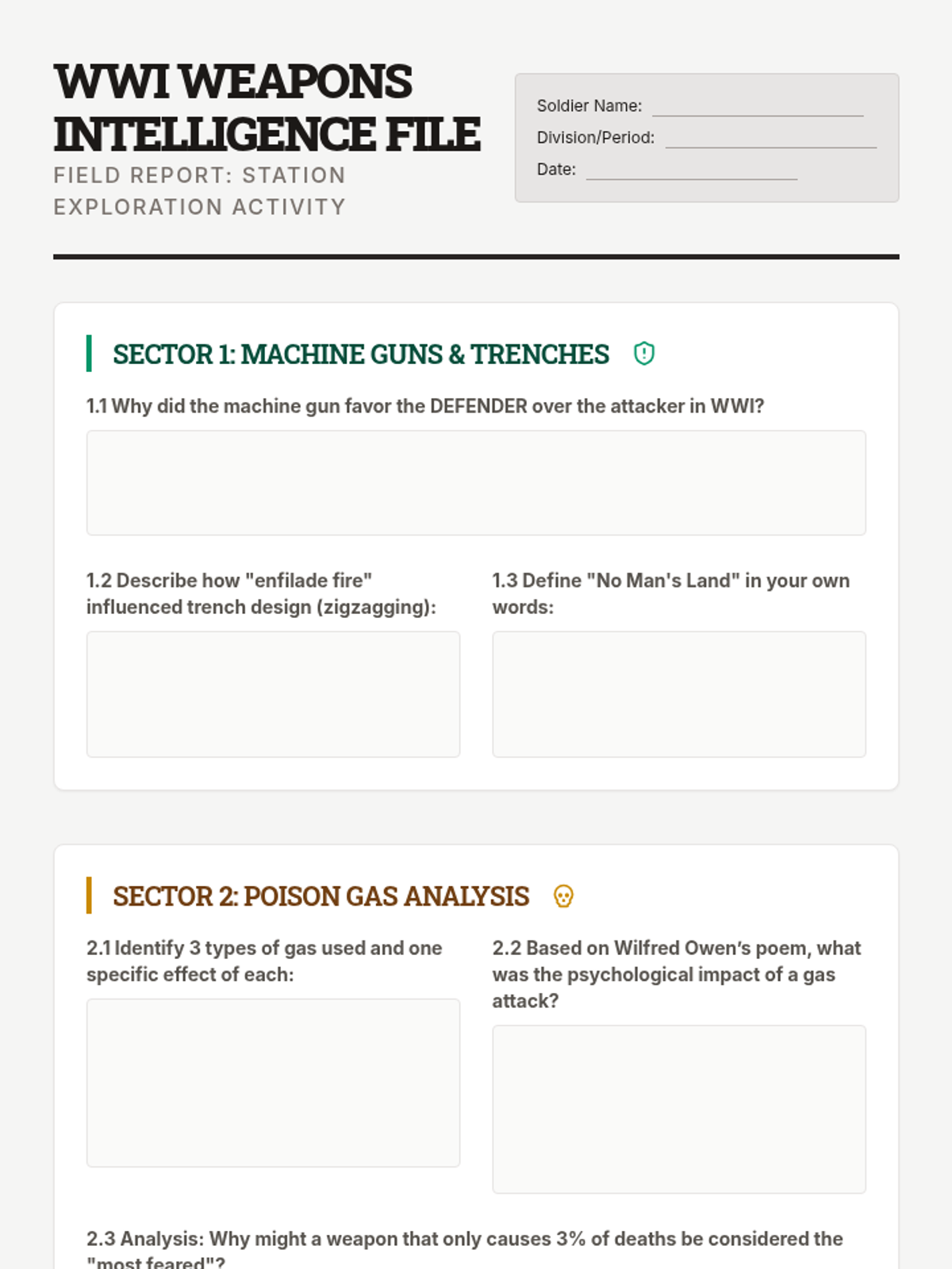 An immersive 90-minute station-based exploration of WWI weaponry, technological innovation, and its human cost for 11th-grade history students.