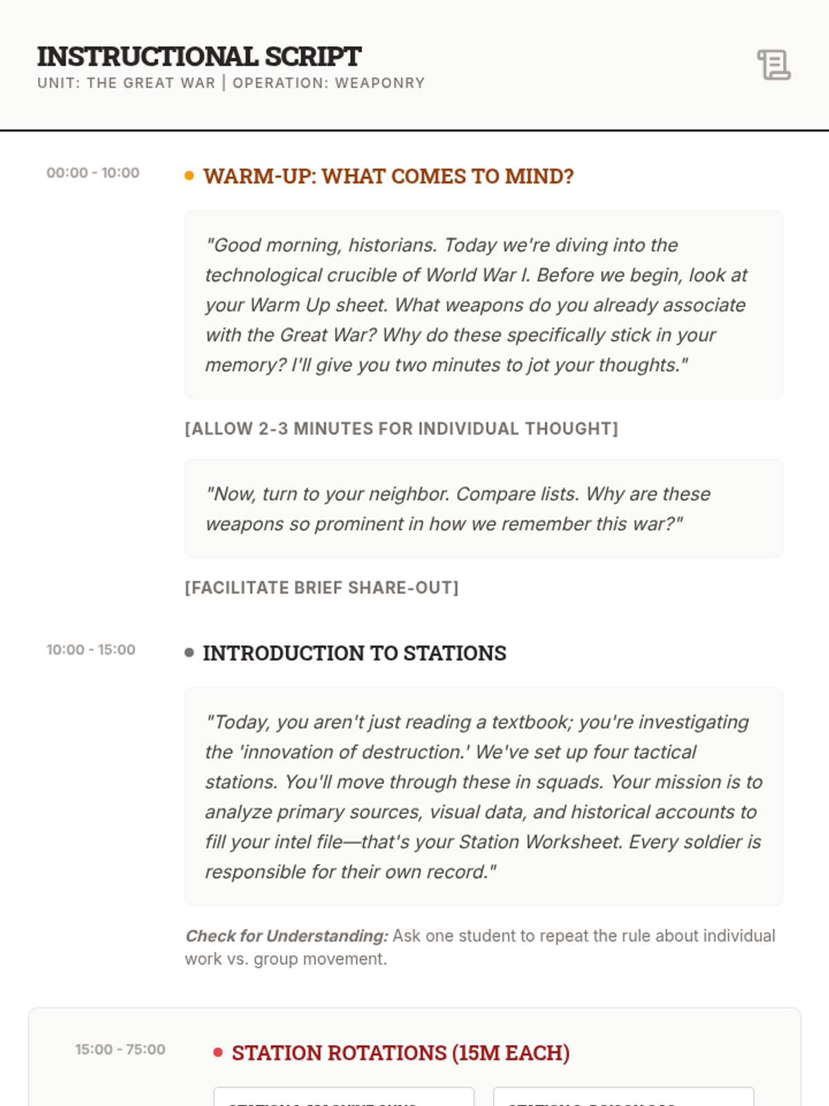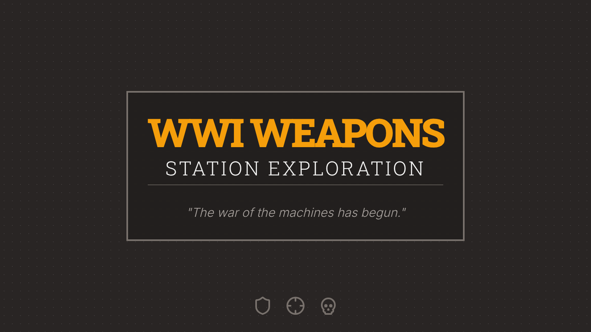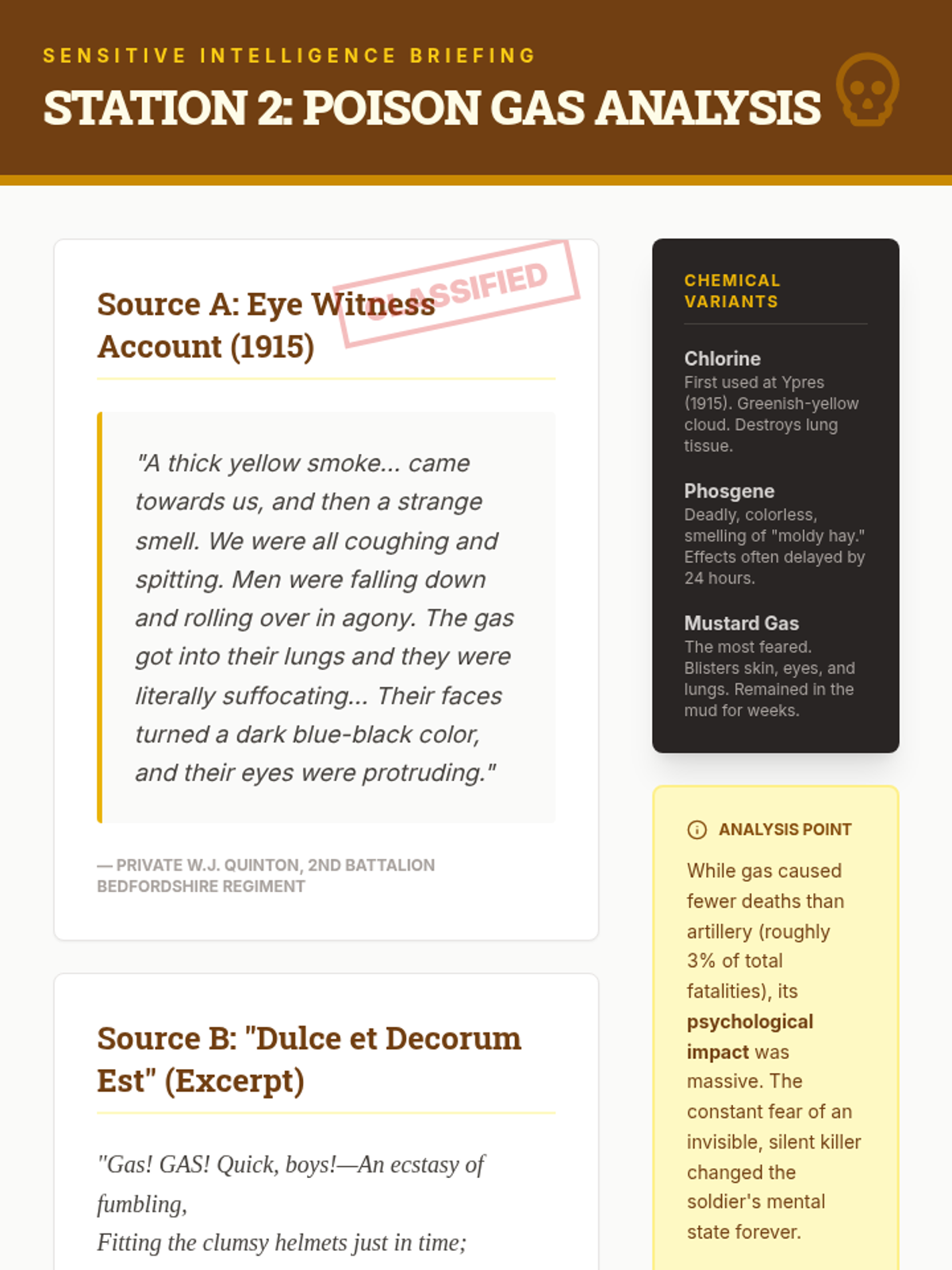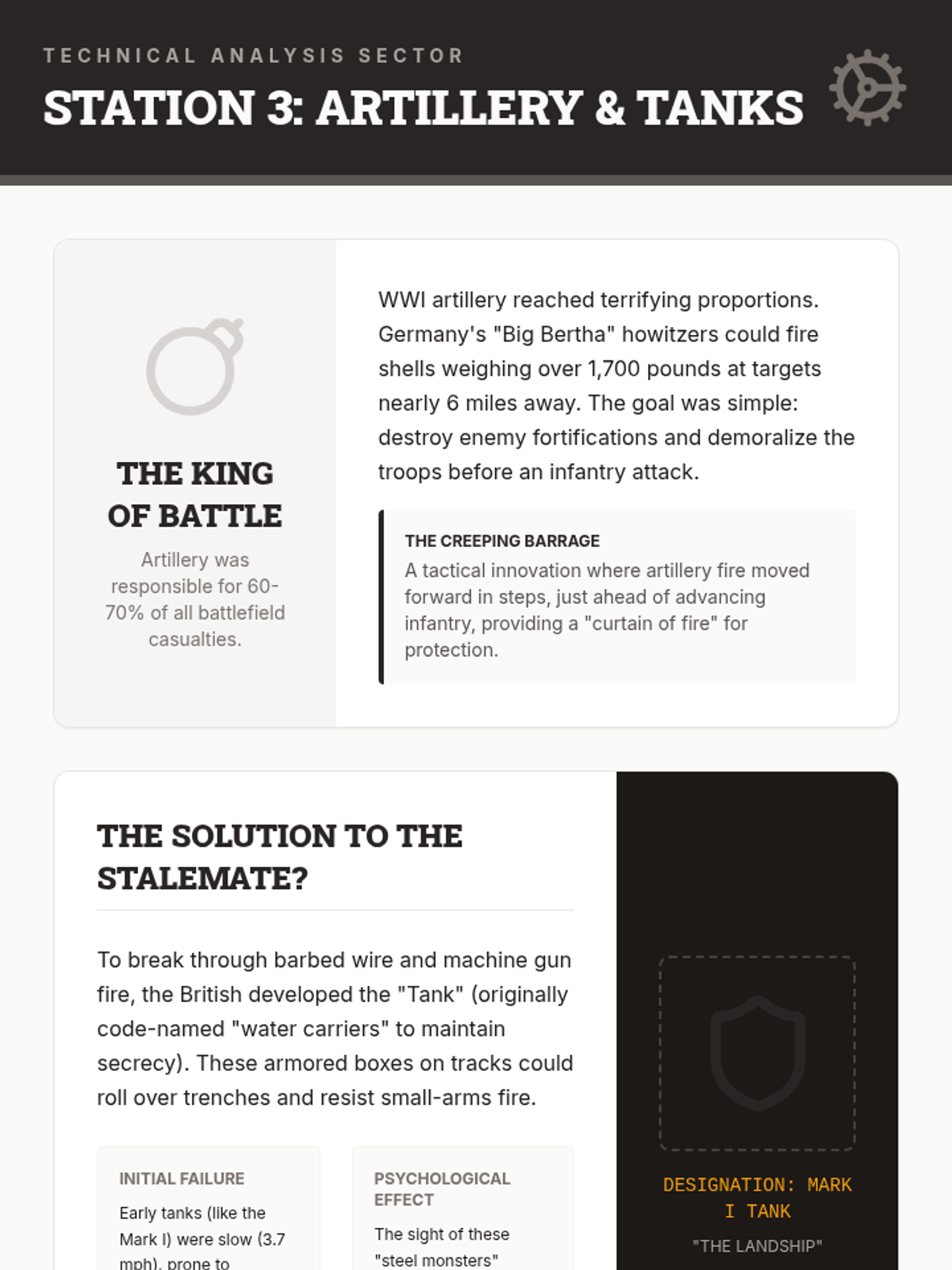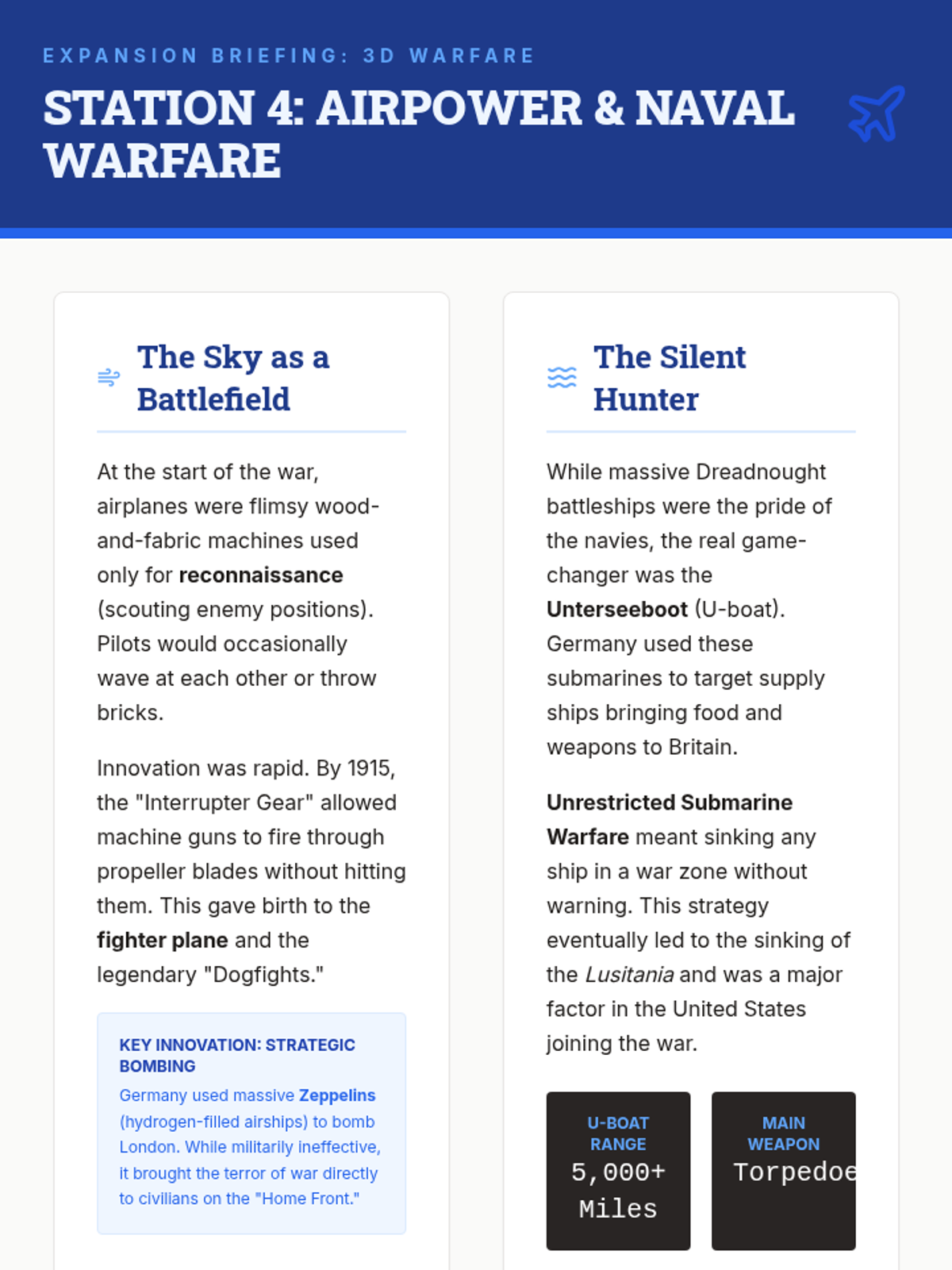An immersive 90-minute station-based exploration of WWI weaponry, technological innovation, and its human cost for 11th-grade history students.