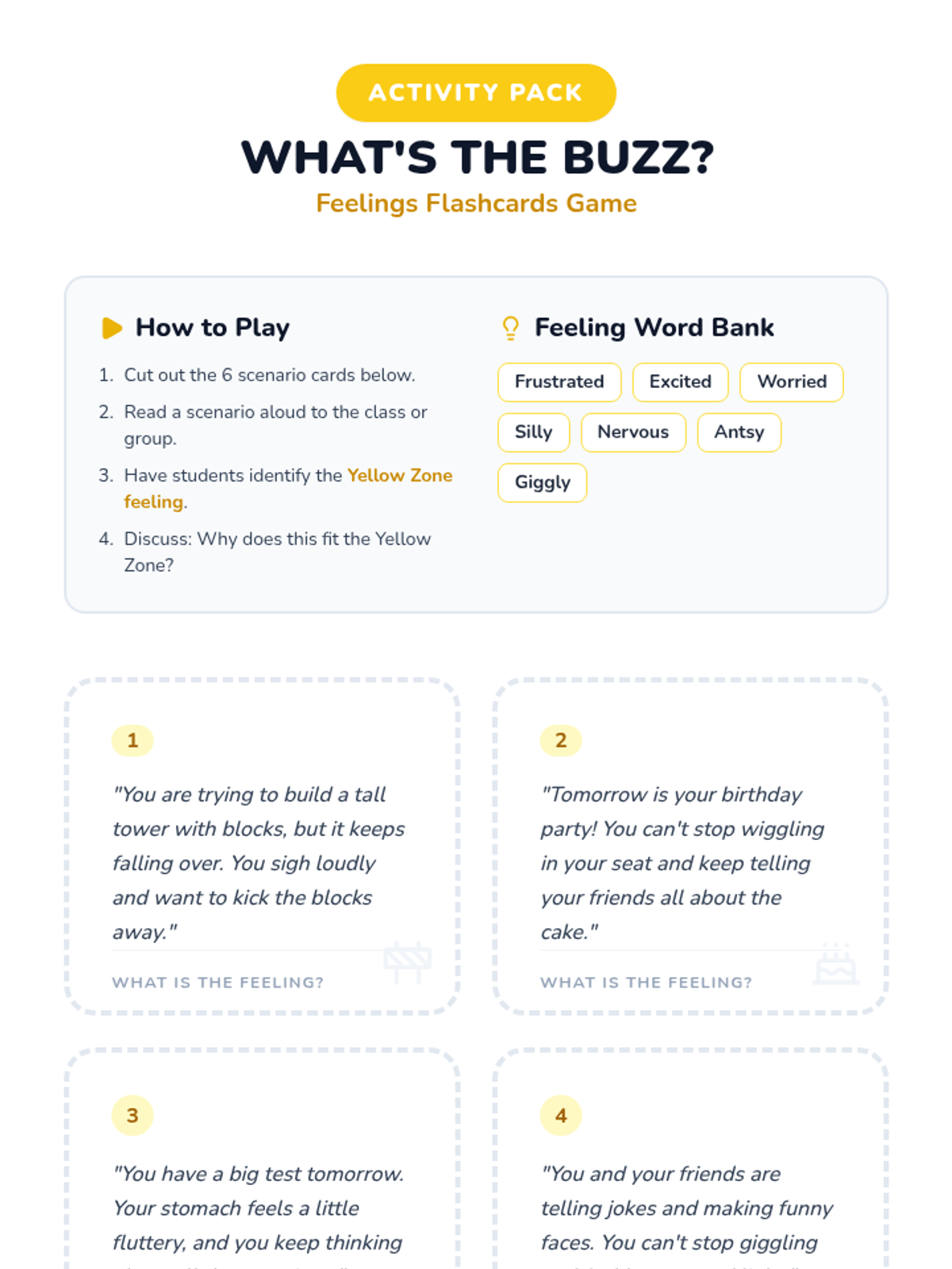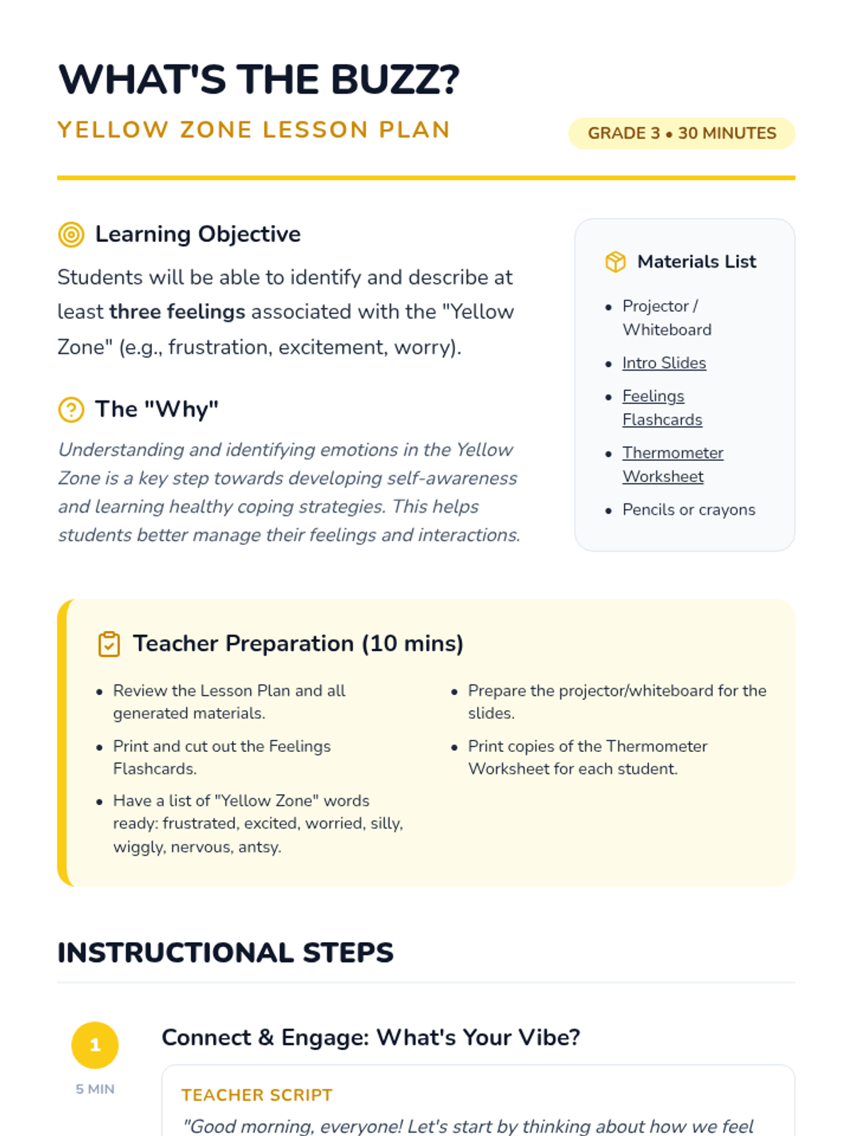 A 30-minute lesson for 3rd graders focused on identifying and understanding 'Yellow Zone' emotions like frustration, excitement, and worry using a bumblebee theme.