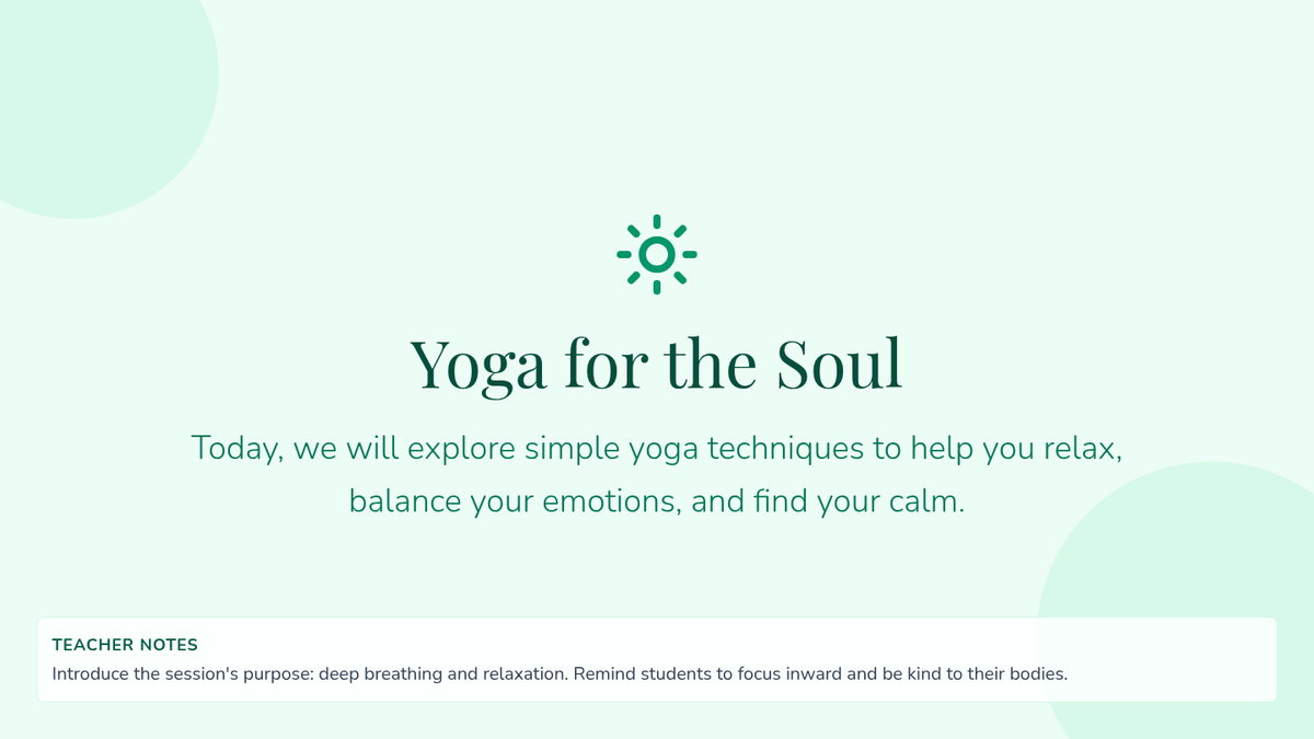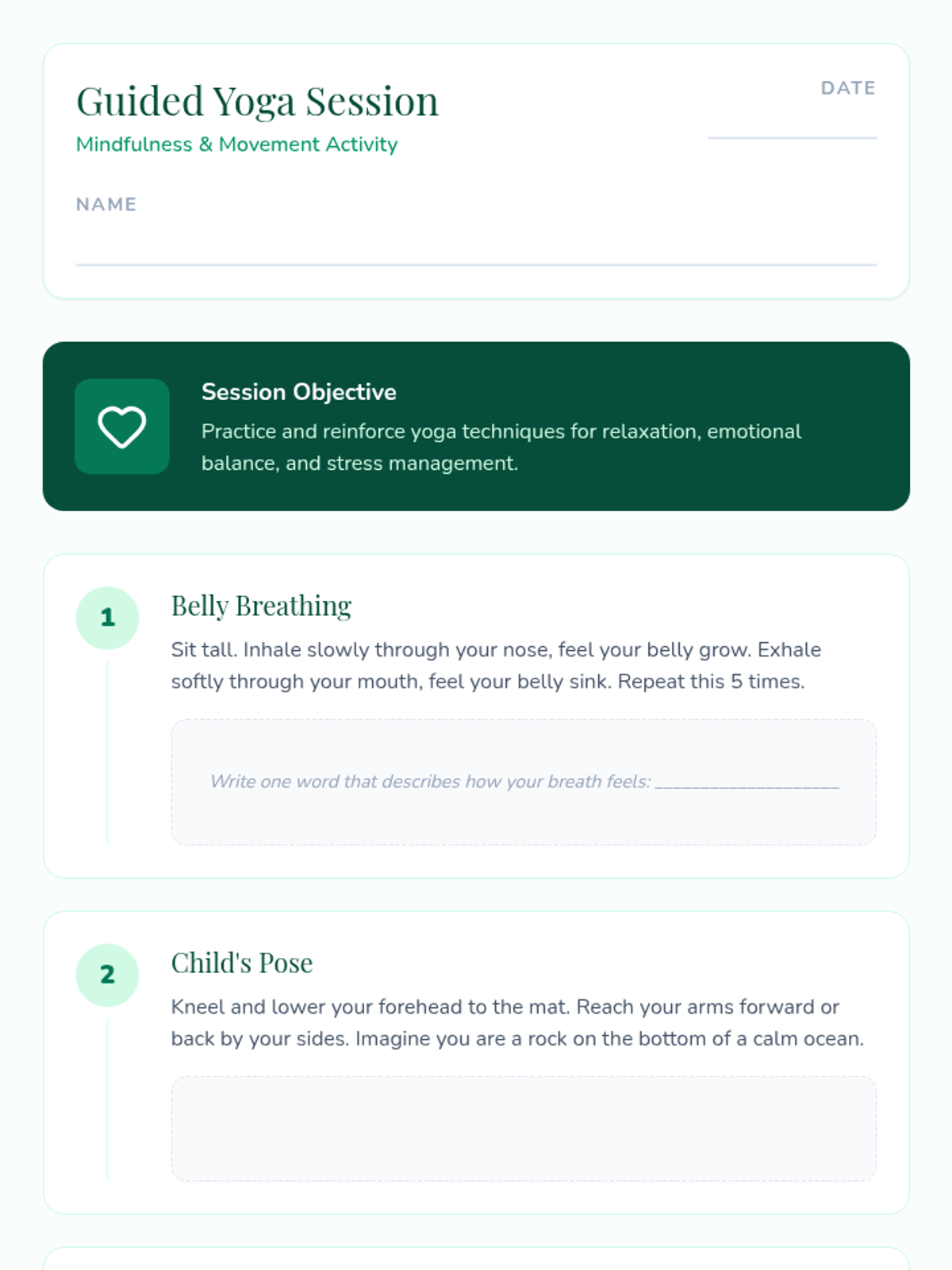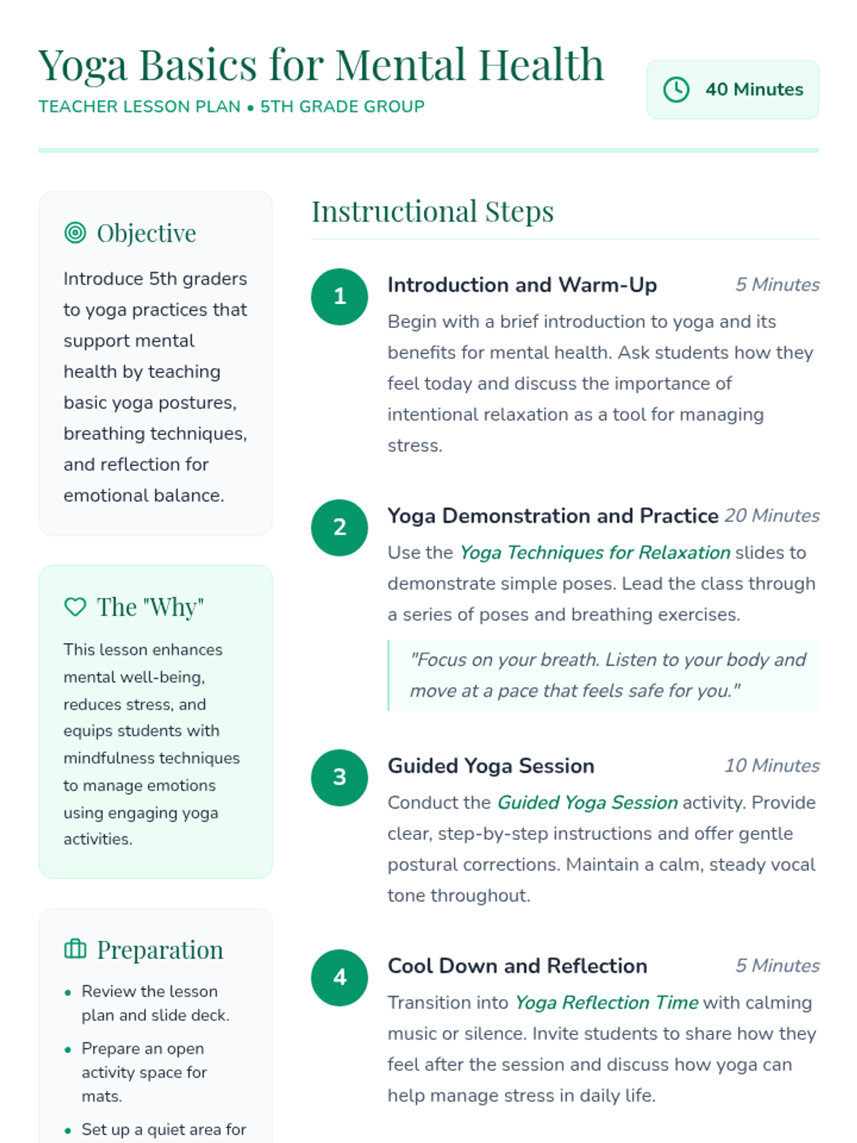 A 40-minute yoga session for 5th graders focused on mindfulness, breathing techniques, and emotional balance to support mental health.