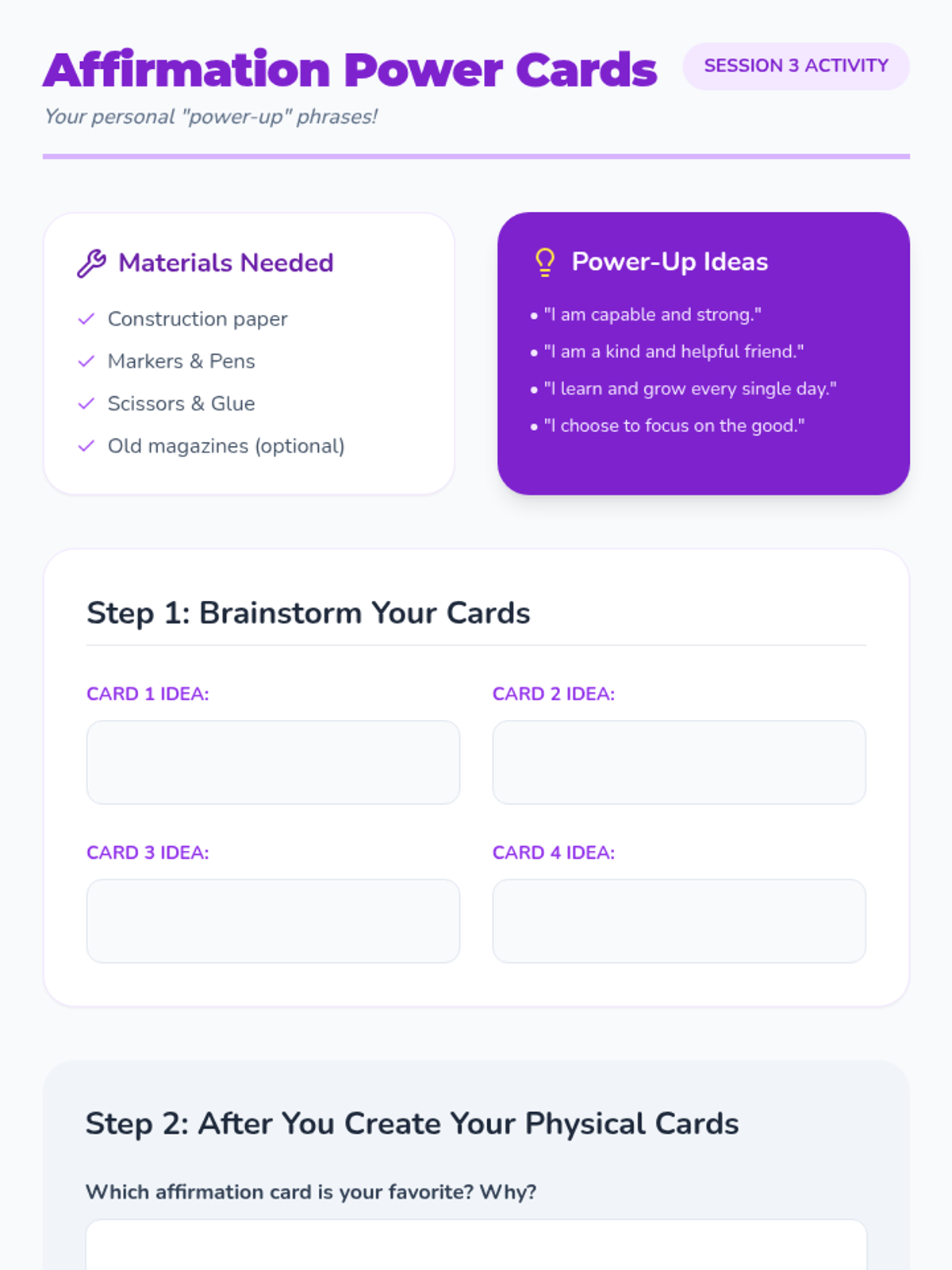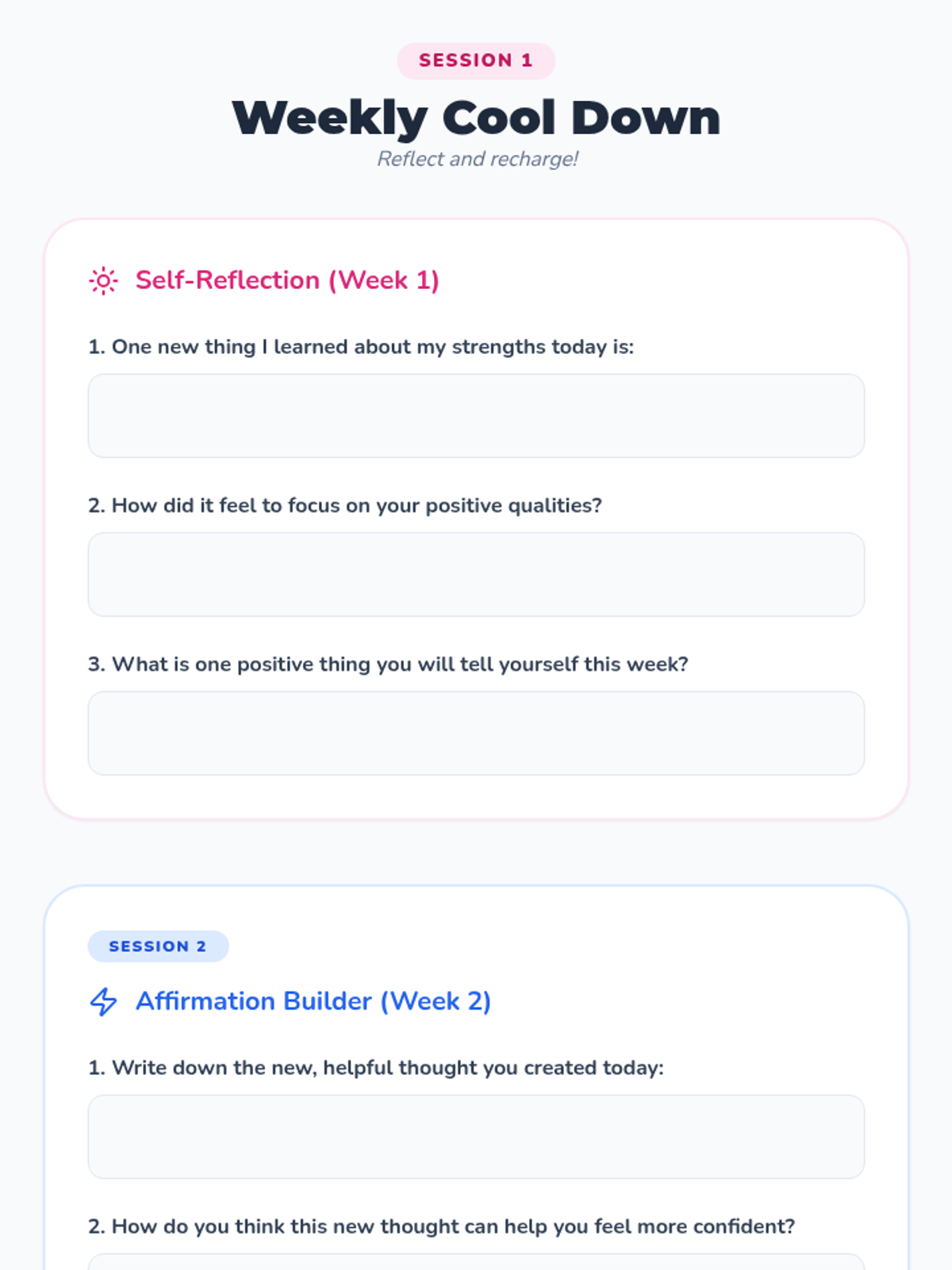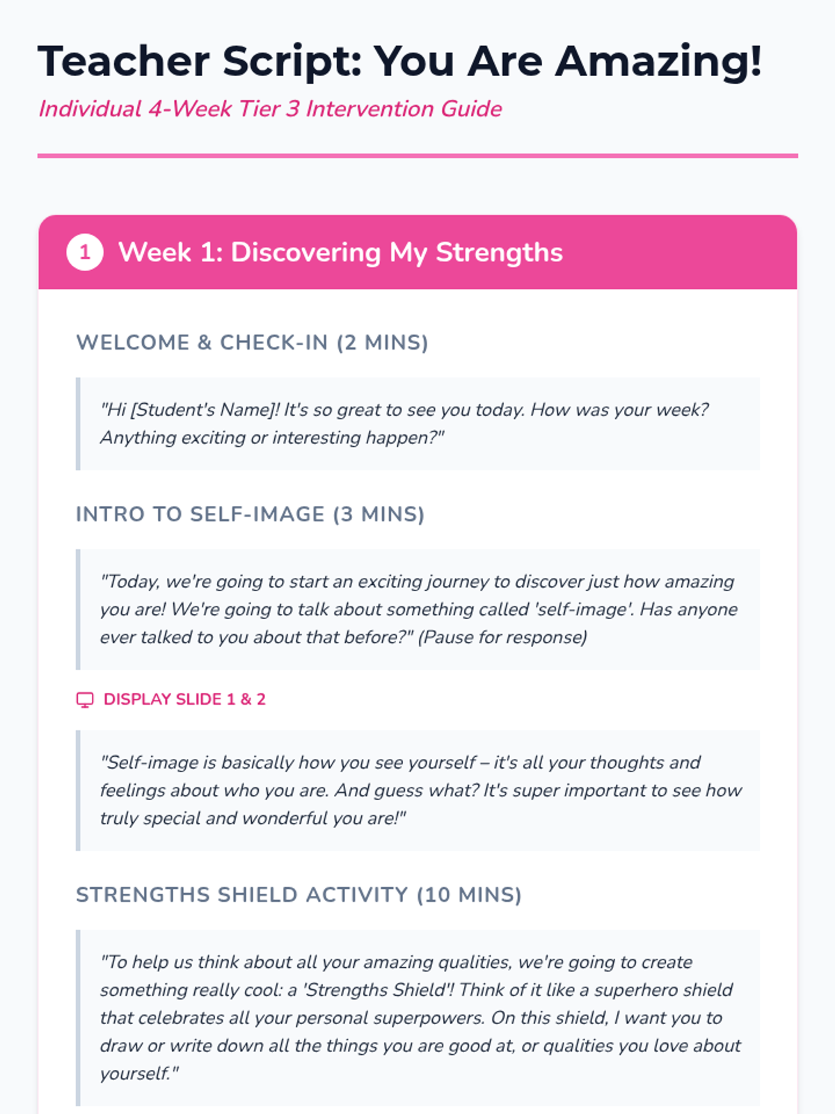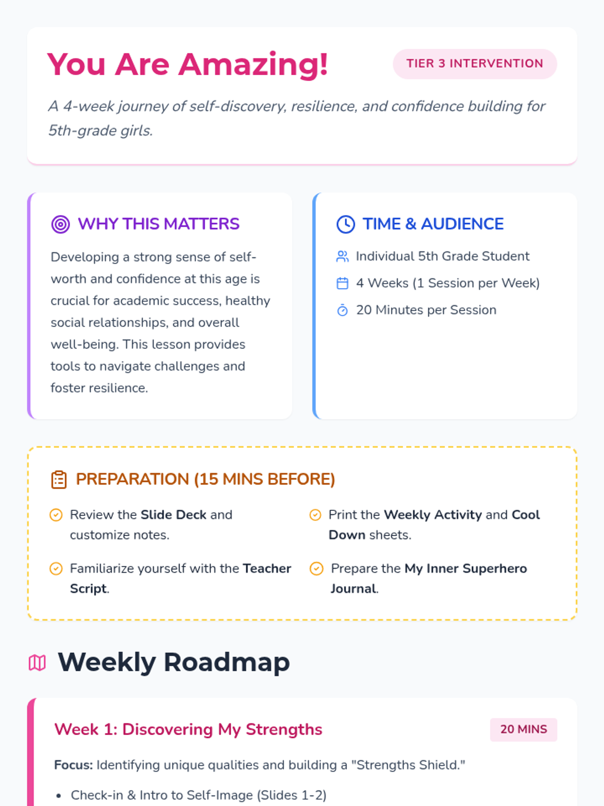 A 4-week Tier 3 intervention for 5th-grade girls focused on building self-esteem, identifying strengths, and reframing negative self-talk through creative activities and reflection.
