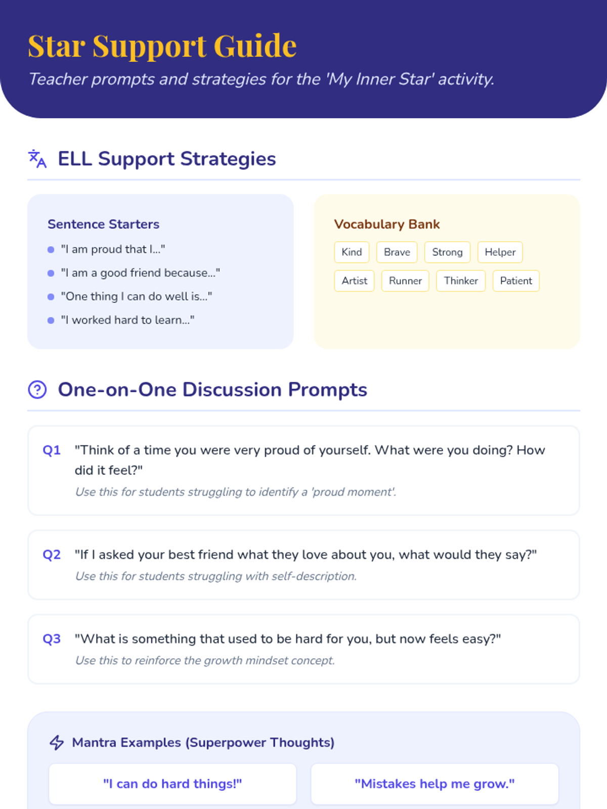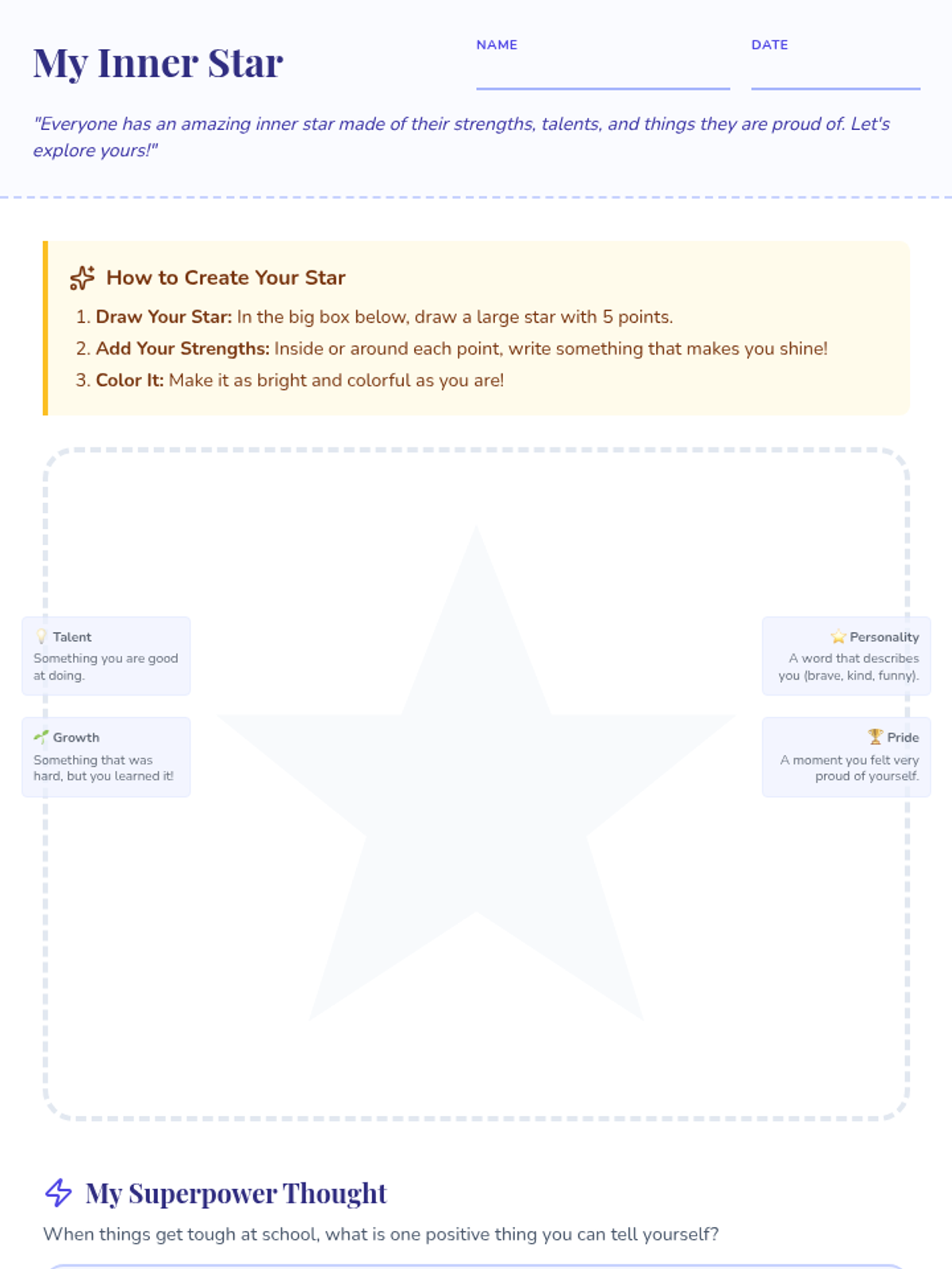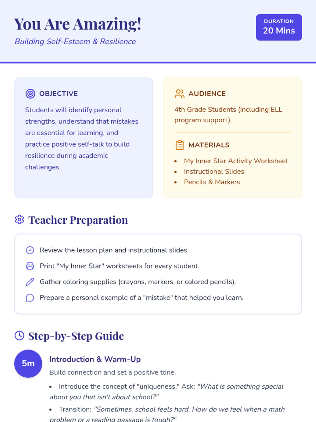 A 20-minute lesson for 4th-grade students to build self-esteem, foster a growth mindset, and develop strategies for overcoming academic challenges through the 'My Inner Star' activity.