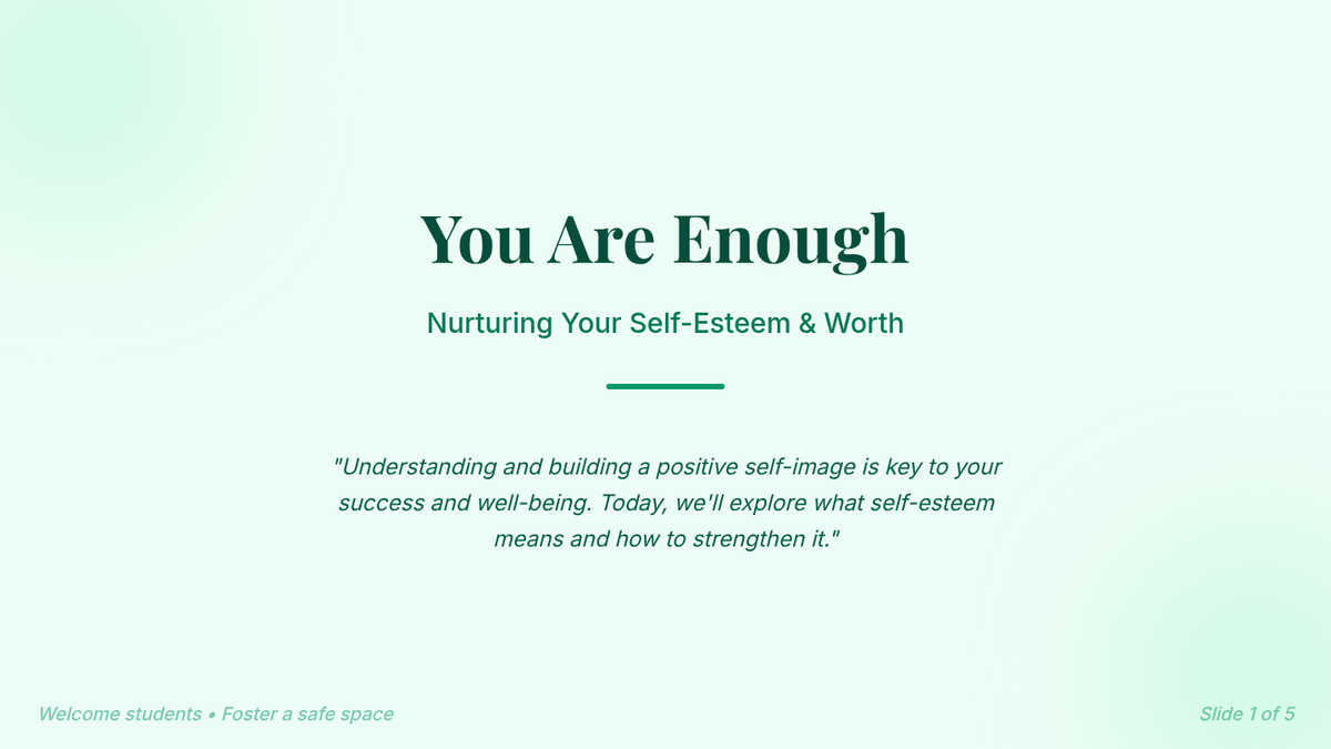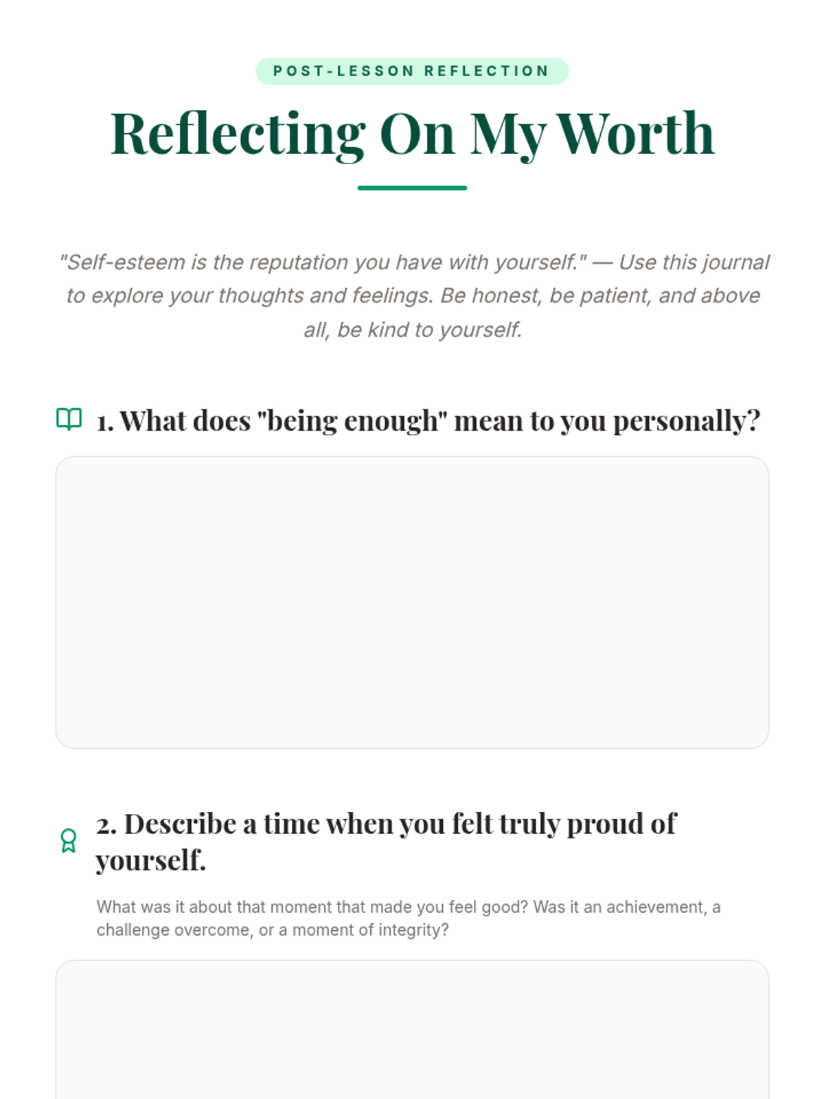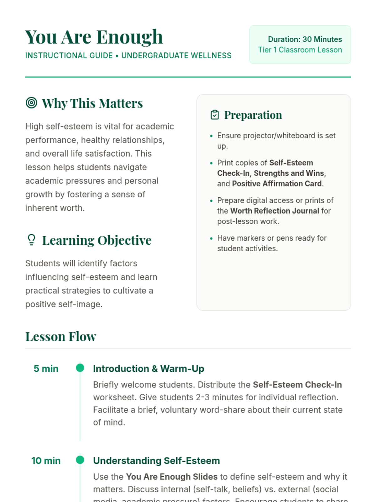 A 30-minute lesson for undergraduate students focused on defining self-esteem, identifying internal and external influences, and developing practical strategies to cultivate a positive self-image and inherent worth.