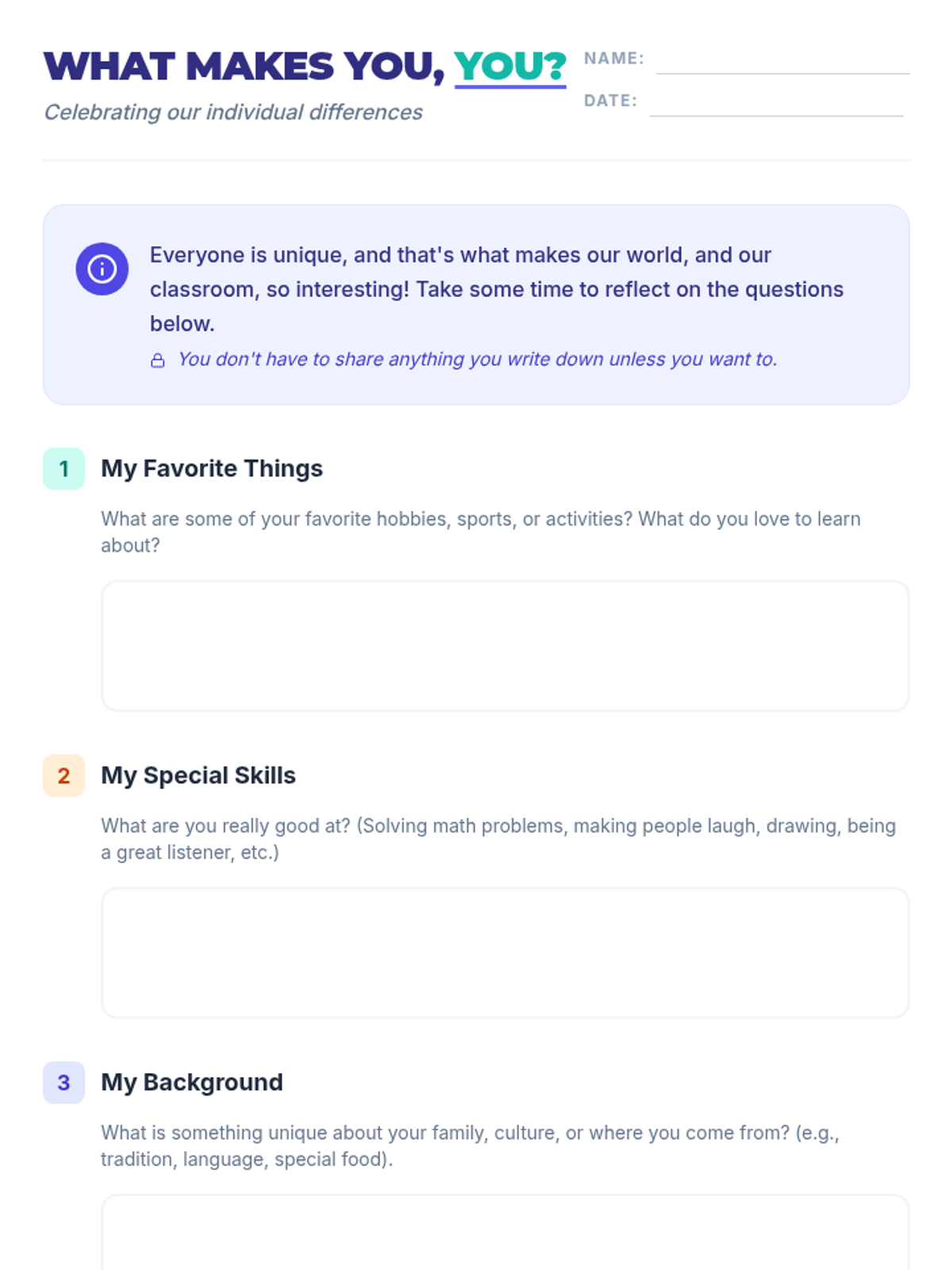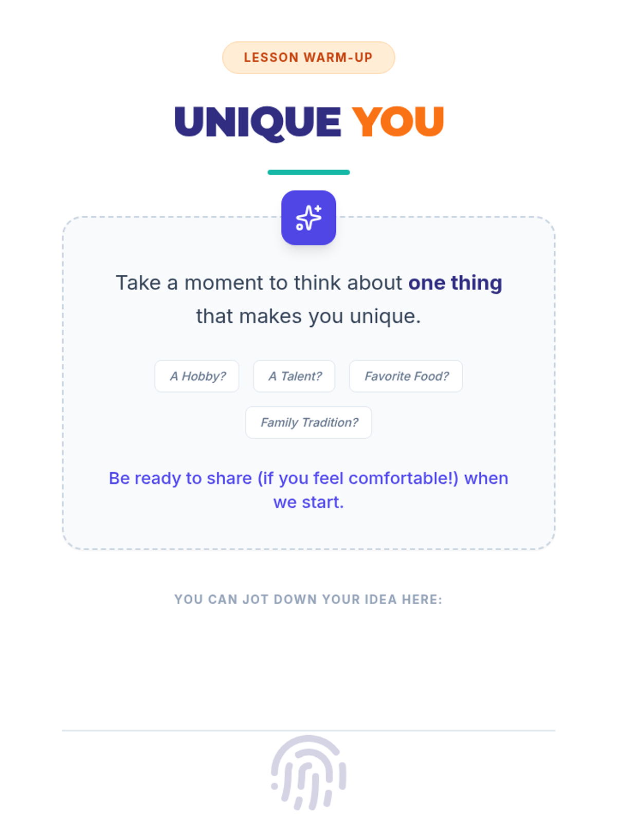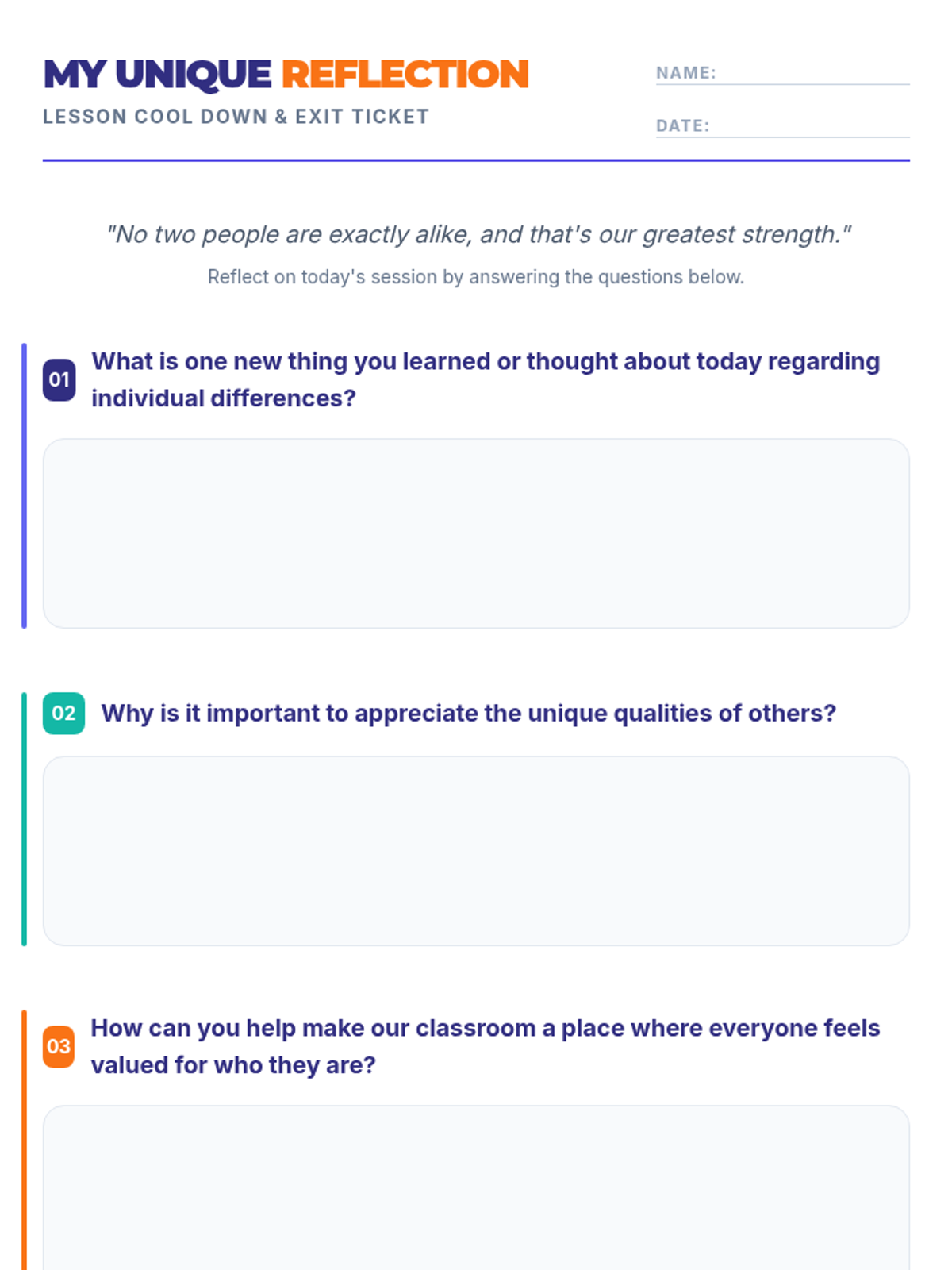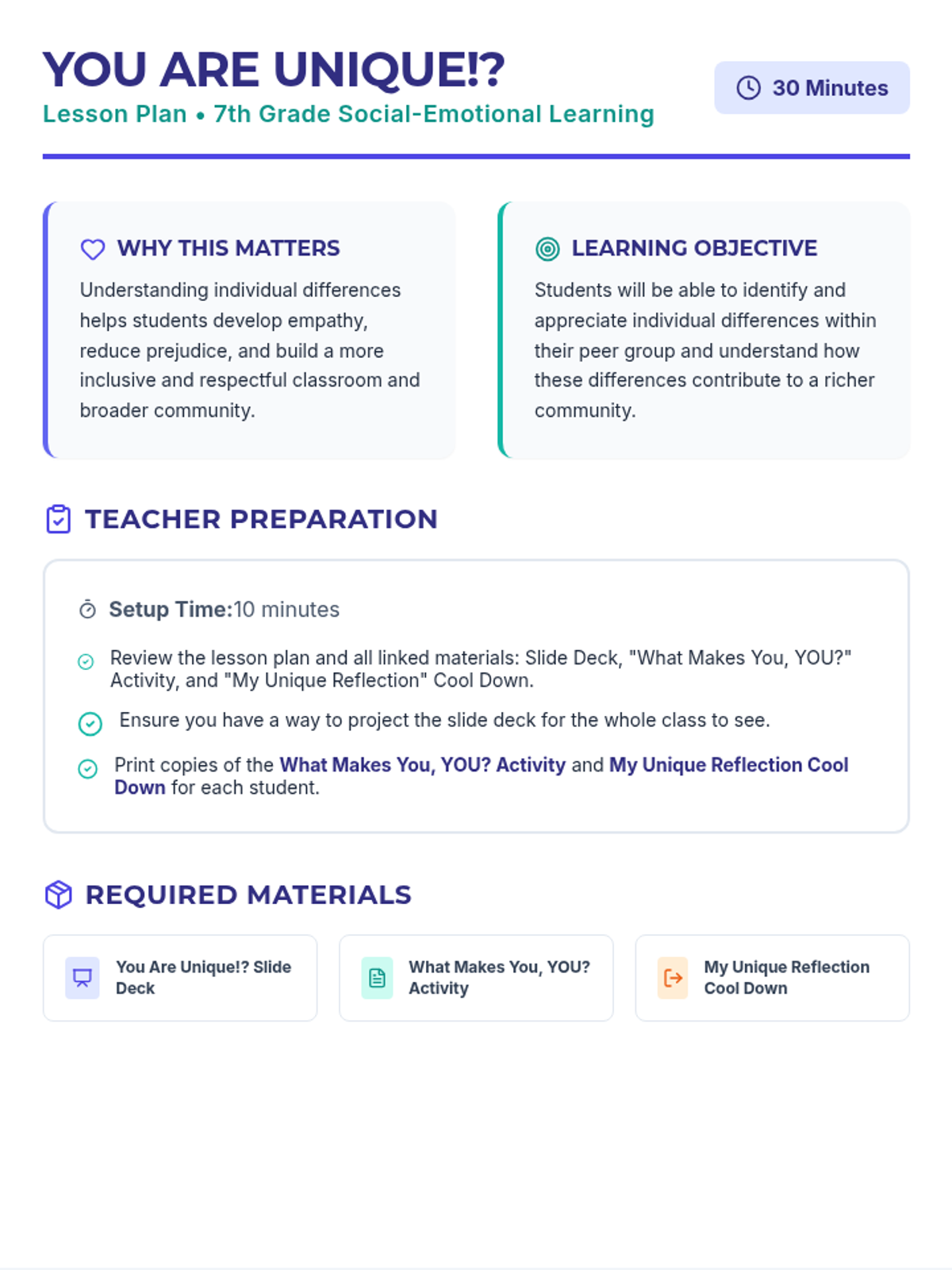 A 30-minute lesson for 7th graders to explore individual differences, fostering empathy and classroom inclusivity through discussion and self-reflection.