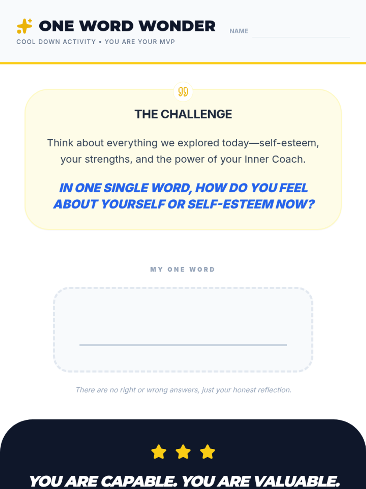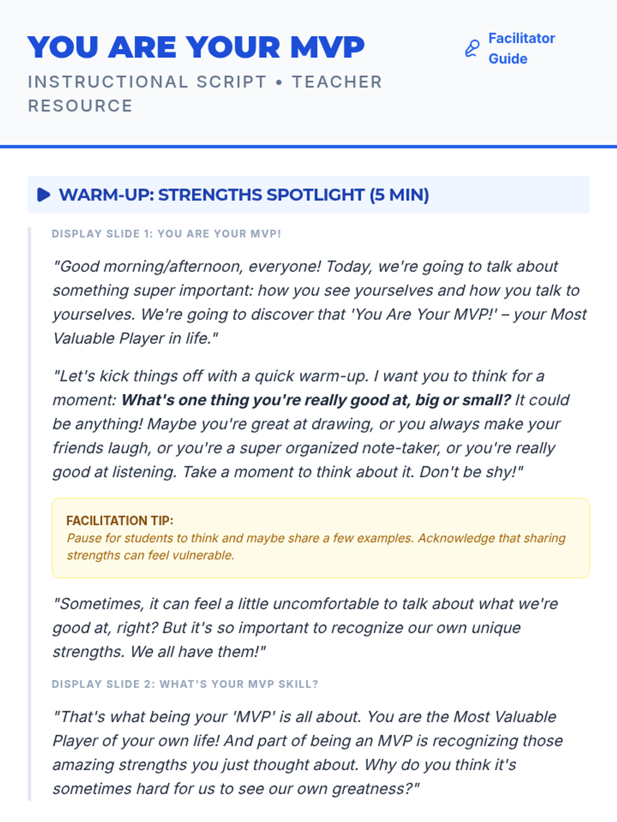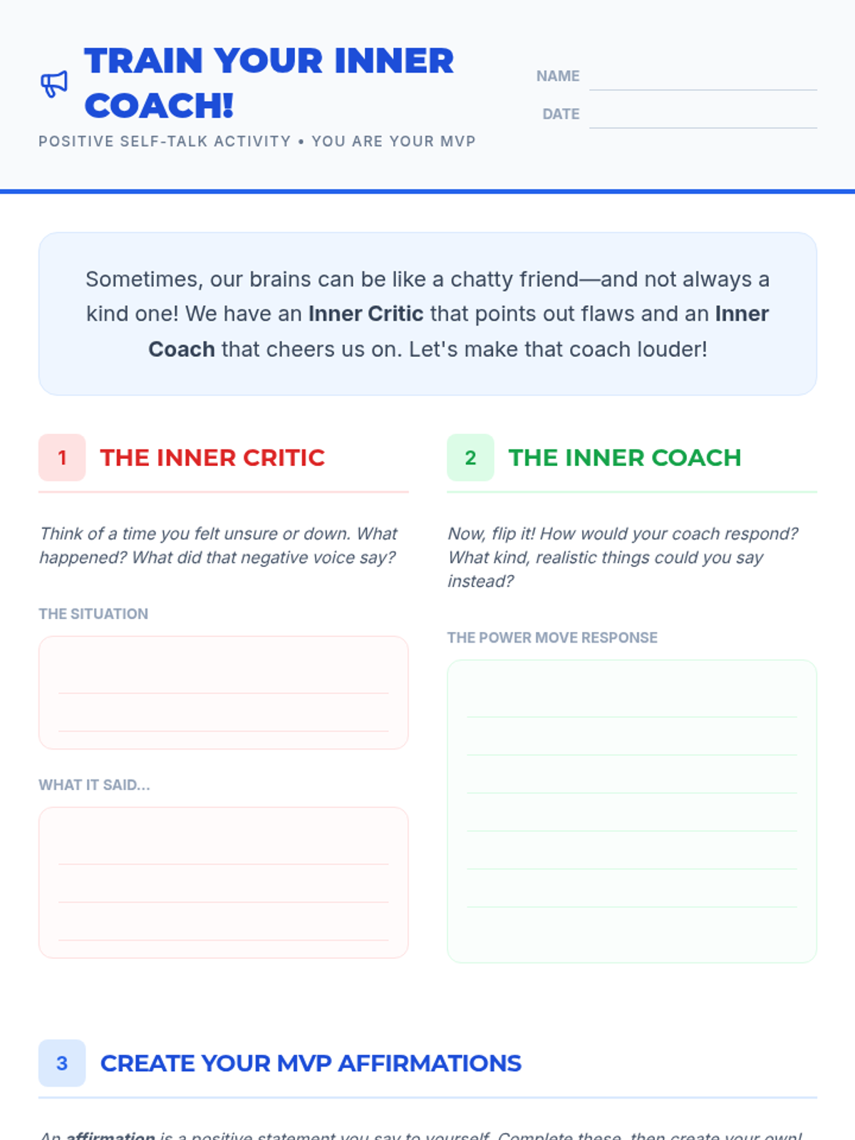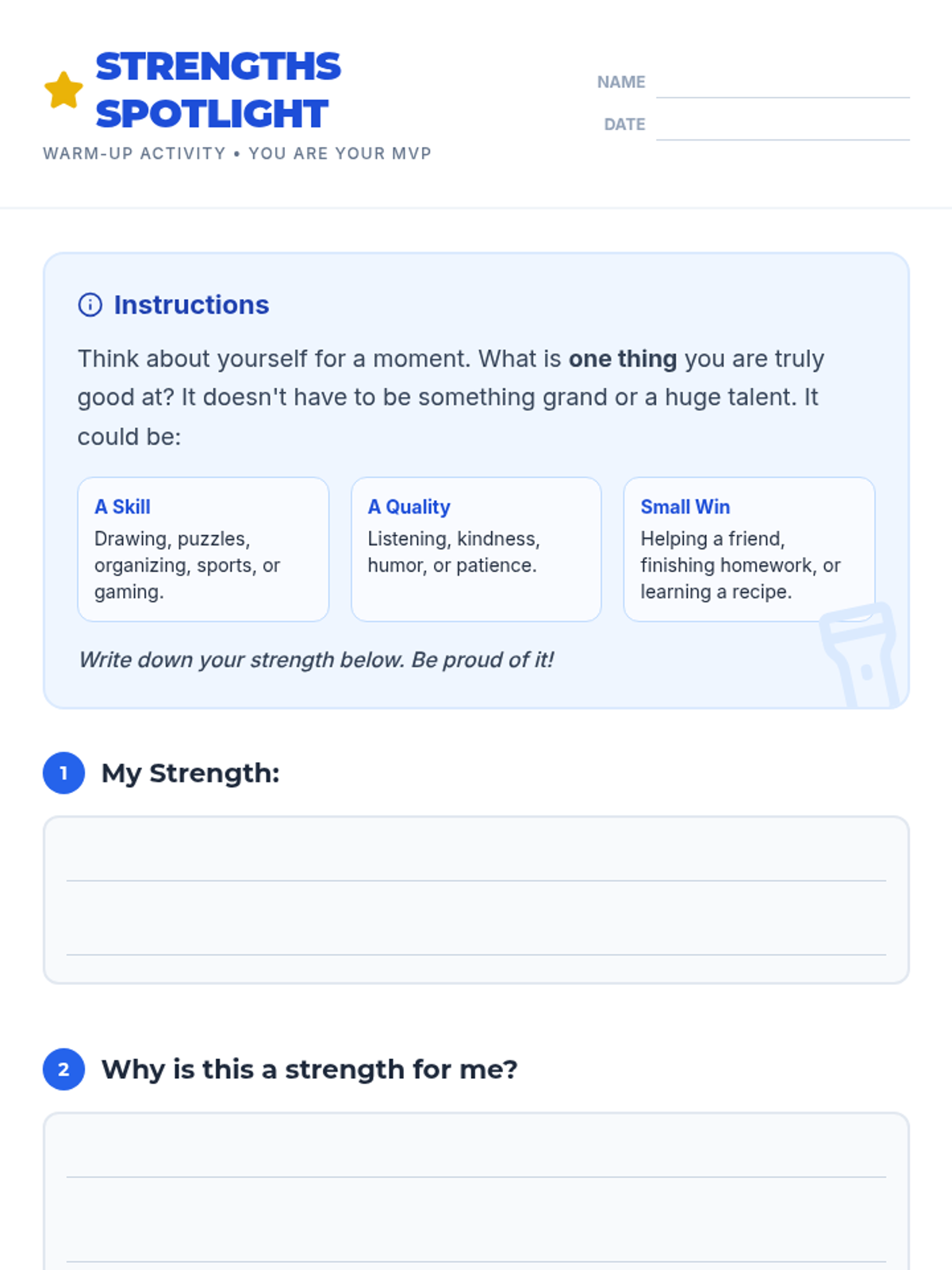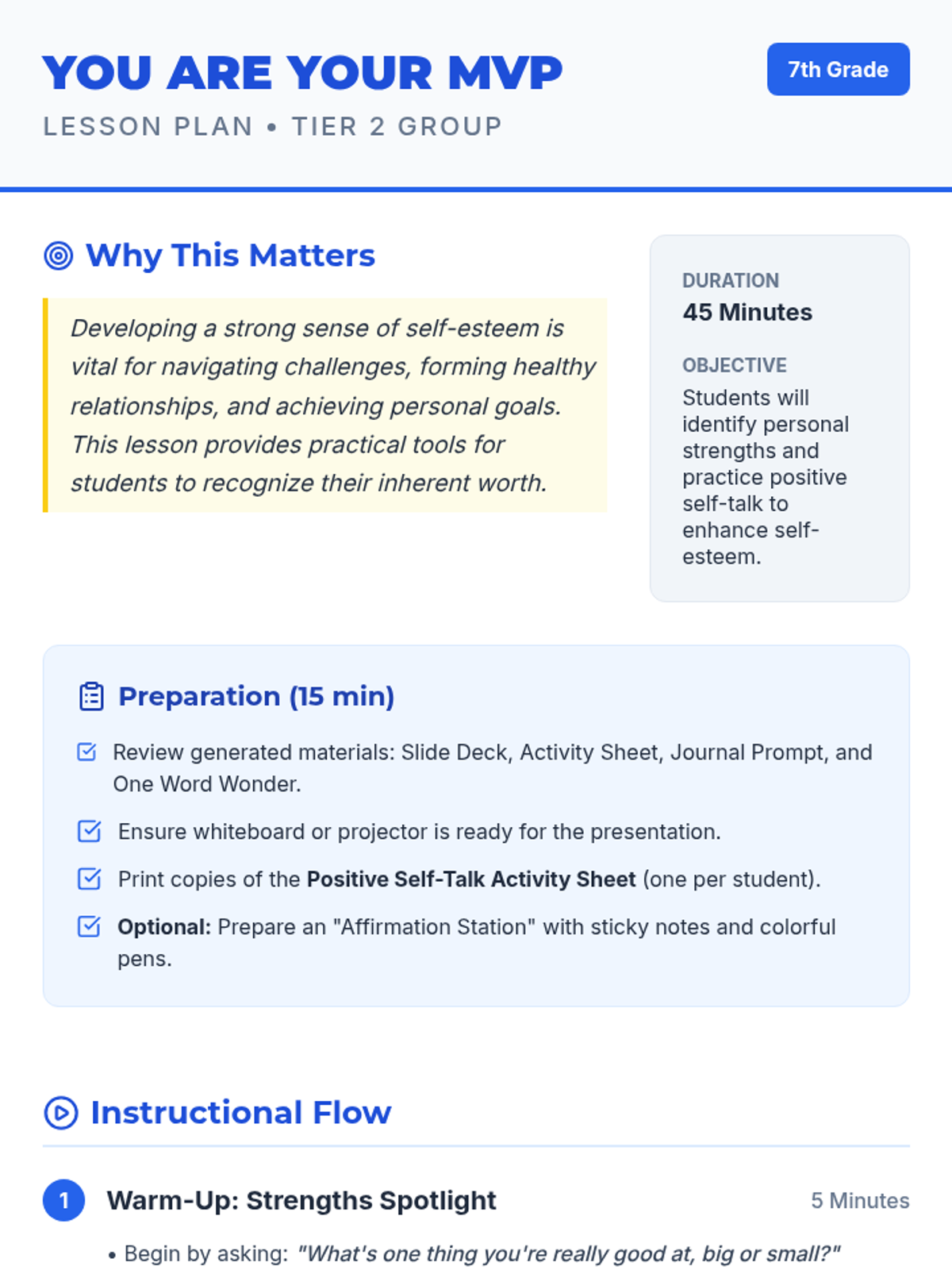 A 45-minute lesson for 7th-grade students focusing on building self-esteem through identifying personal strengths and practicing positive self-talk. Students will learn the difference between their inner critic and inner coach.