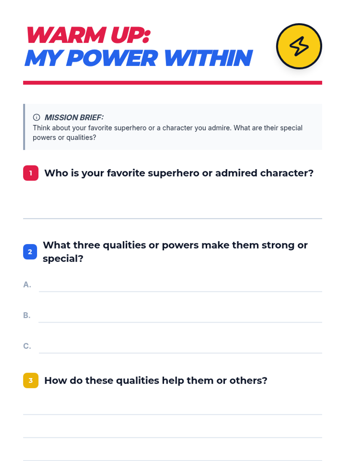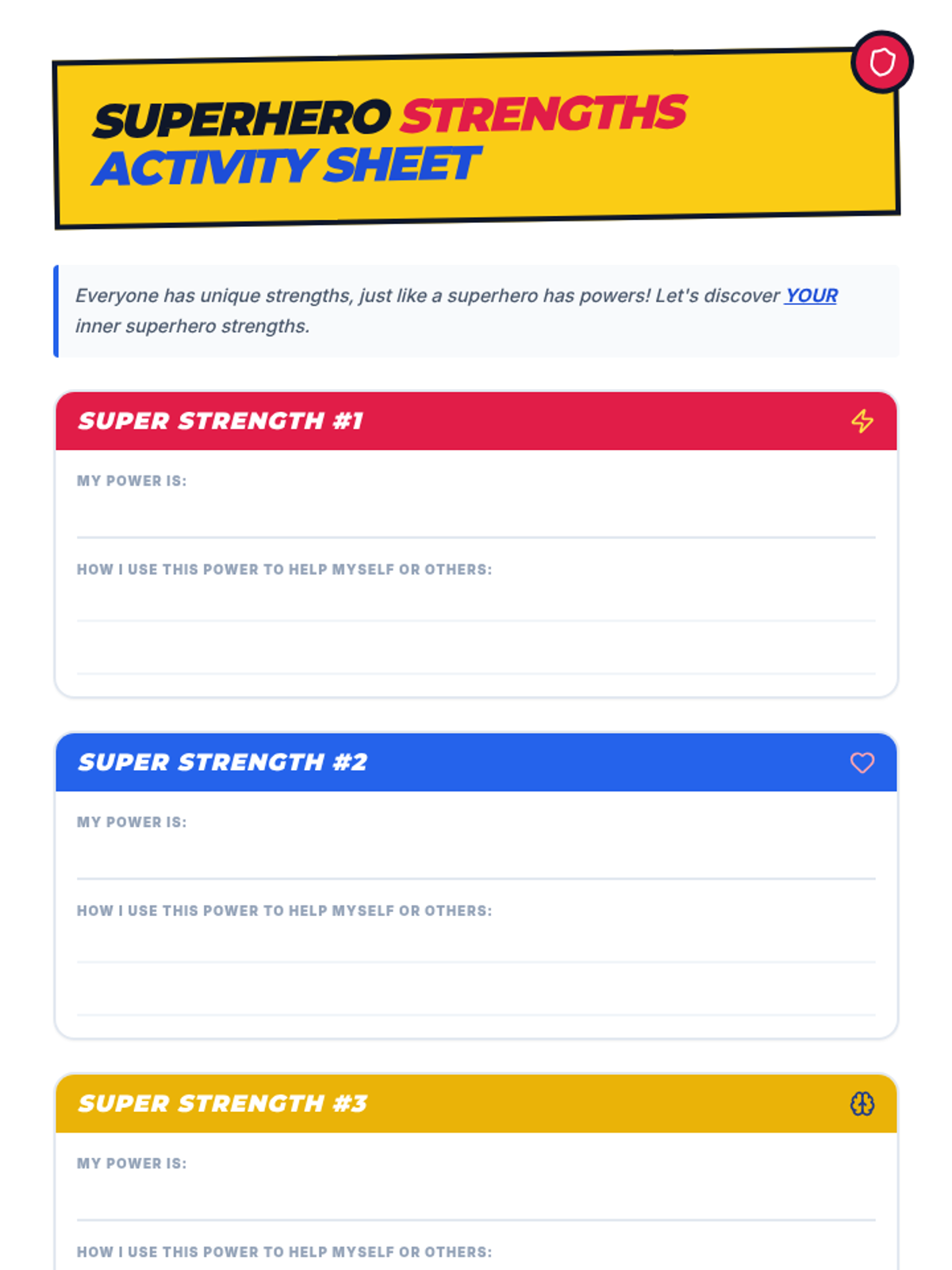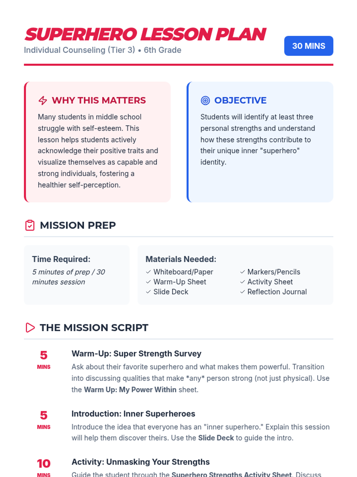 A 30-minute individual counseling session for 6th-grade students to build self-esteem by identifying personal strengths and 'superhero' qualities. Students explore their unique values through creative activities and reflection.