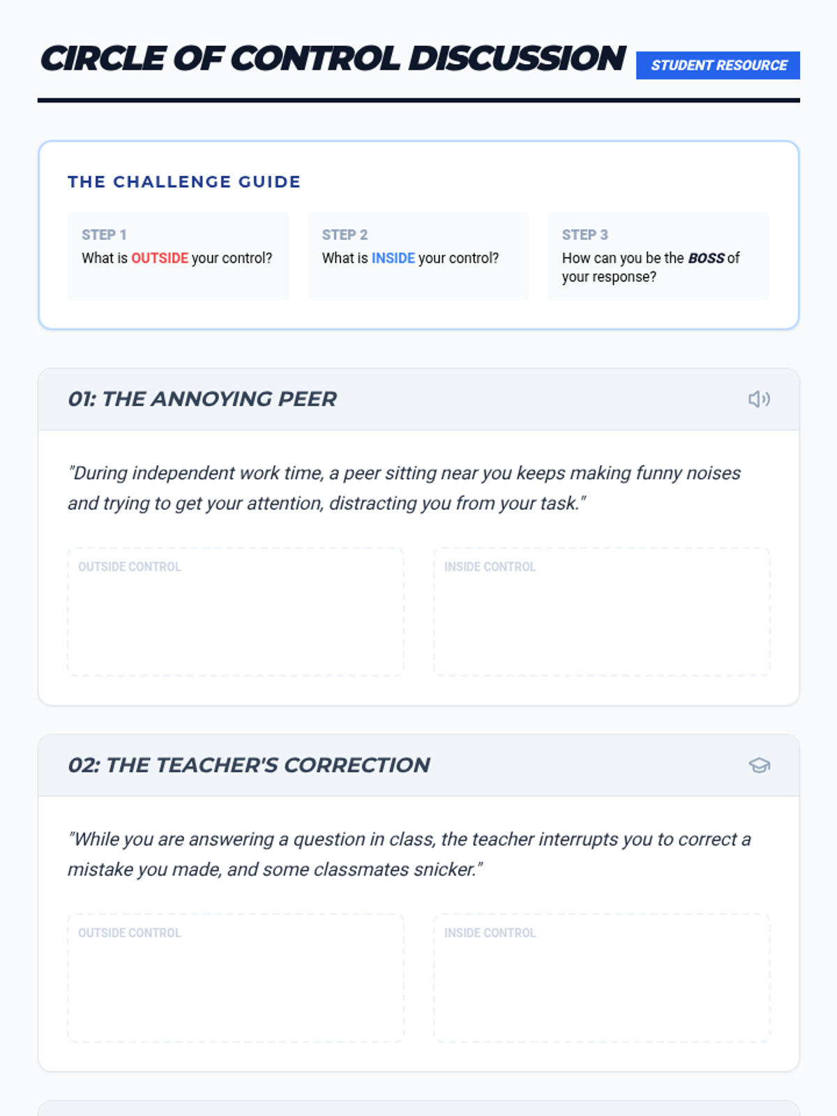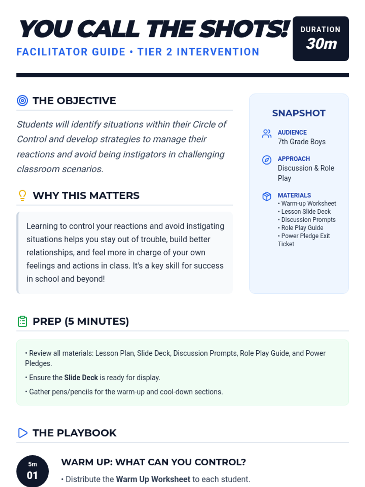 A 30-minute Tier 2 lesson for 7th-grade boys focused on identifying what is within their Circle of Control to manage reactions and avoid instigating classroom conflict.