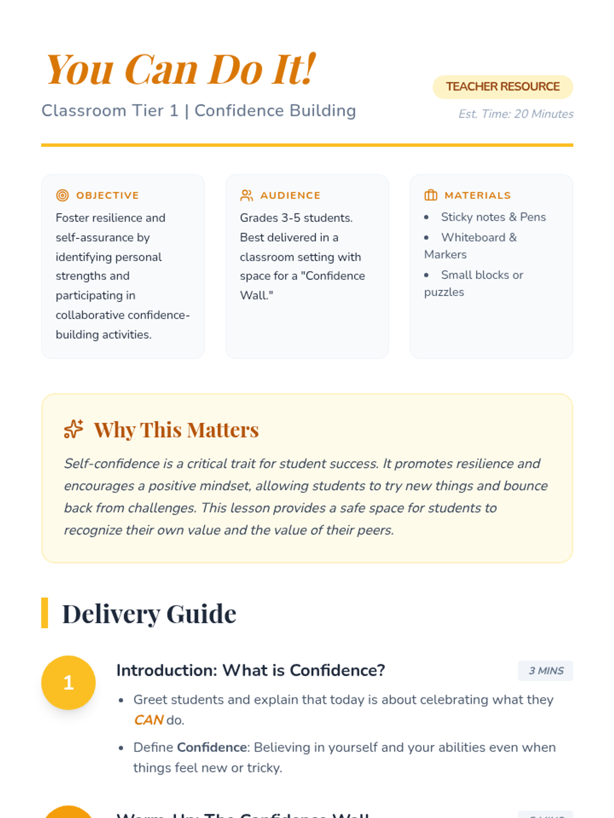 This lesson focuses on building confidence in students through interactive activities, promoting resilience and a positive mindset in grades 3-5. Students will identify their strengths and participate in collaborative exercises to foster self-assurance.