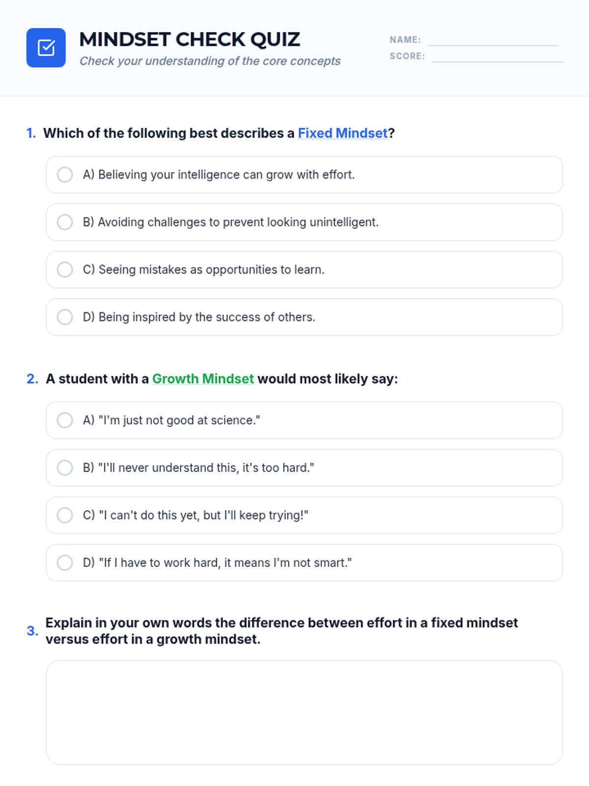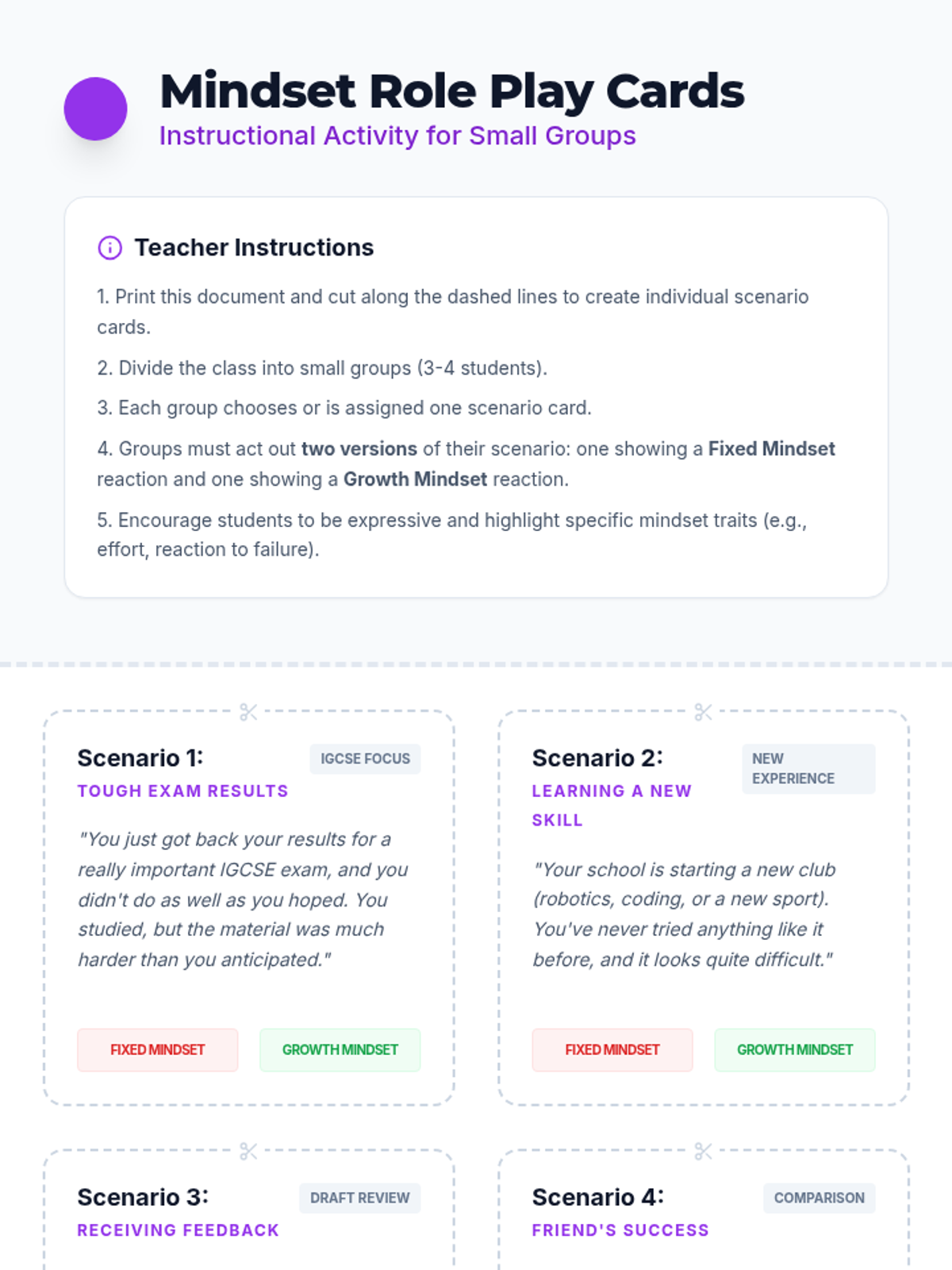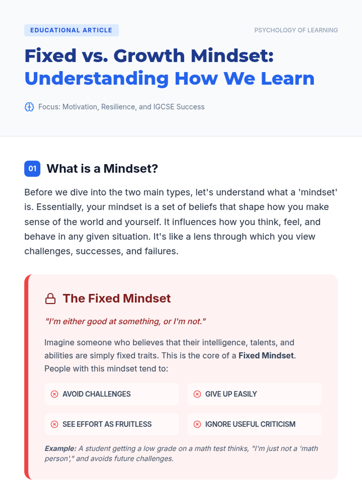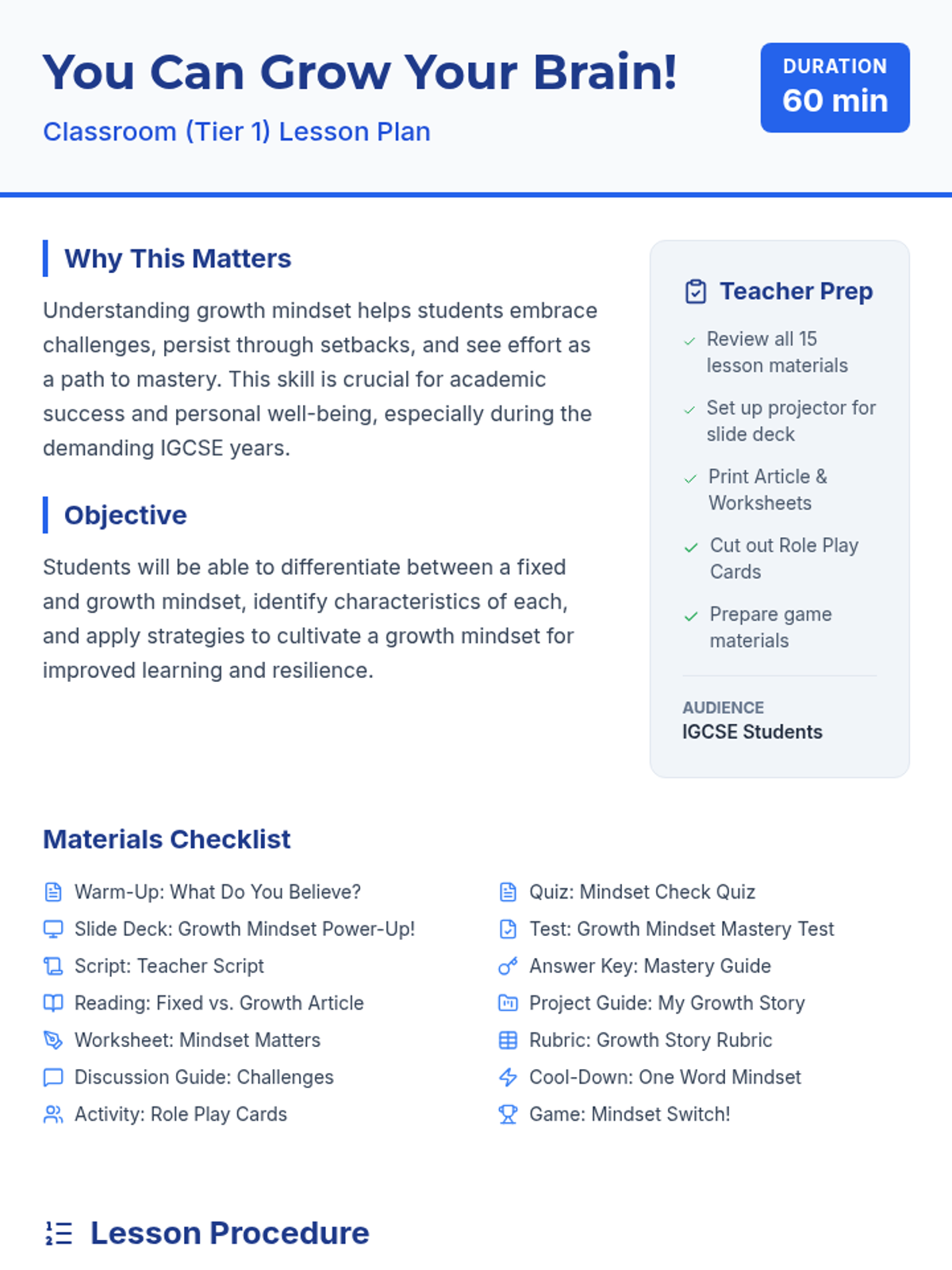 A 60-minute introductory lesson for IGCSE students on growth mindset, covering fixed vs. growth mindsets, the power of 'yet', and practical strategies for resilience.