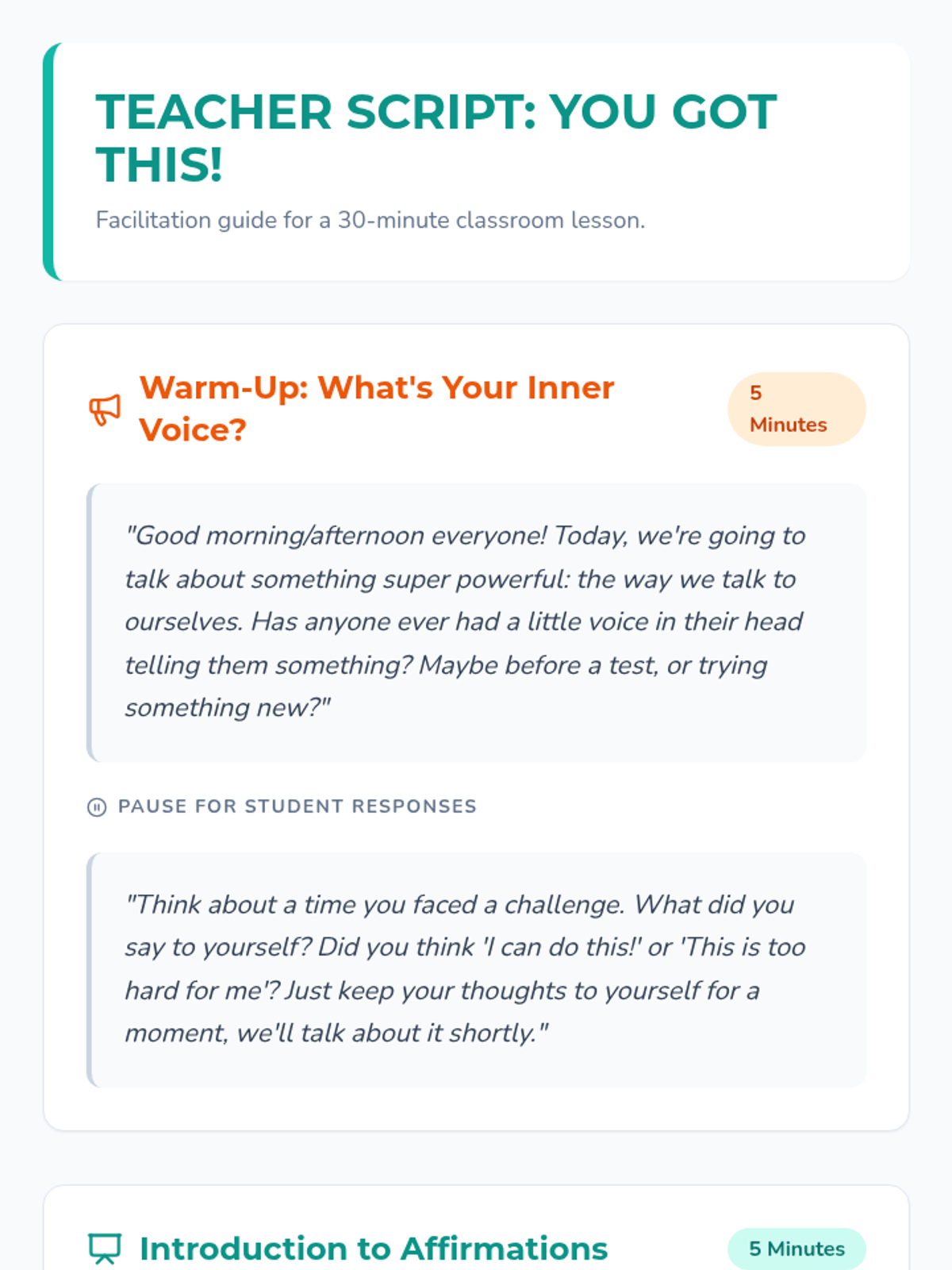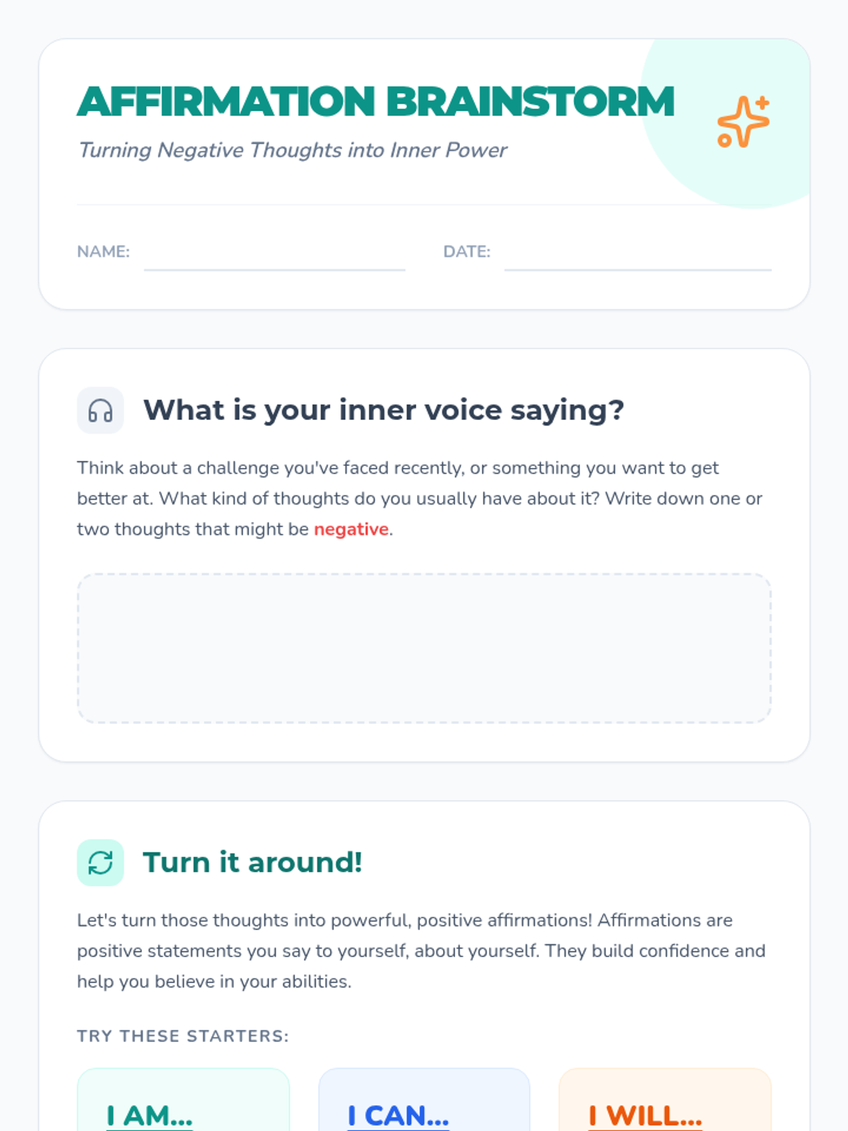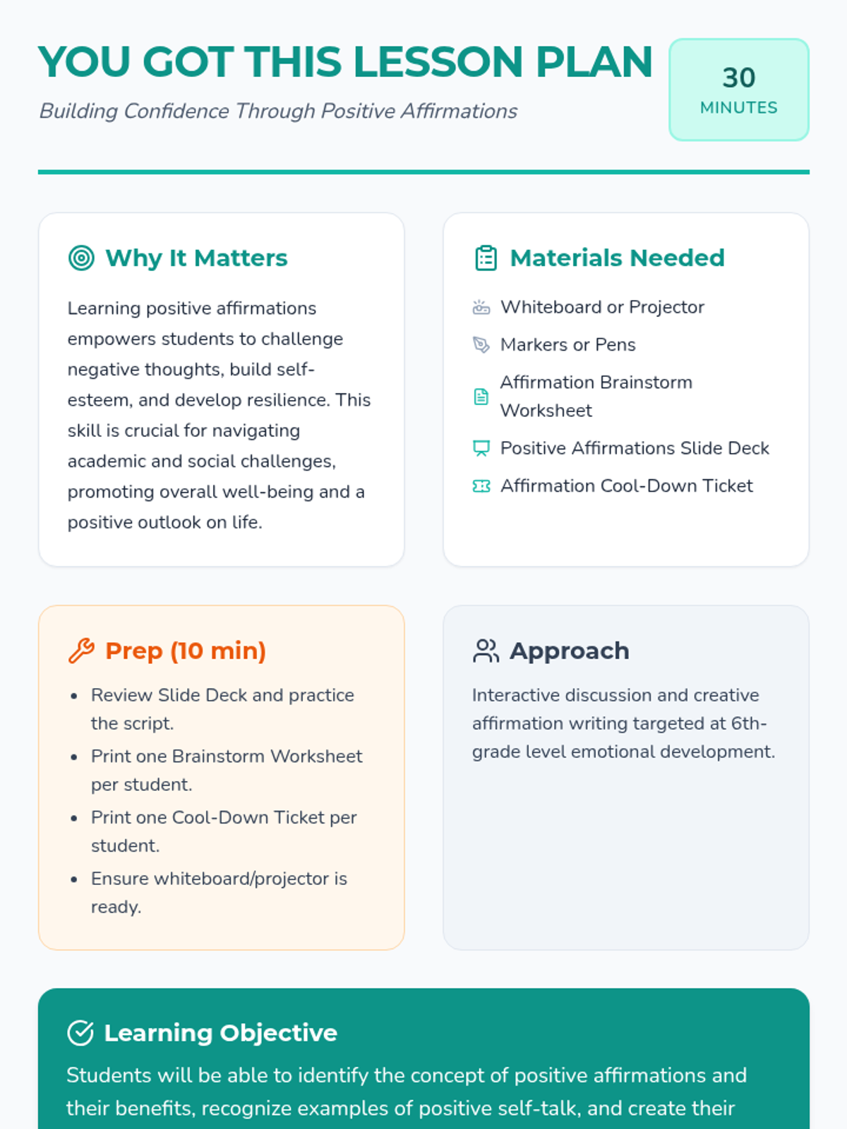 A 30-minute lesson for 6th-grade students to explore the power of positive affirmations, recognize negative self-talk, and create personal empowering statements.