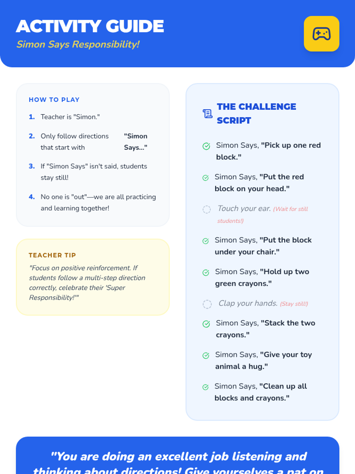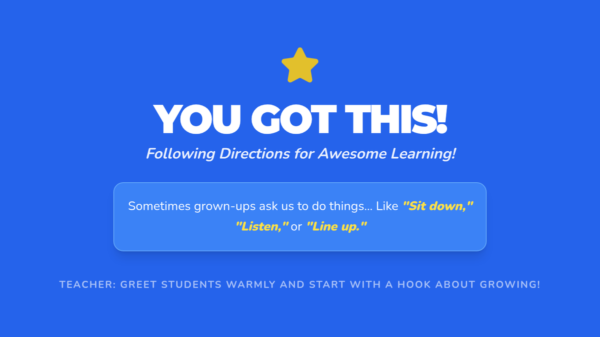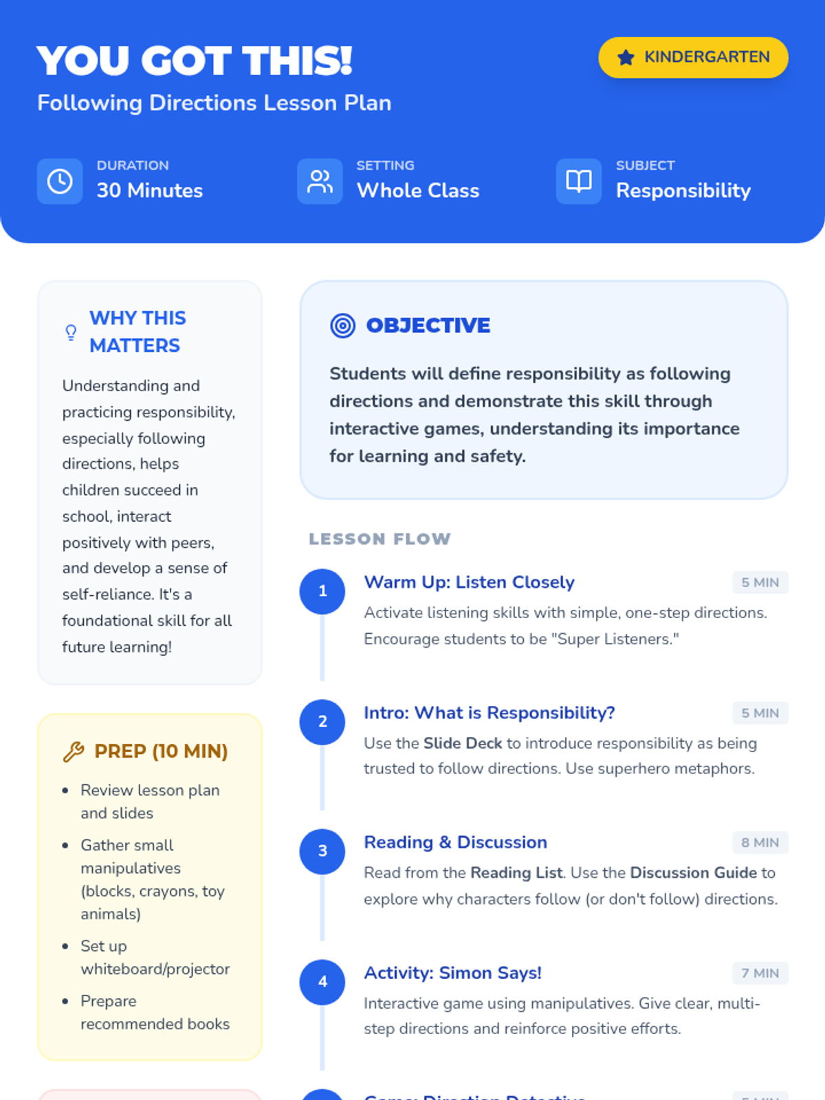 A 30-minute Kindergarten lesson introducing responsibility through the practice of following directions with interactive games, stories, and activities.